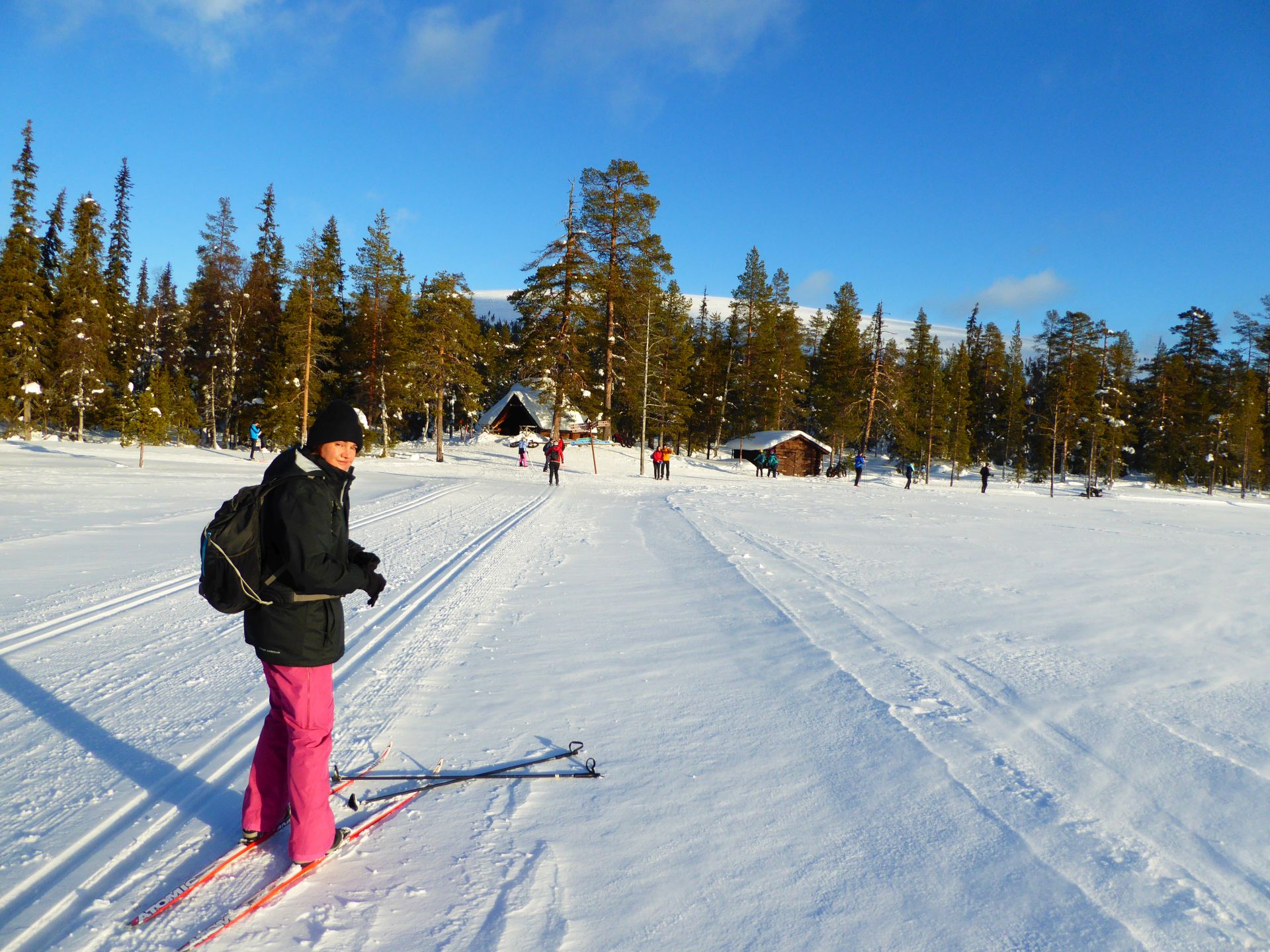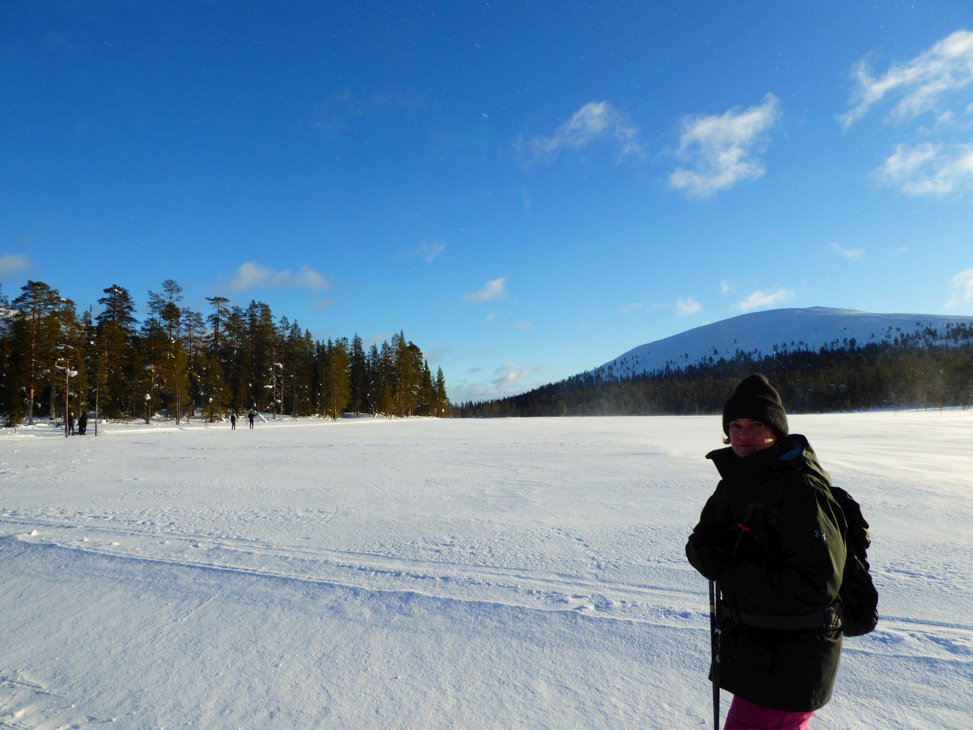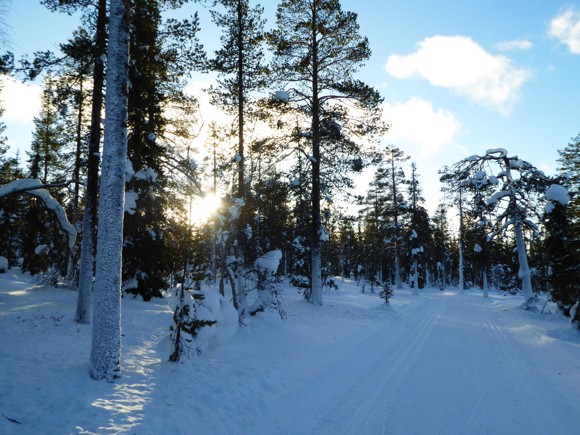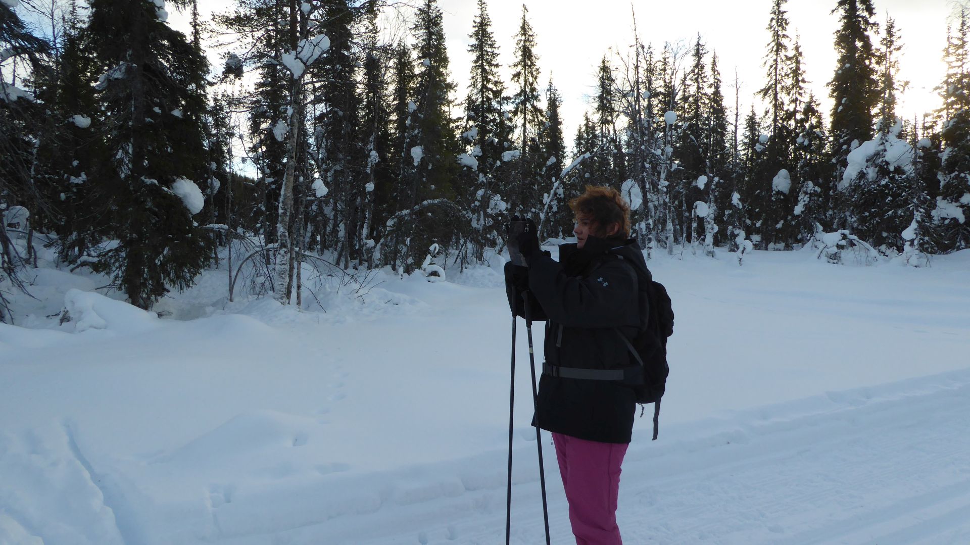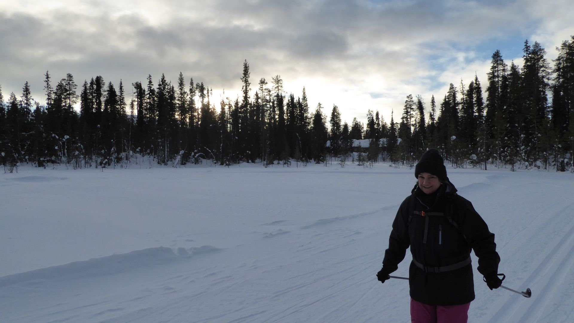 La météo annonce des éclaircies possible et surtout du vent assez fort. Nous optons pour une randonnée à ski de fonds dans le secteur Nord-Est d'Äkäslompolo. Nous laissons la voiture vers l'hôtel Äkäshotelli et prenons la direction du lac Kesänkijärvi pour une boucle d'une quinzaine de kilomètre nous menant au café "Navetta Galleria". Durant la randonnée, le vent se lève et par chance, le ciel nous offre de belles éclaircies.