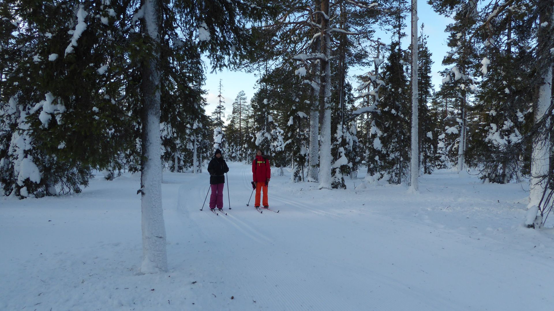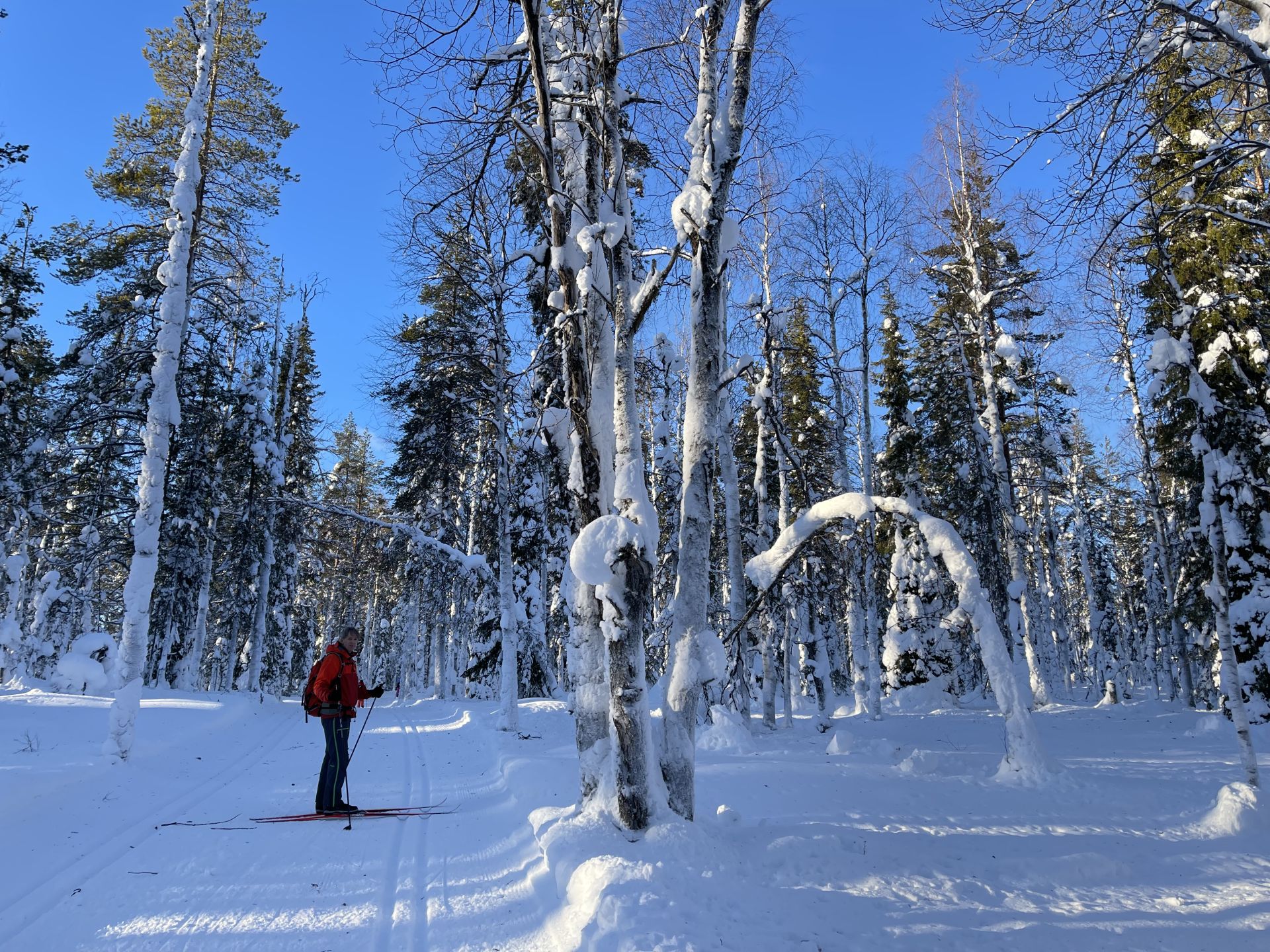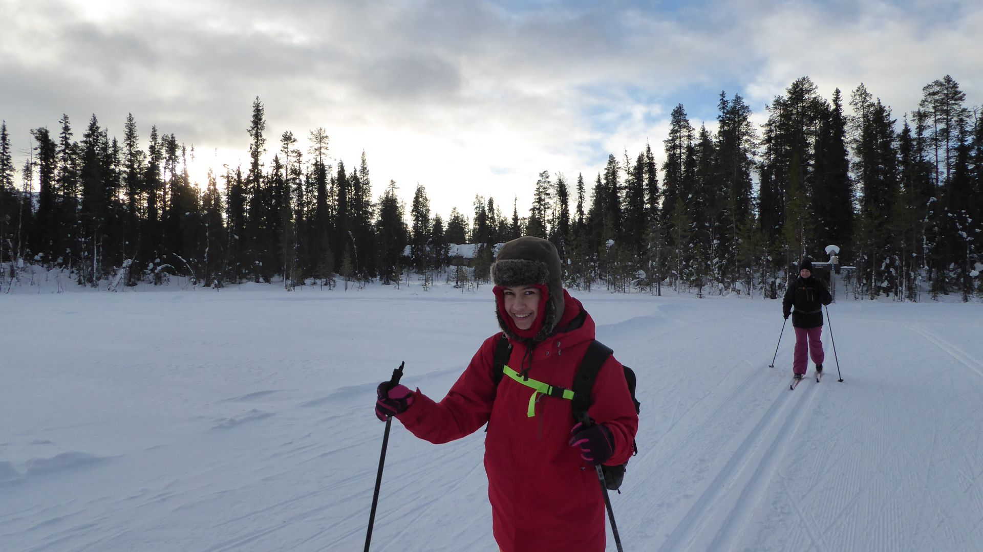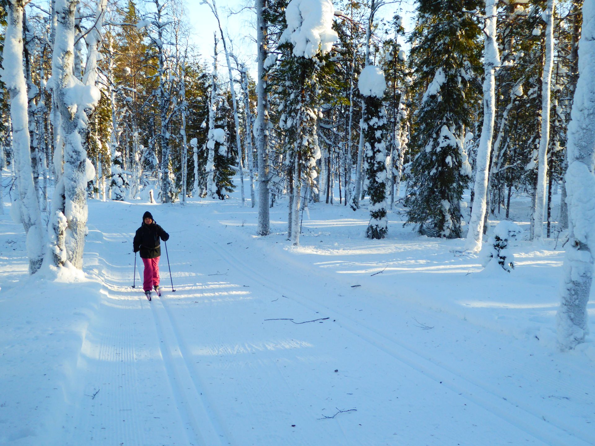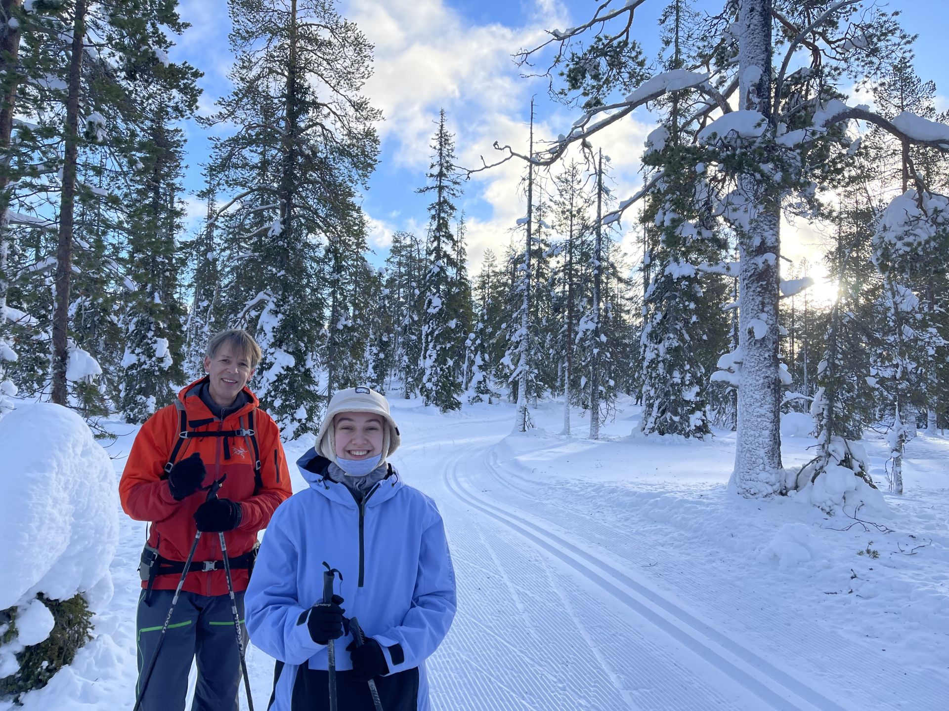 La météo annonce des éclaircies possible et surtout du vent assez fort. Nous optons pour une randonnée à ski de fonds dans le secteur Nord-Est d'Äkäslompolo. Nous laissons la voiture vers l'hôtel Äkäshotelli et prenons la direction du lac Kesänkijärvi pour une boucle d'une quinzaine de kilomètre nous menant au café "Navetta Galleria". Durant la randonnée, le vent se lève et par chance, le ciel nous offre de belles éclaircies.