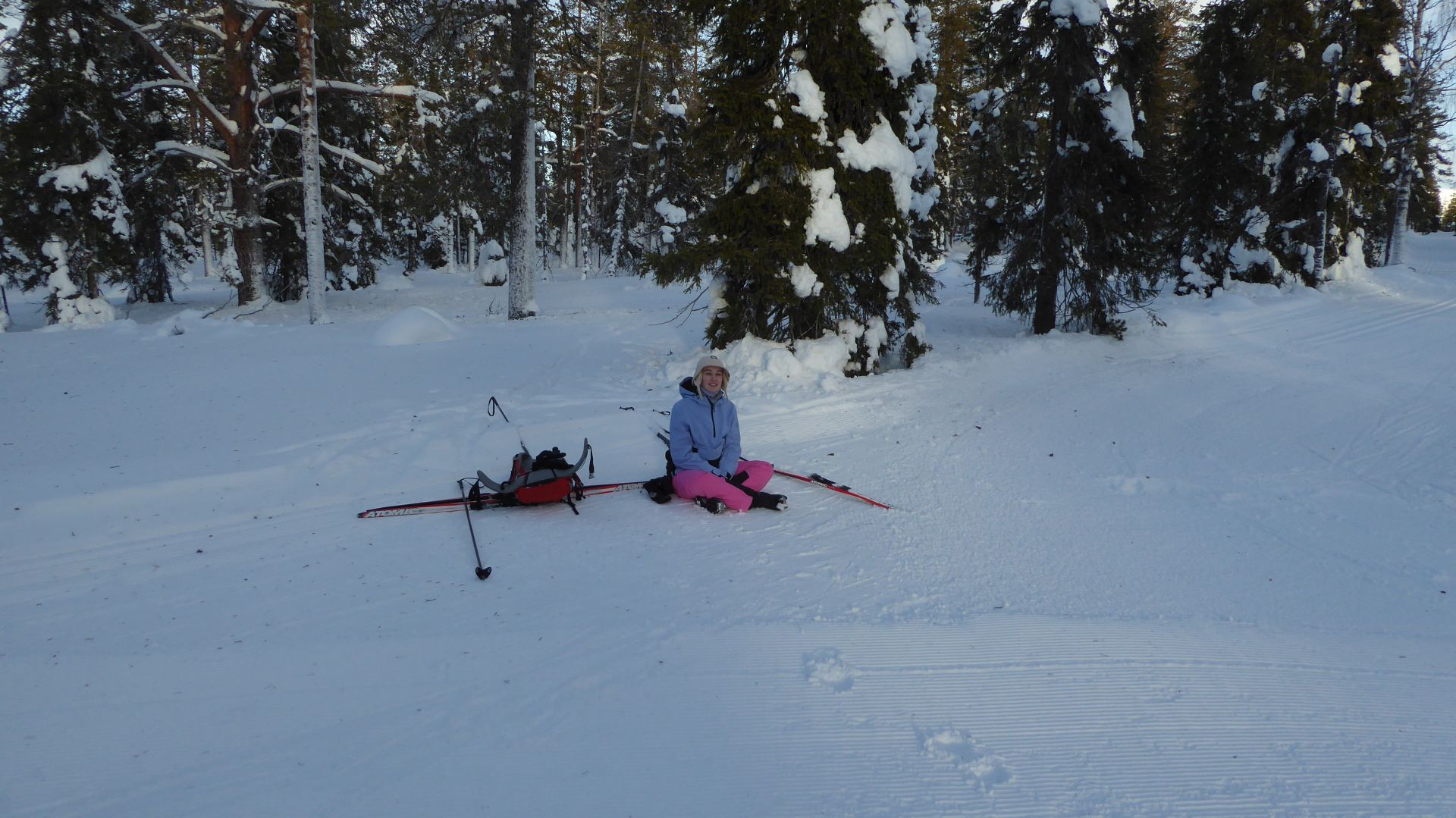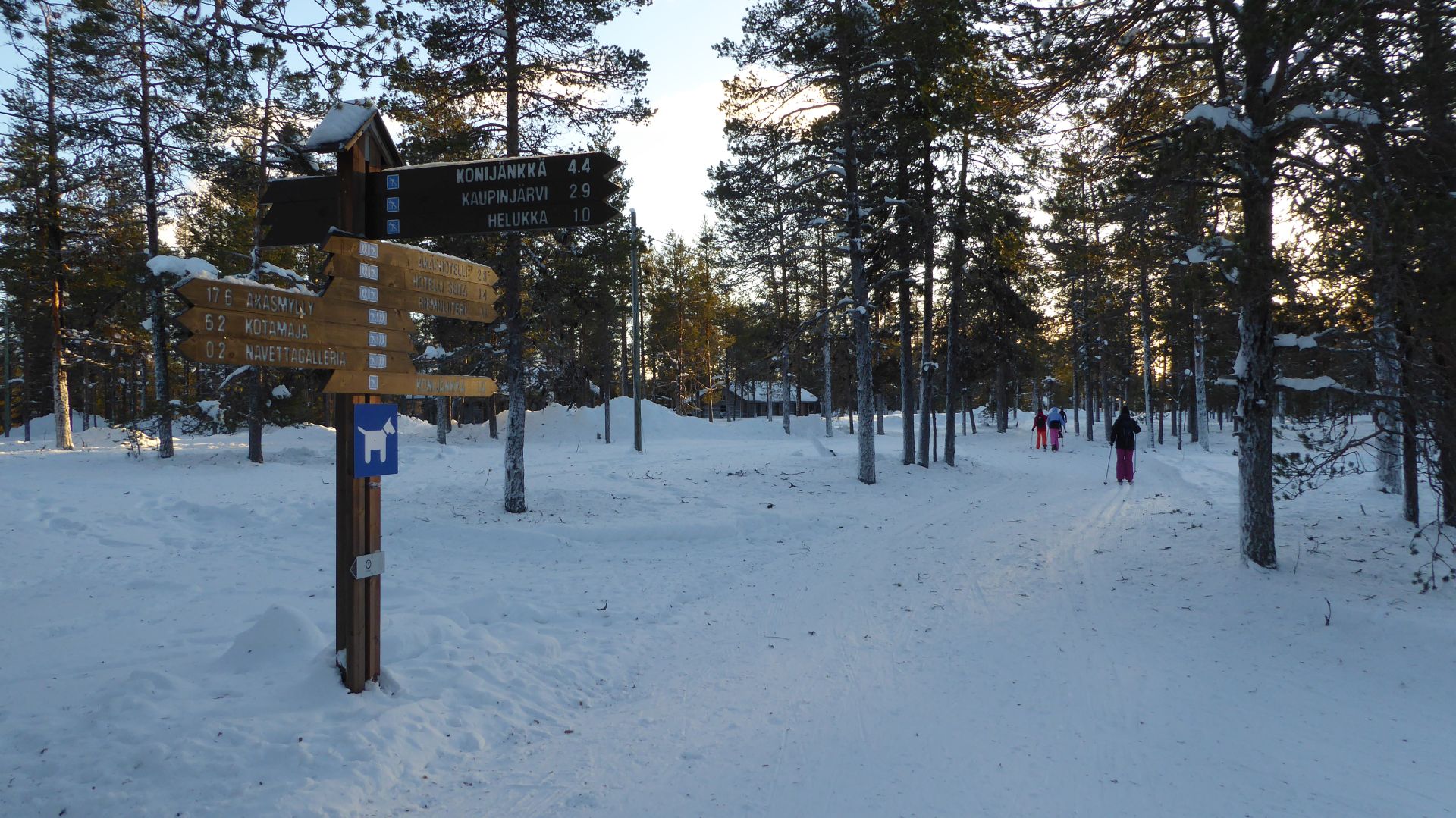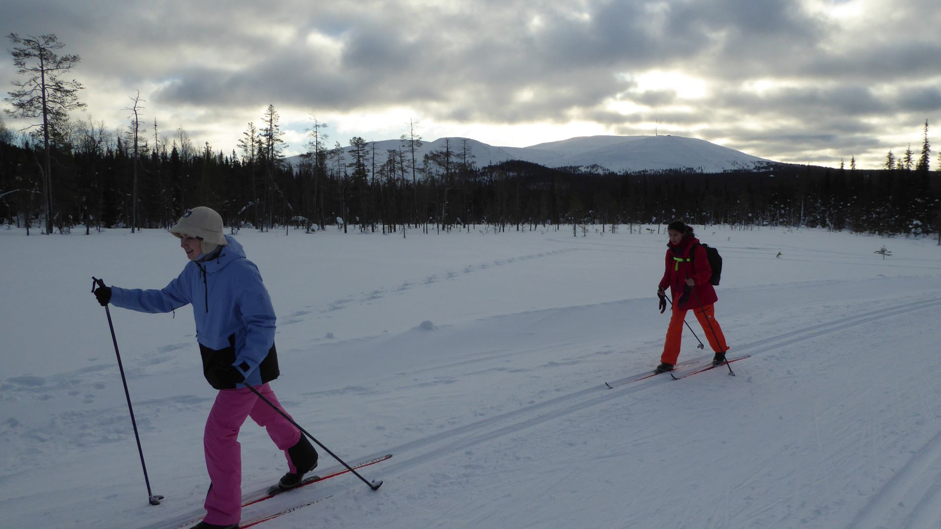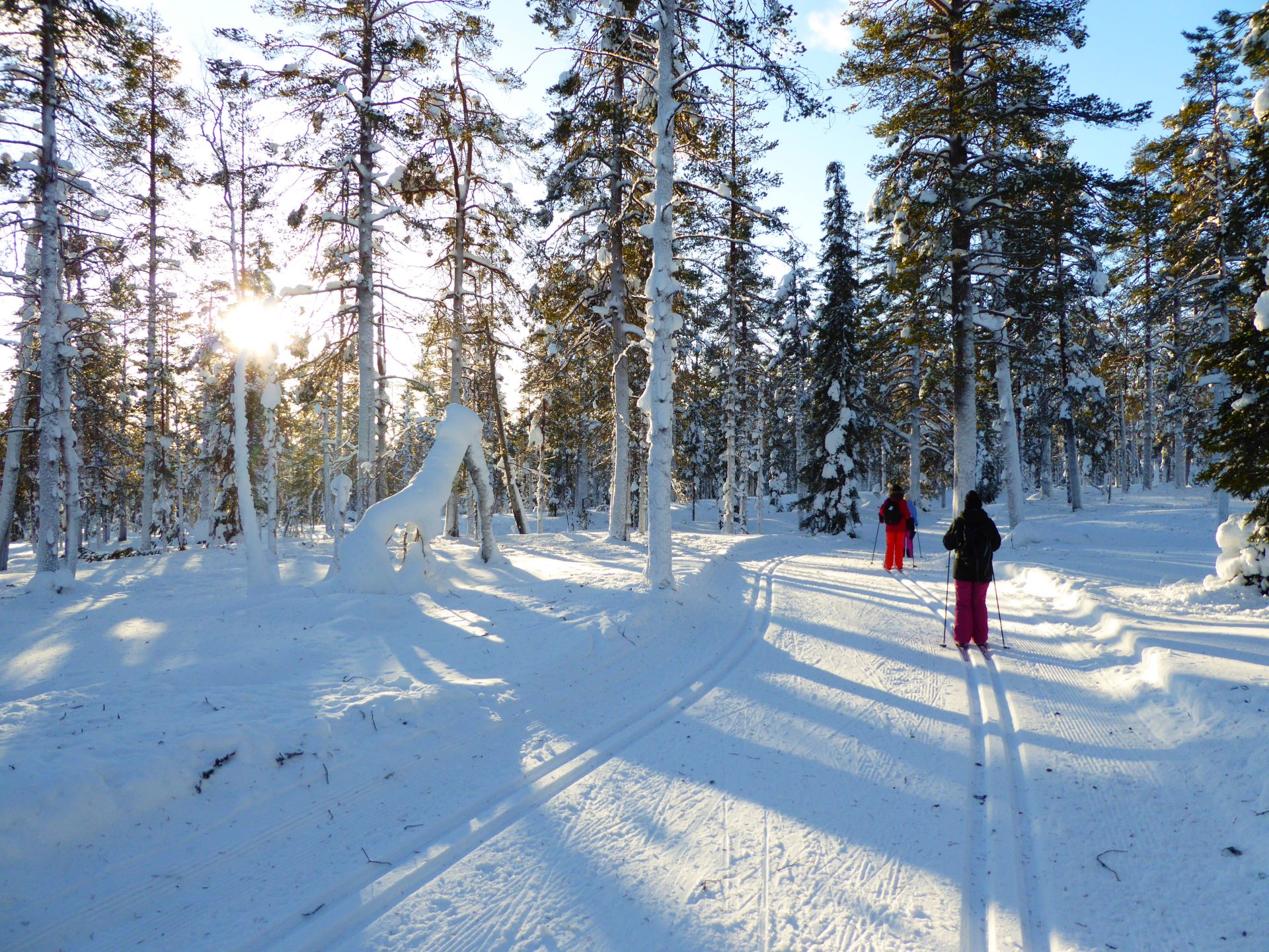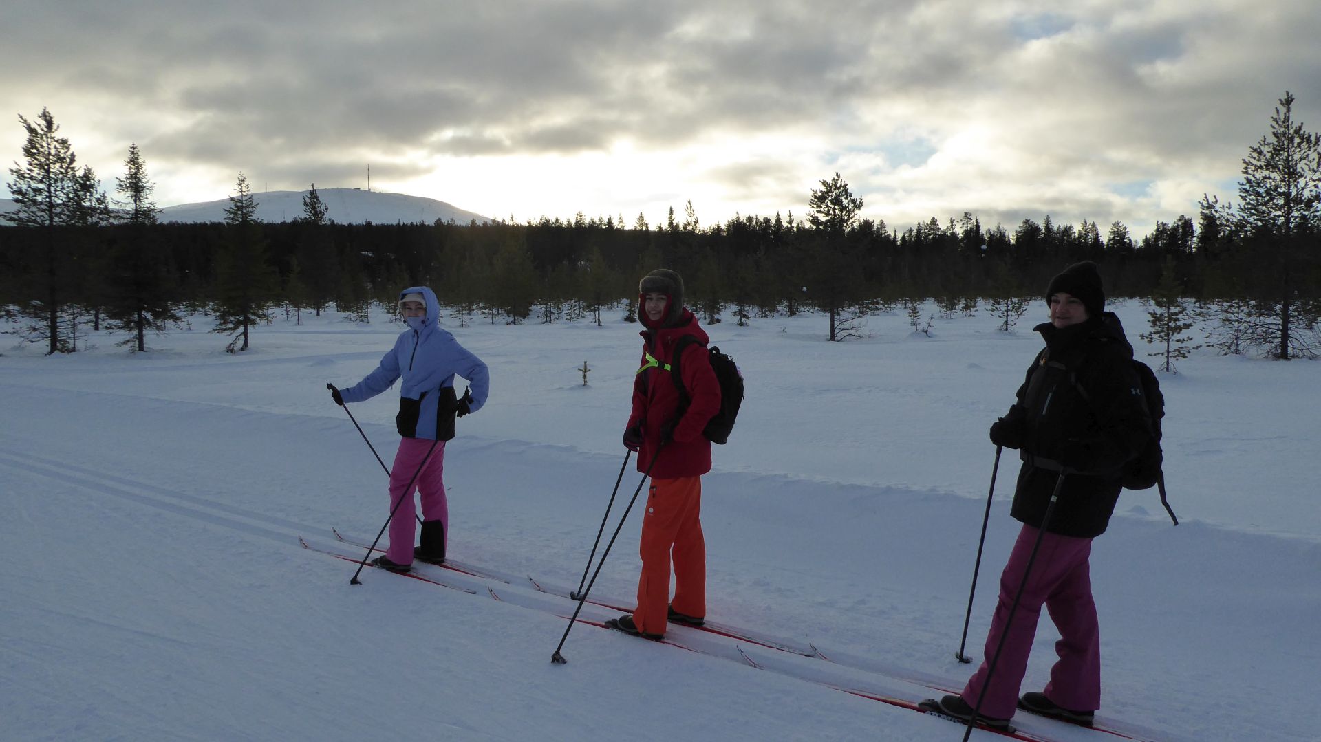 La météo annonce des éclaircies possible et surtout du vent assez fort. Nous optons pour une randonnée à ski de fonds dans le secteur Nord-Est d'Äkäslompolo. Nous laissons la voiture vers l'hôtel Äkäshotelli et prenons la direction du lac Kesänkijärvi pour une boucle d'une quinzaine de kilomètre nous menant au café "Navetta Galleria". Durant la randonnée, le vent se lève et par chance, le ciel nous offre de belles éclaircies.