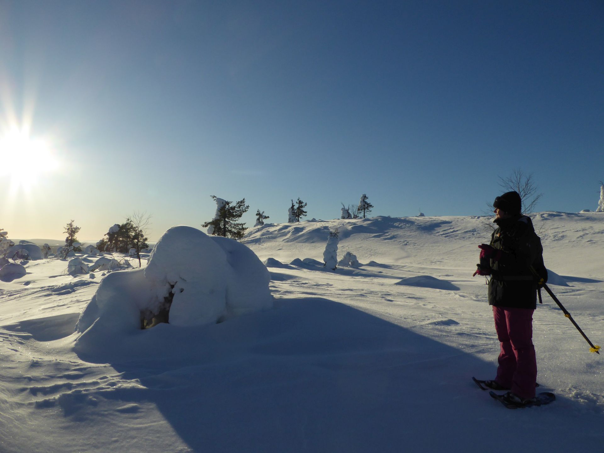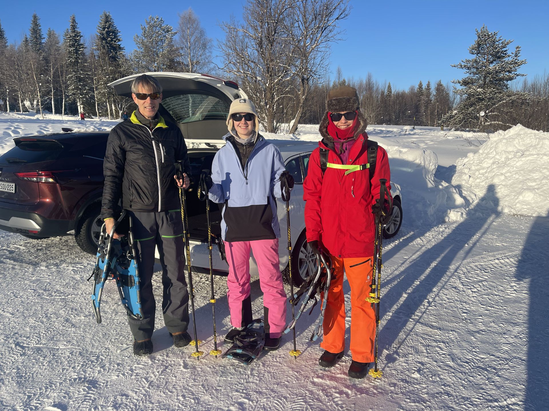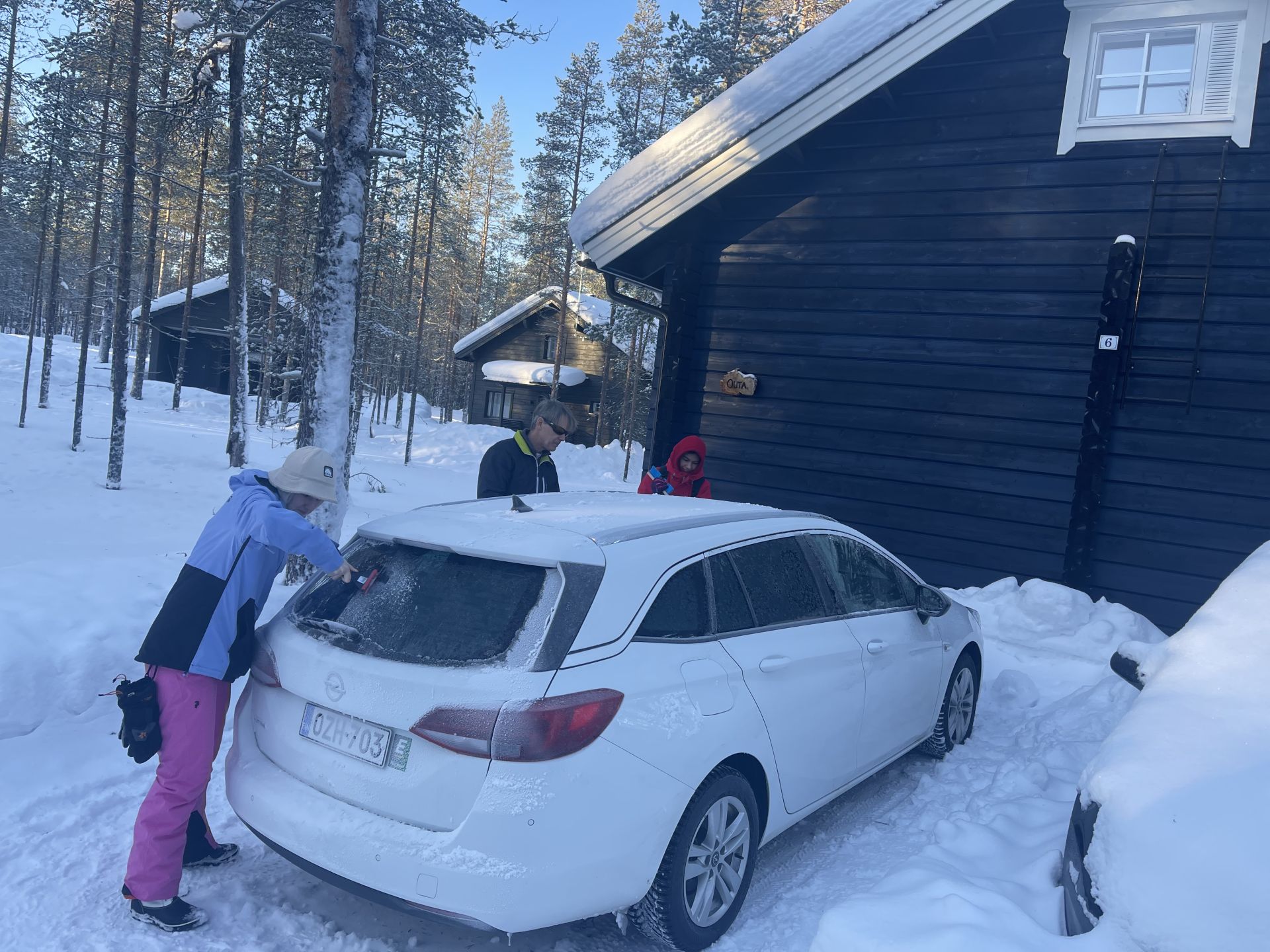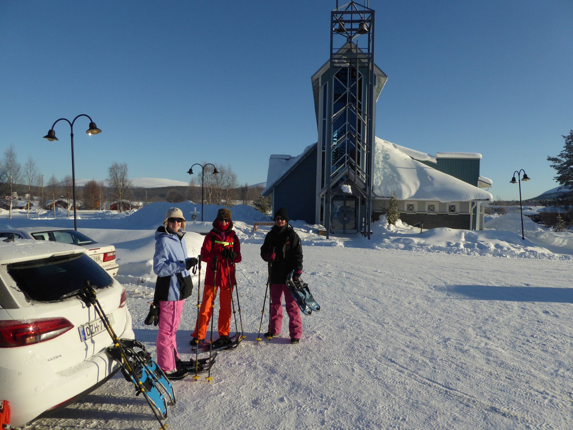 Il fait un peu plus frais ce matin (-5°) et la voiture est toute givrée. Malgré le grand ciel bleu, il est 10h et la luminosité reste basse. Le soleil est levé depuis plus d'une heure et demi, mais il est toujours très bas sur l'horizon. Notre chalet est encore dans l'ombre "matinale" et nous avons de la peine à nous rendre compte de l'heure. Nous prenons un petit-déjeuner copieux (avec des oeufs au plat) puis nous embarquons notre matériel dans la voiture pour nous rendre à ~4km de là vers l'église bleu, point de départ de la montée au Kuer.