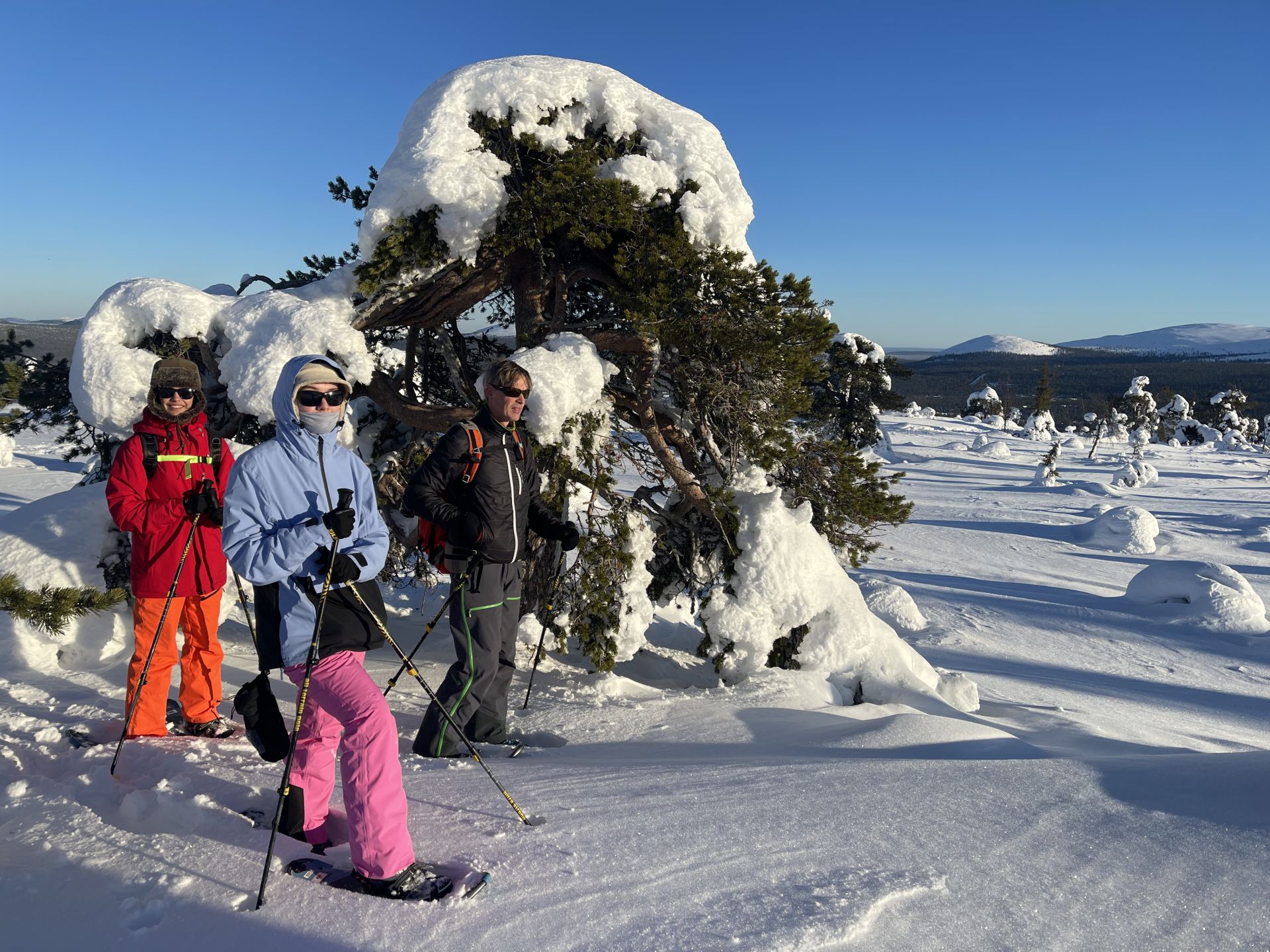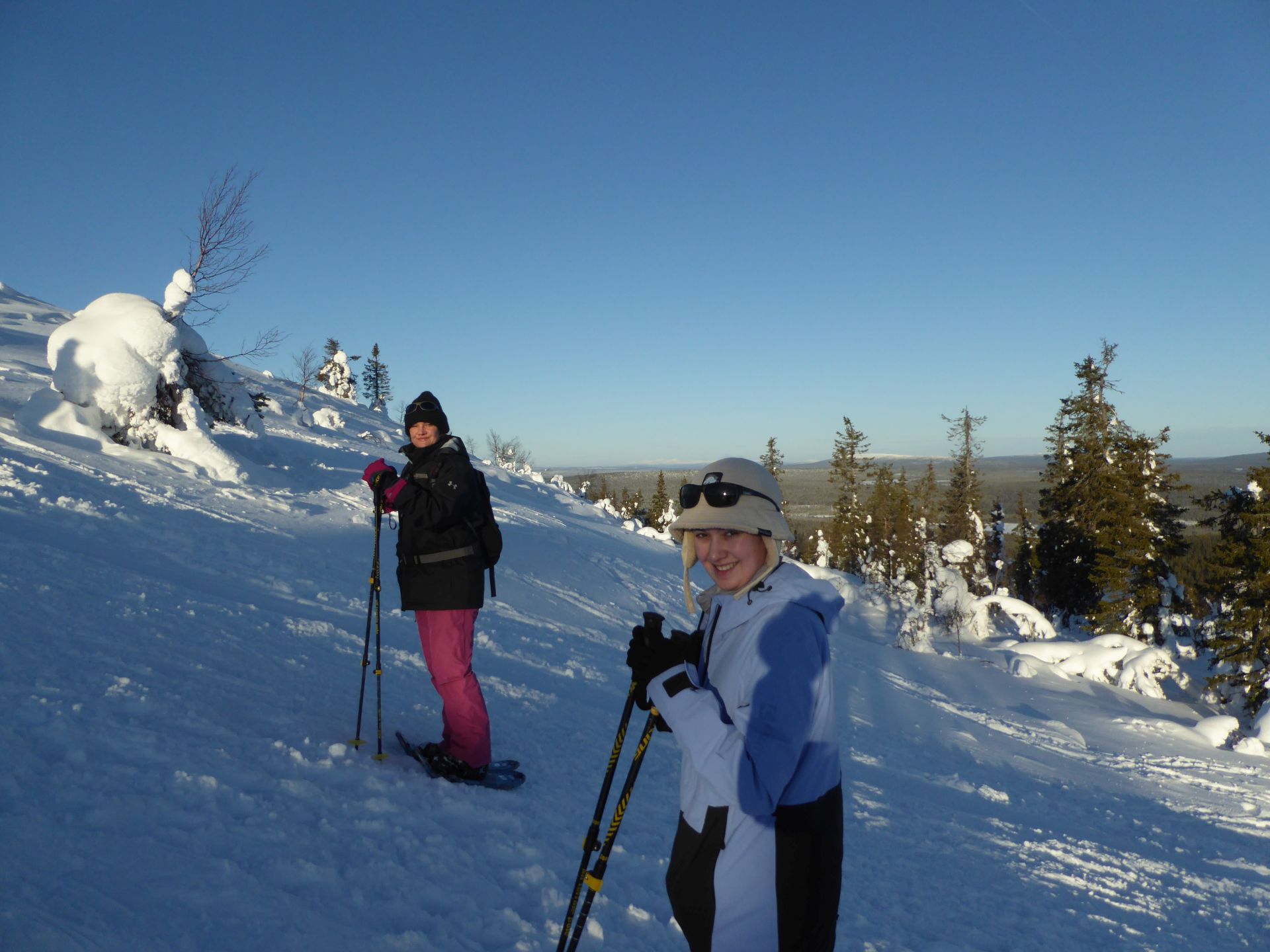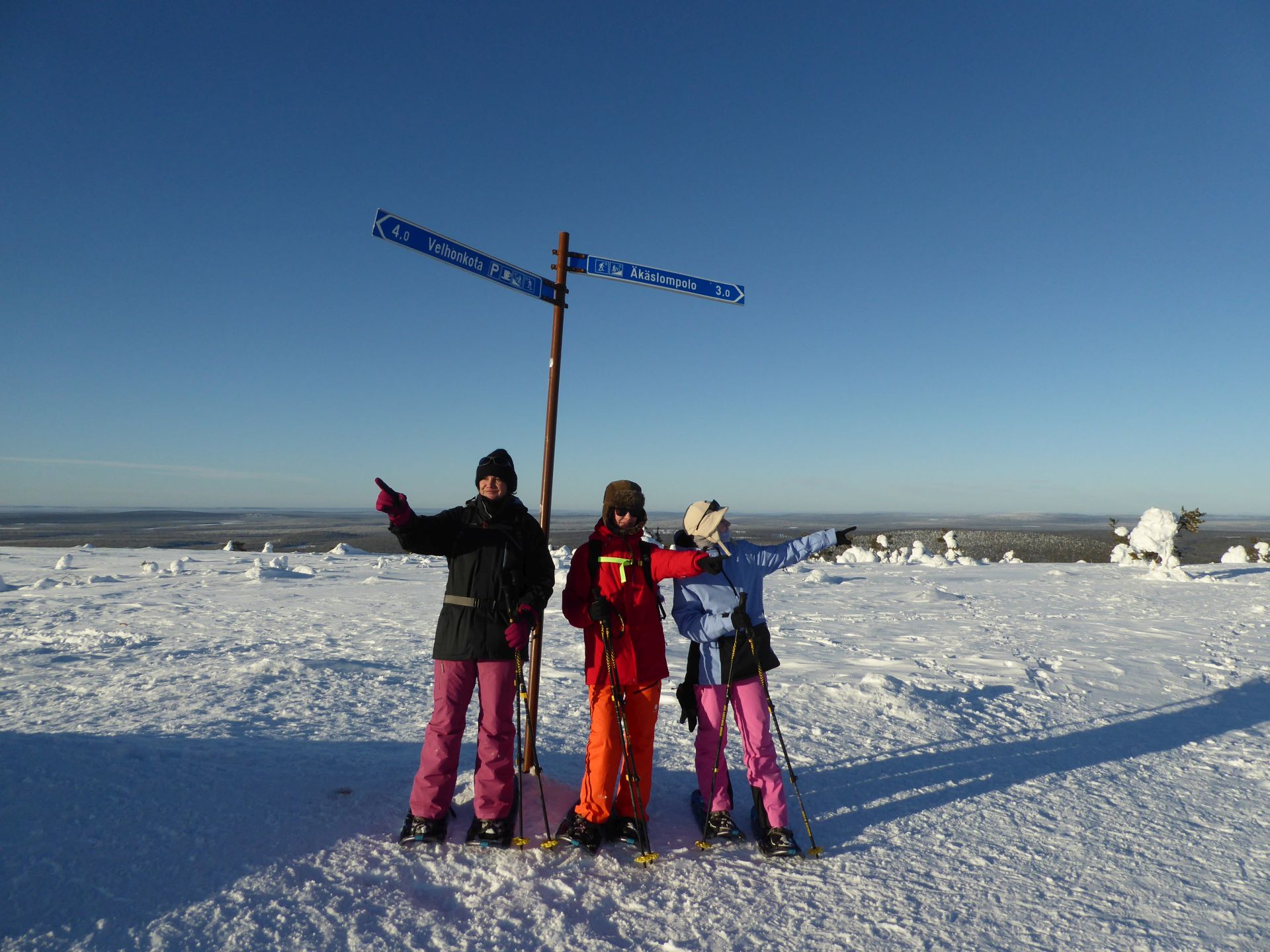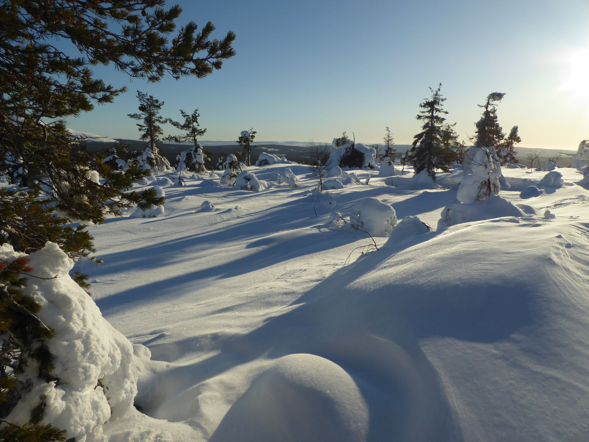 Il fait un peu plus frais ce matin (-5°) et la voiture est toute givrée. Malgré le grand ciel bleu, il est 10h et la luminosité reste basse. Le soleil est levé depuis plus d'une heure et demi, mais il est toujours très bas sur l'horizon. Notre chalet est encore dans l'ombre "matinale" et nous avons de la peine à nous rendre compte de l'heure. Nous prenons un petit-déjeuner copieux (avec des oeufs au plat) puis nous embarquons notre matériel dans la voiture pour nous rendre à ~4km de là vers l'église bleu, point de départ de la montée au Kuer.