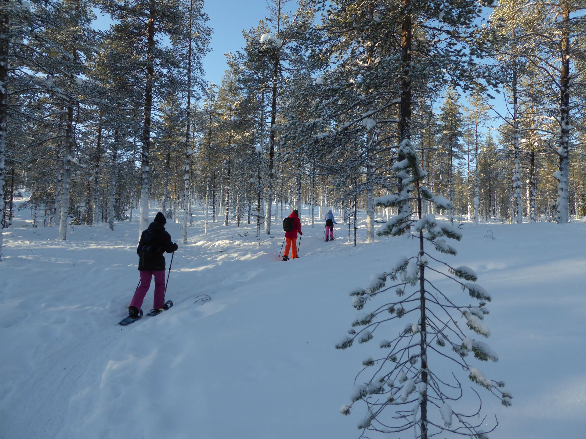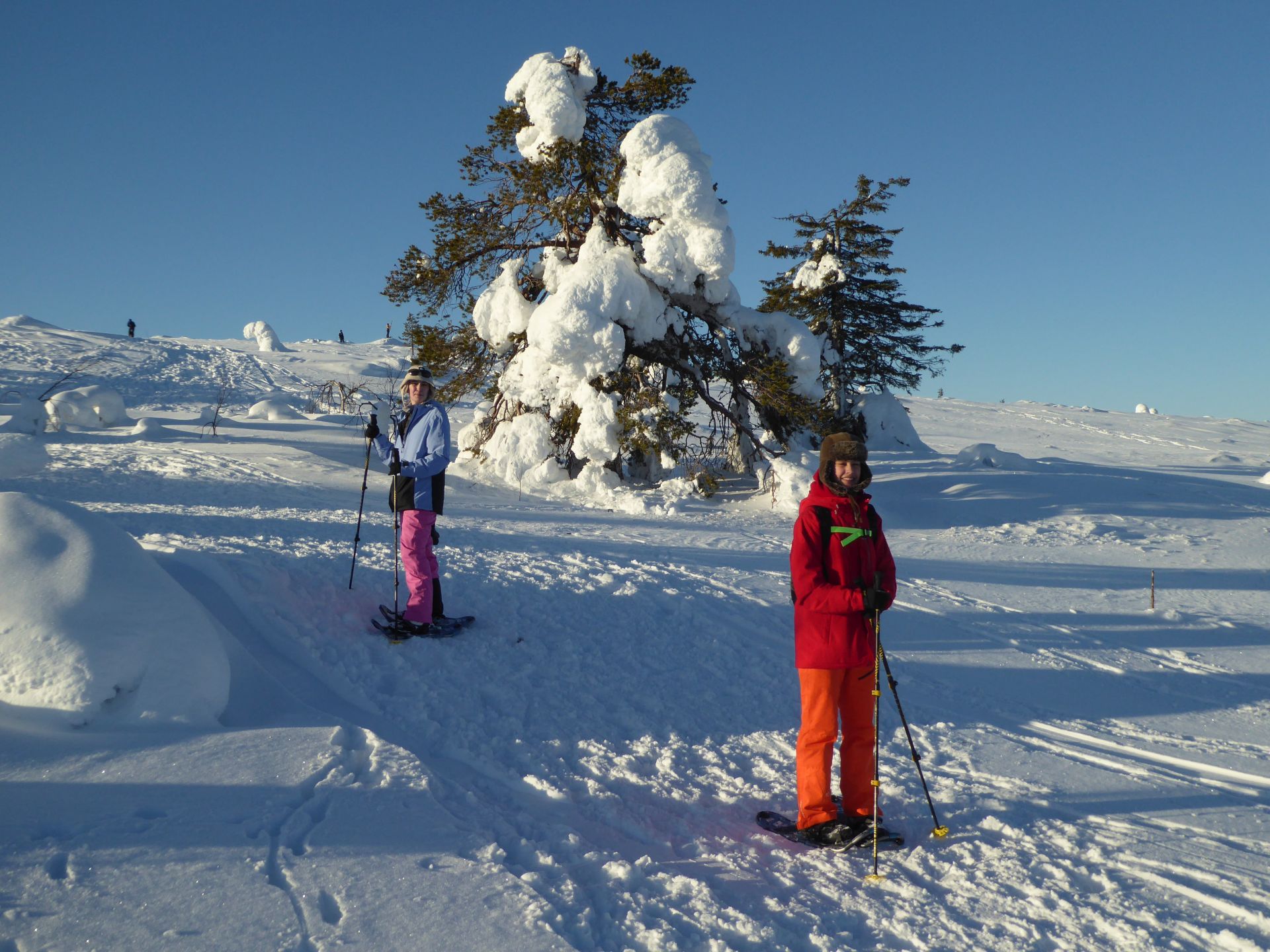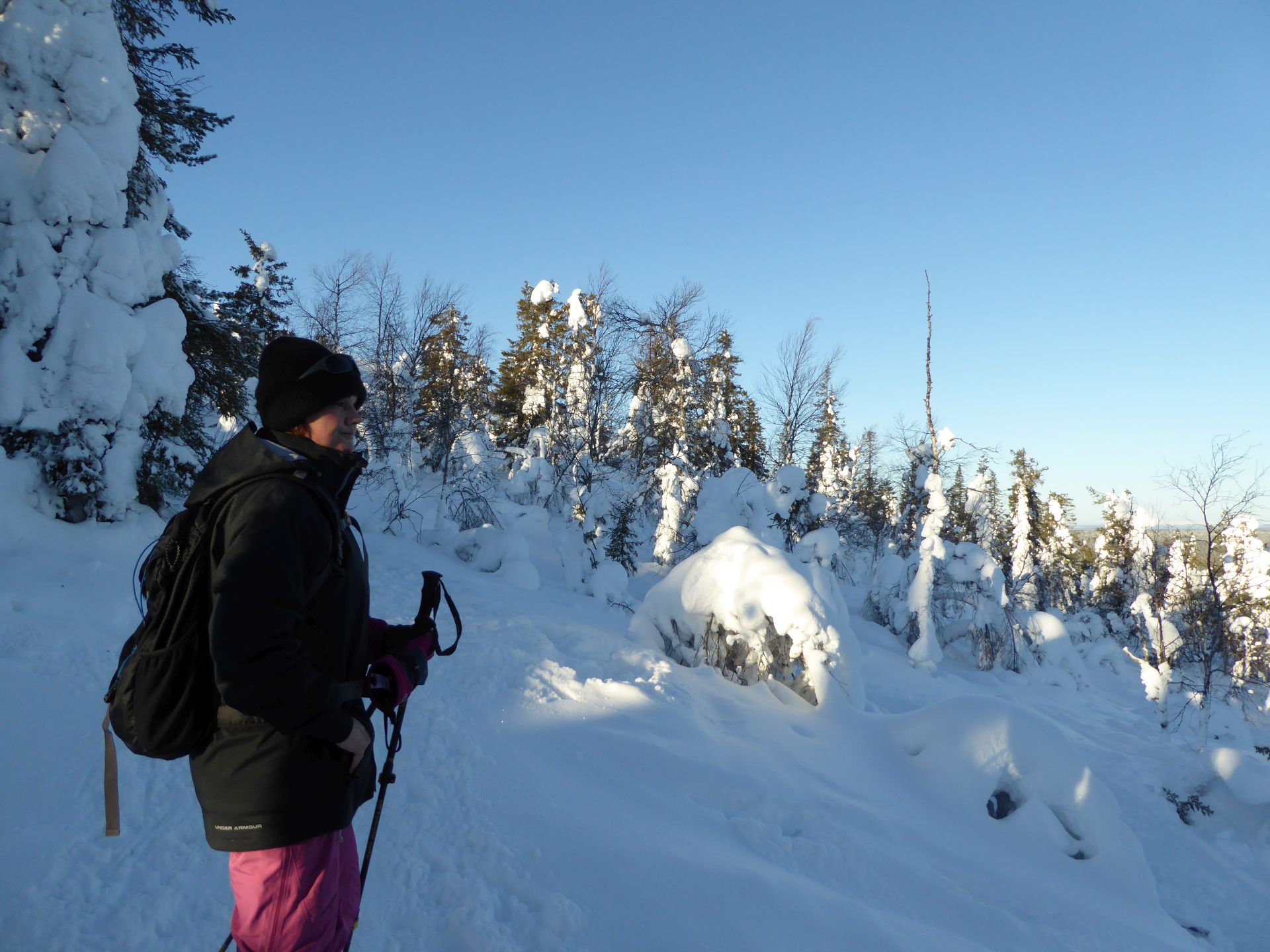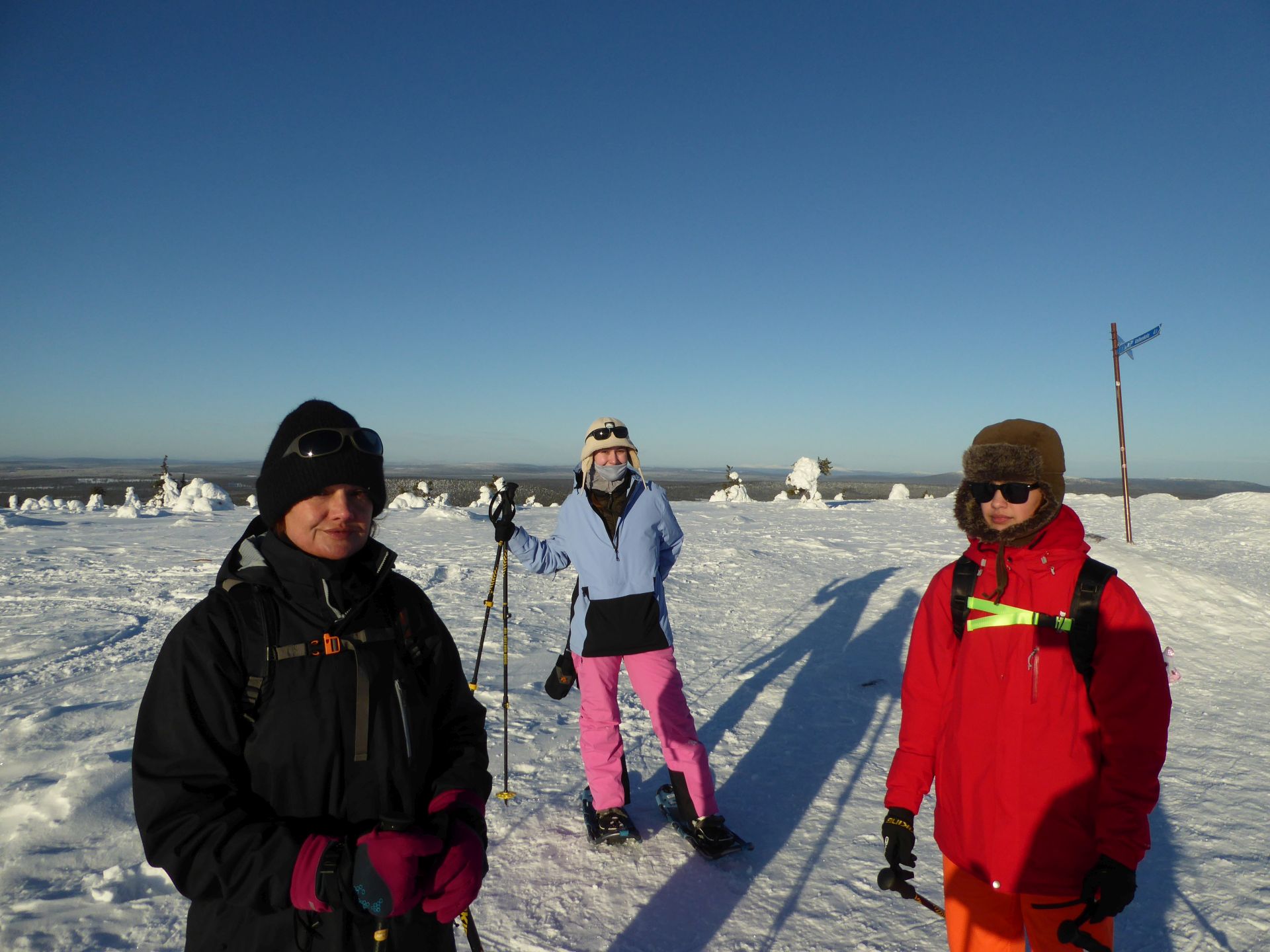 Nous empruntons la piste balisée et bien tassée en direction du sommet en hésitant à laisser nos raquettes à neige dans la voiture. Plusieurs randonneurs passent à proximité et sont à pied. Finalement, nous choisissons de les prendre avec nous et après quelques centaines de mètres nous décidons de nous équiper. Finalement c'était un bon choix. Les raquettes sont très agréable, légère et les crampons intégrés nous évitent de glisser dans les passages un plus raide.