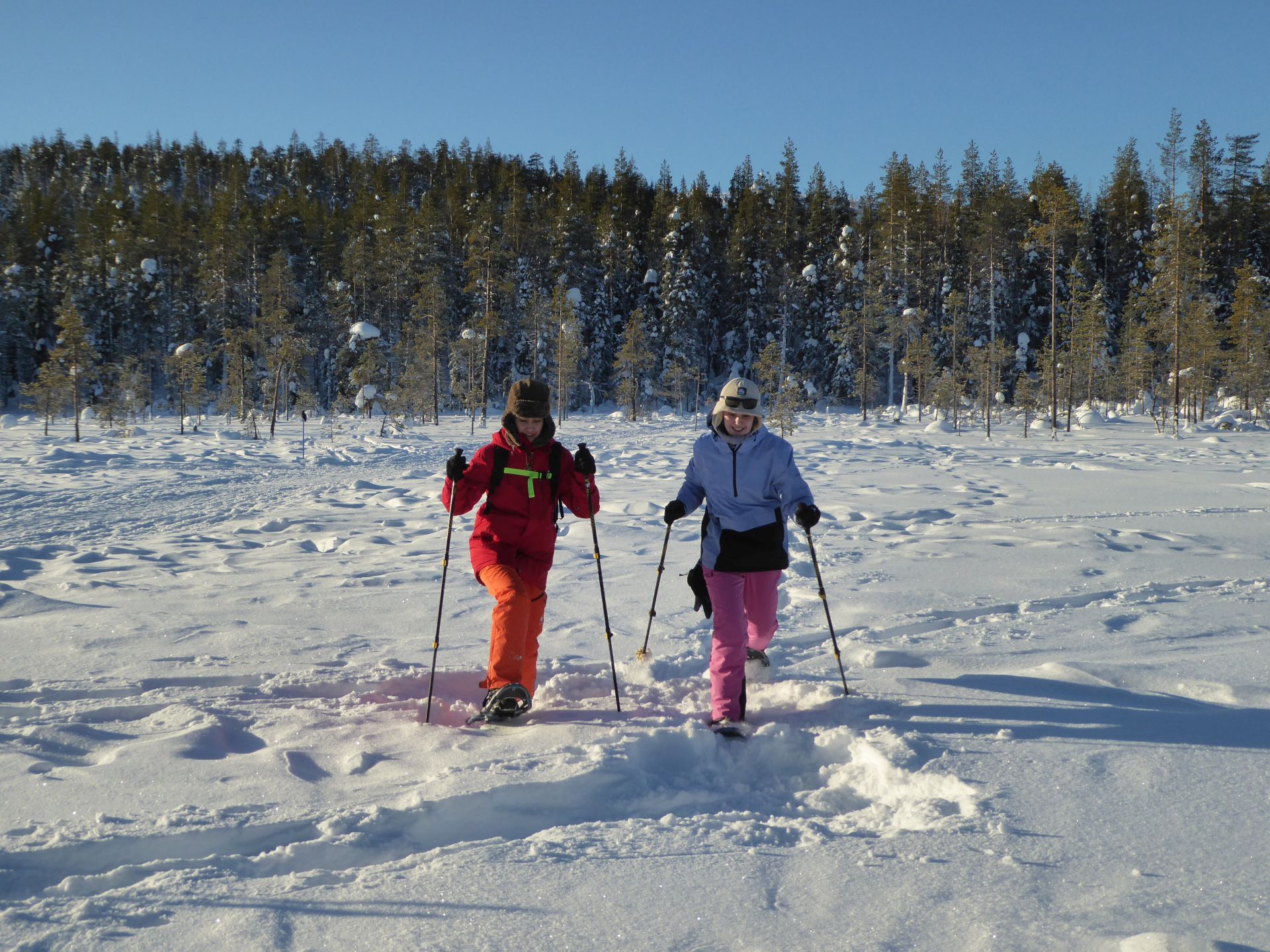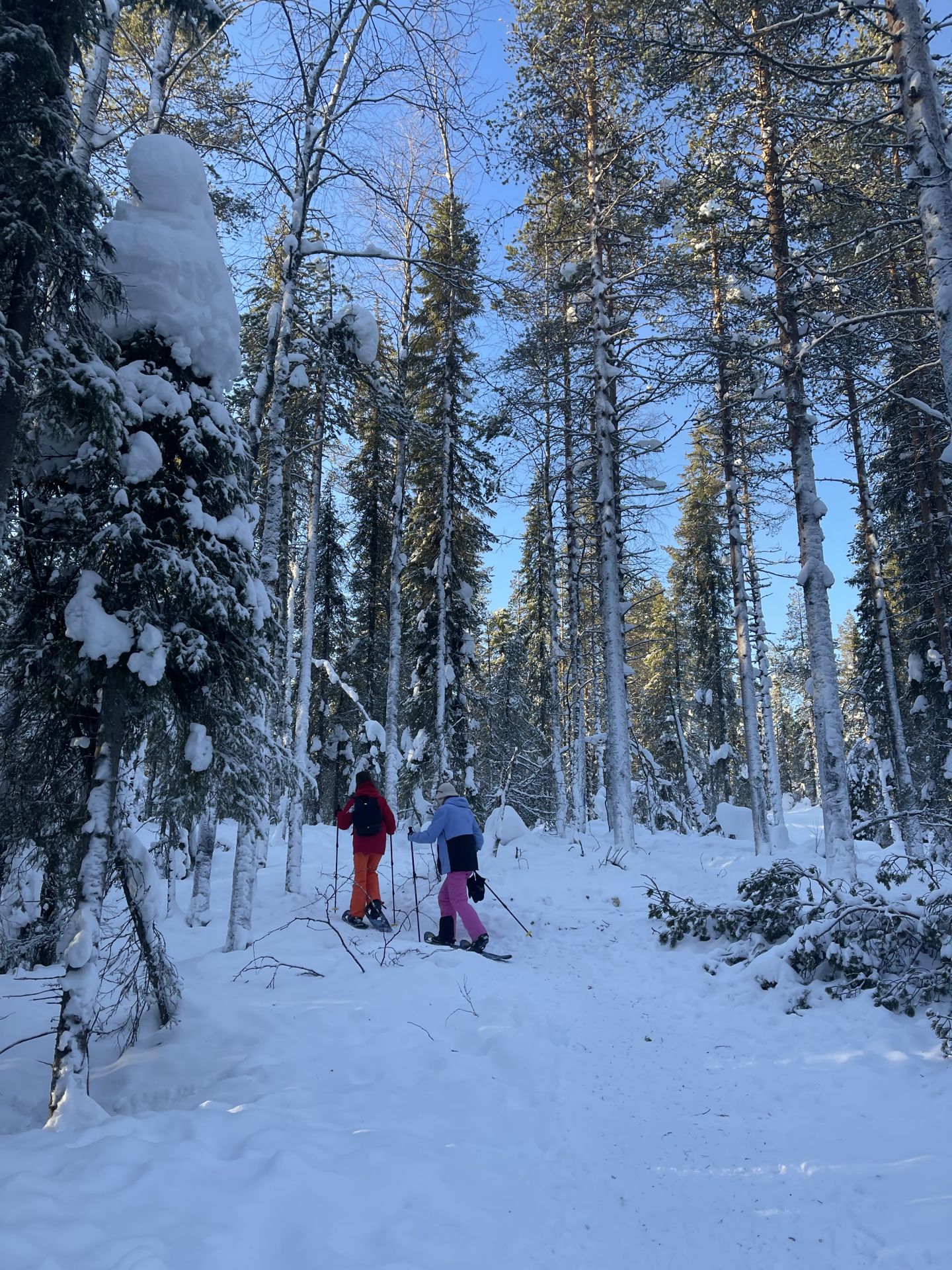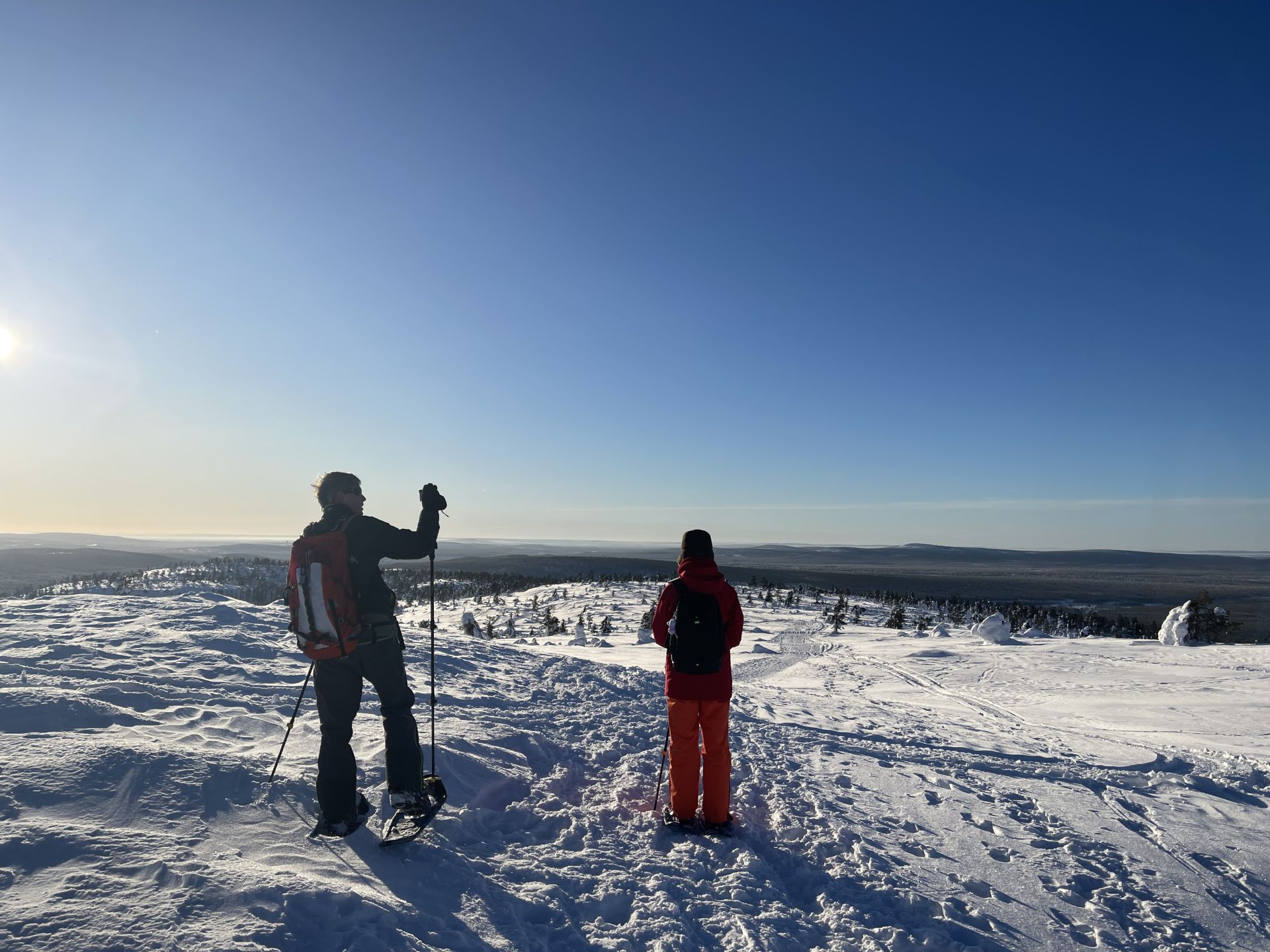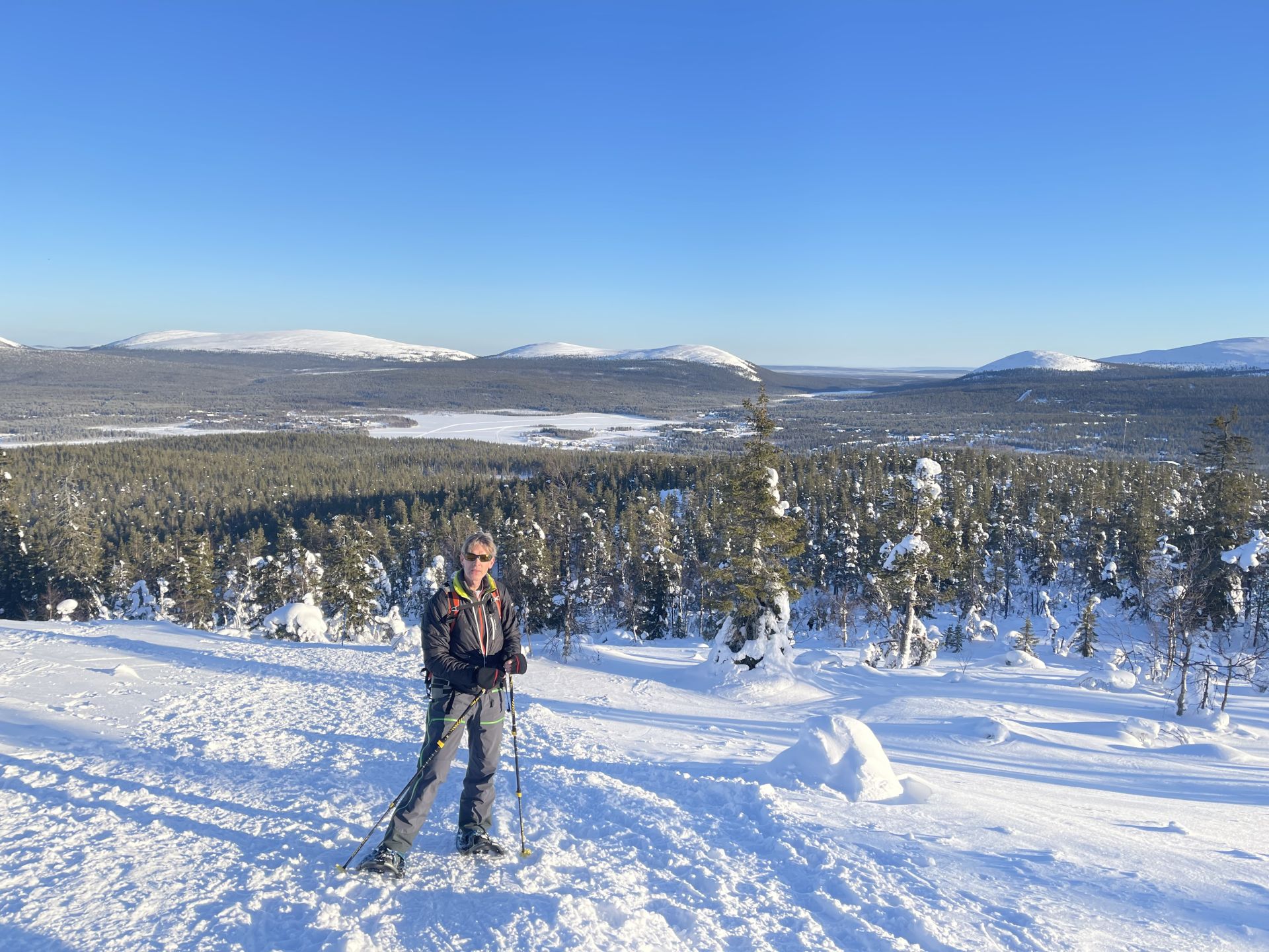 Nous empruntons la piste balisée et bien tassée en direction du sommet en hésitant à laisser nos raquettes à neige dans la voiture. Plusieurs randonneurs passent à proximité et sont à pied. Finalement, nous choisissons de les prendre avec nous et après quelques centaines de mètres nous décidons de nous équiper. Finalement c'était un bon choix. Les raquettes sont très agréable, légère et les crampons intégrés nous évitent de glisser dans les passages un plus raide.
