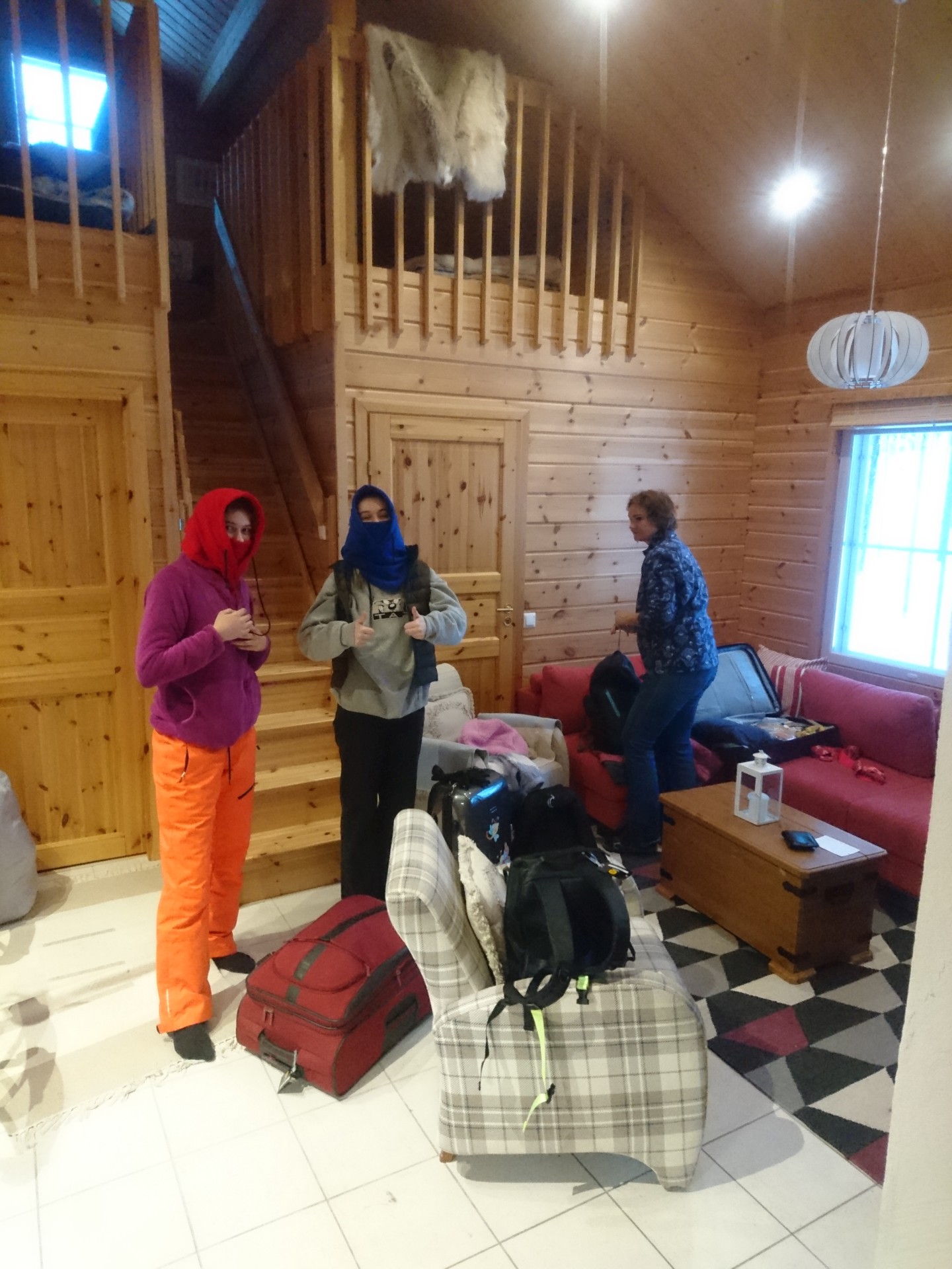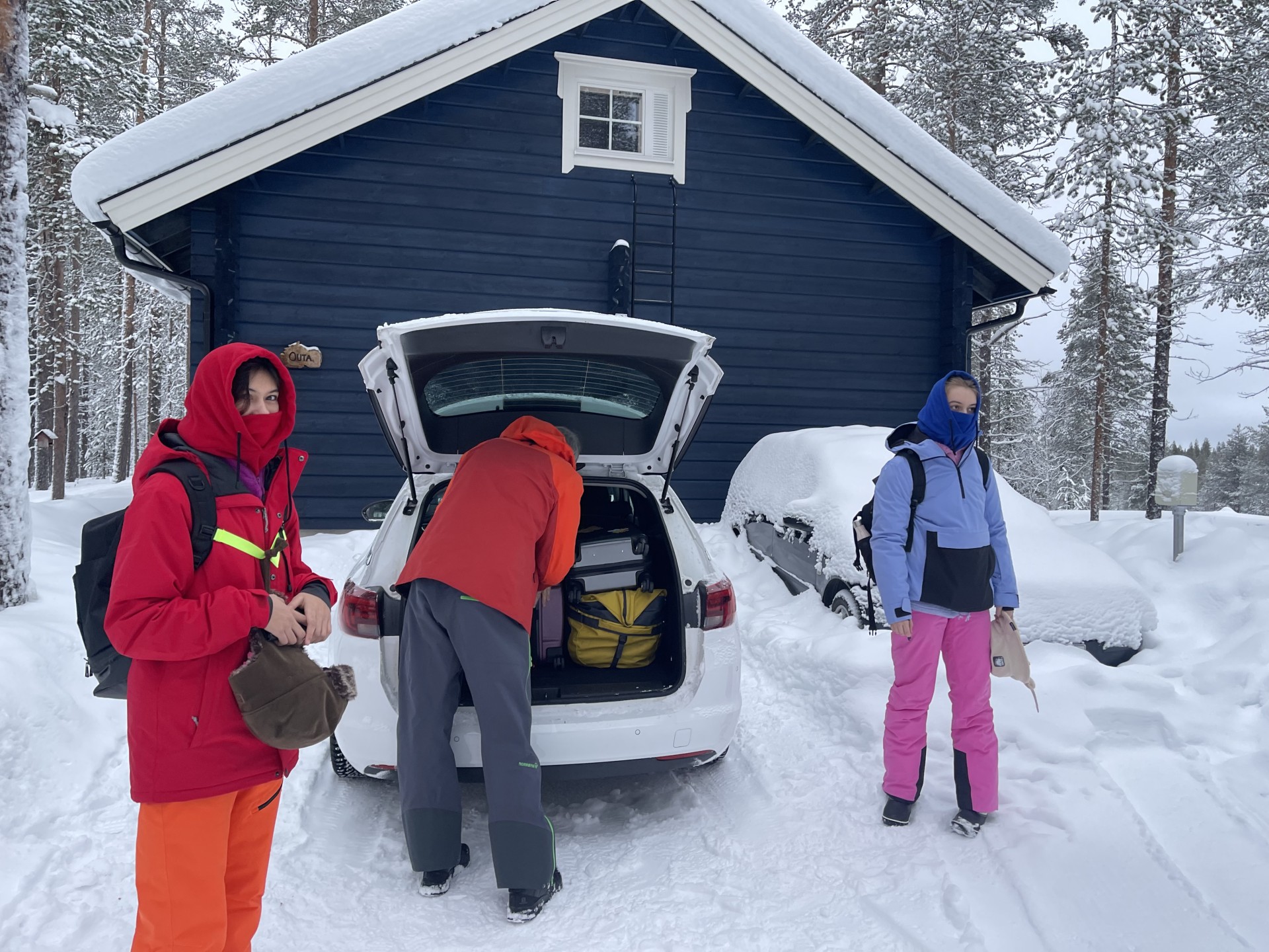 Les bagages étant déjà partiellement prêts depuis la veille, nous nous levons à un peu avant 8h. Comme il nous reste du pain, de la pâte à tartiner au chocolat, 2 thermos de thé chaud déja tout prêt et que le choix de croissants du café Routa est... inexistant, nous décidons de manger tranquillement dans notre chalet avant de boucler nos bagages, de bien nous habiller et de prendre la route en direction du Snow Village.