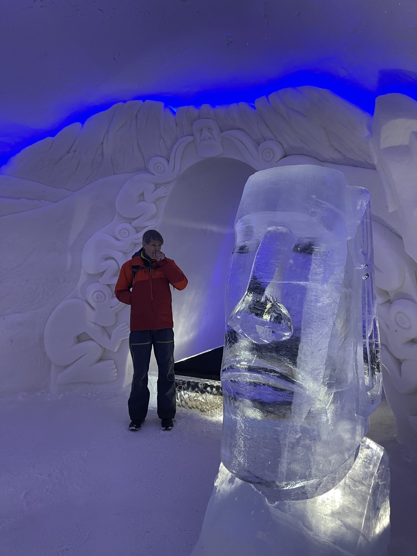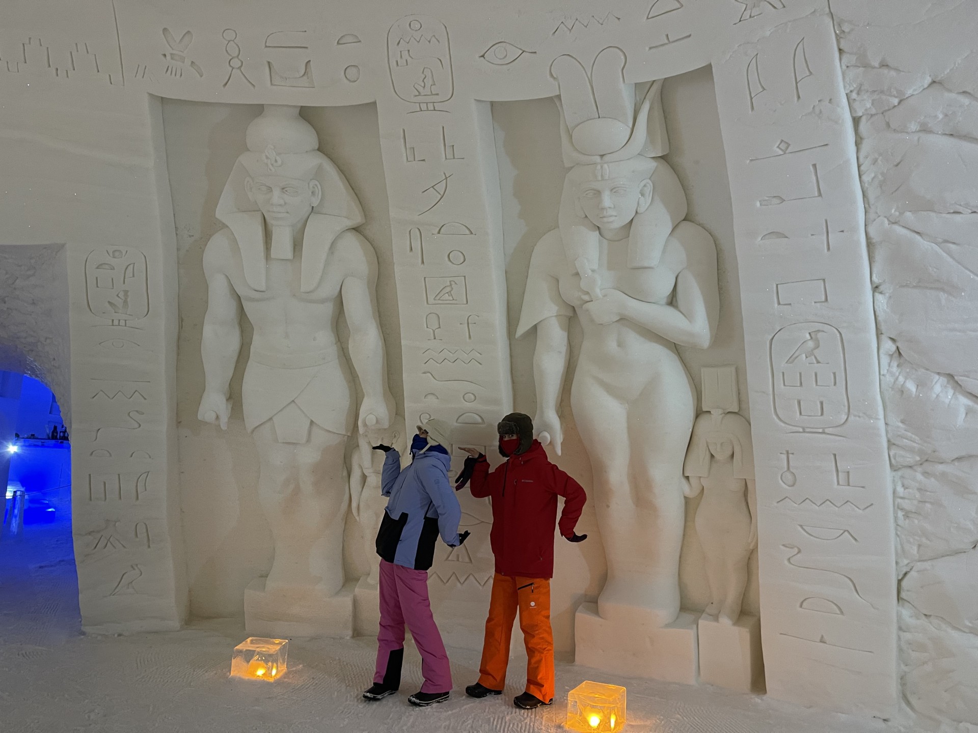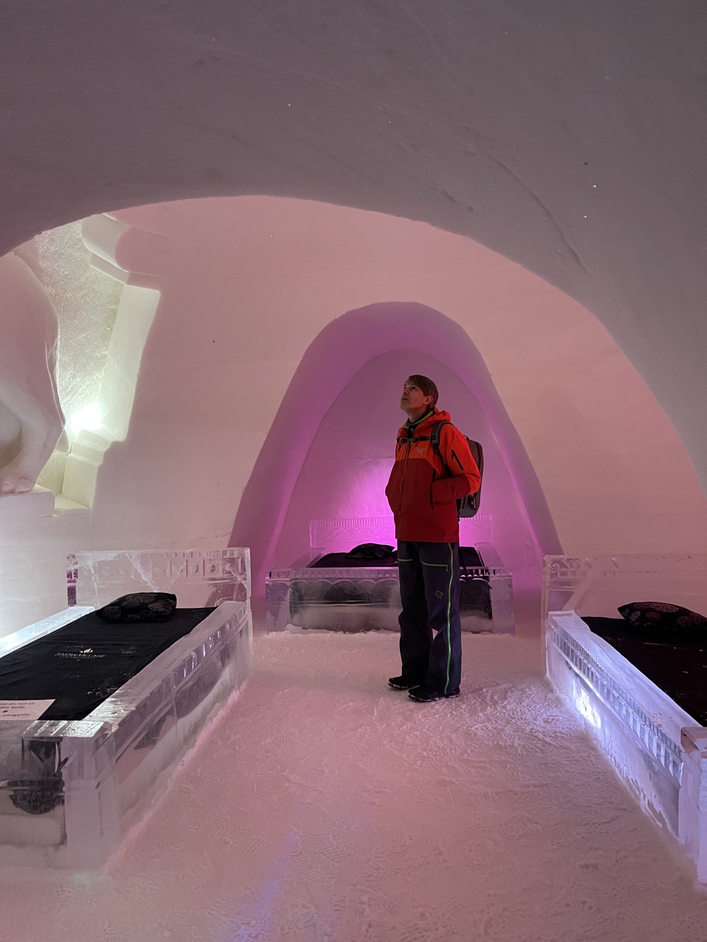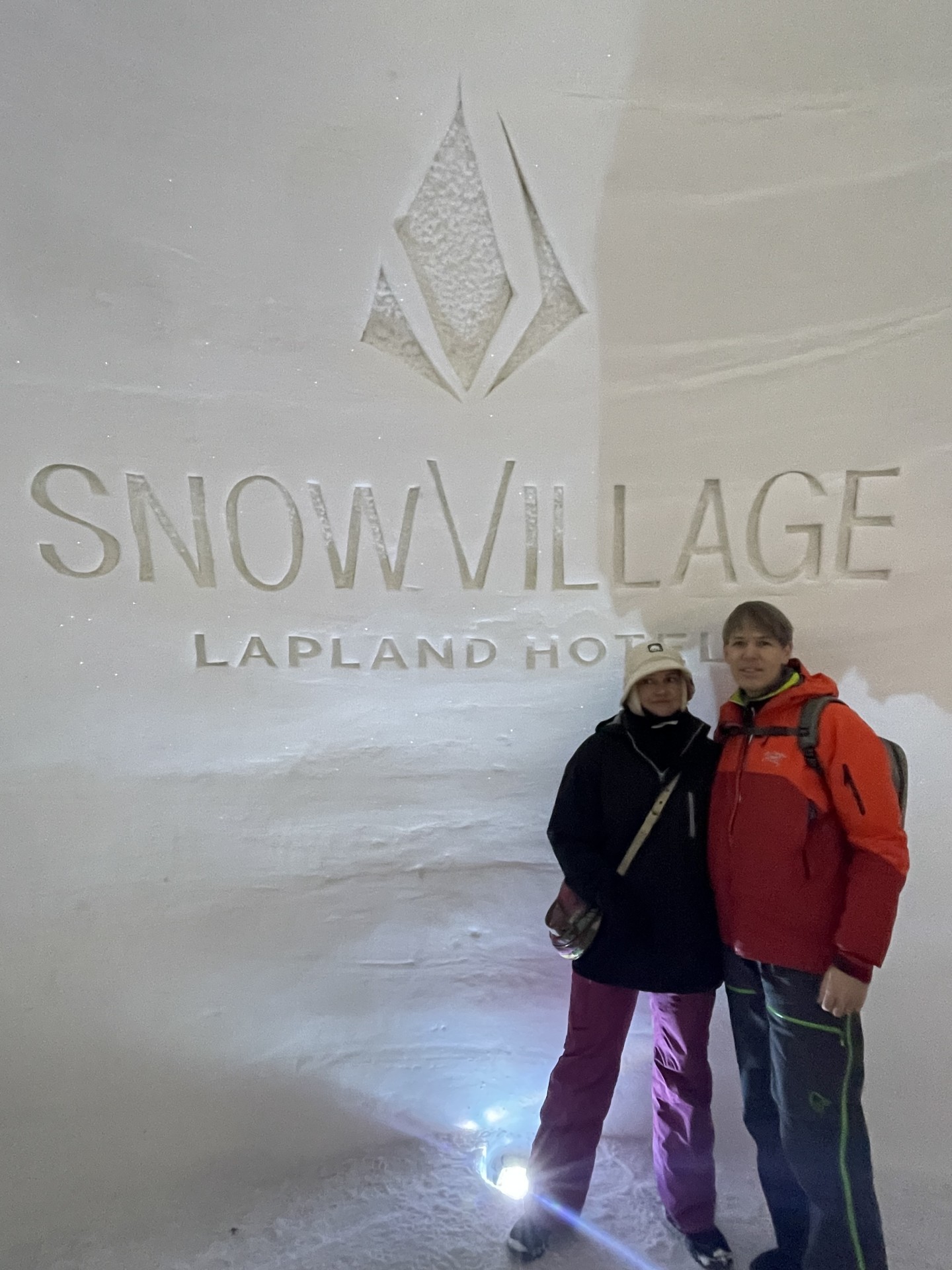 Nous arrivons au Lapland Hotels Snow Village peu après 10h et par chance avant les 8 auto-cars bondés qui font aussi une halte dans cet endroit particulier durant leur trajet vers l'aéroport. Le Snow Village est une série d'igloo interconnectés et reconstruits chaque année en couvrant de neige des structures gonflable organisées en groupes de 4 à 5 "petits" igloos (chambres) répartis autour d'un grand igloo (lobby). L'intérieur des igloos est ensuite décoré avec des sculptures de glace et des bas-reliefs inspirés d'une thématique variant d'une année à l'autre. Pour la saison 2022-2023, le thème est "World's best-known attractions" (Les attractions touristiques les plus connues du monde). Durant la journée, le "village" est ouvert au visite par le grand public, puis se transforme pour la nuit en hôtel avec plus de 15 suites de 2 à 5 places très fraîches...