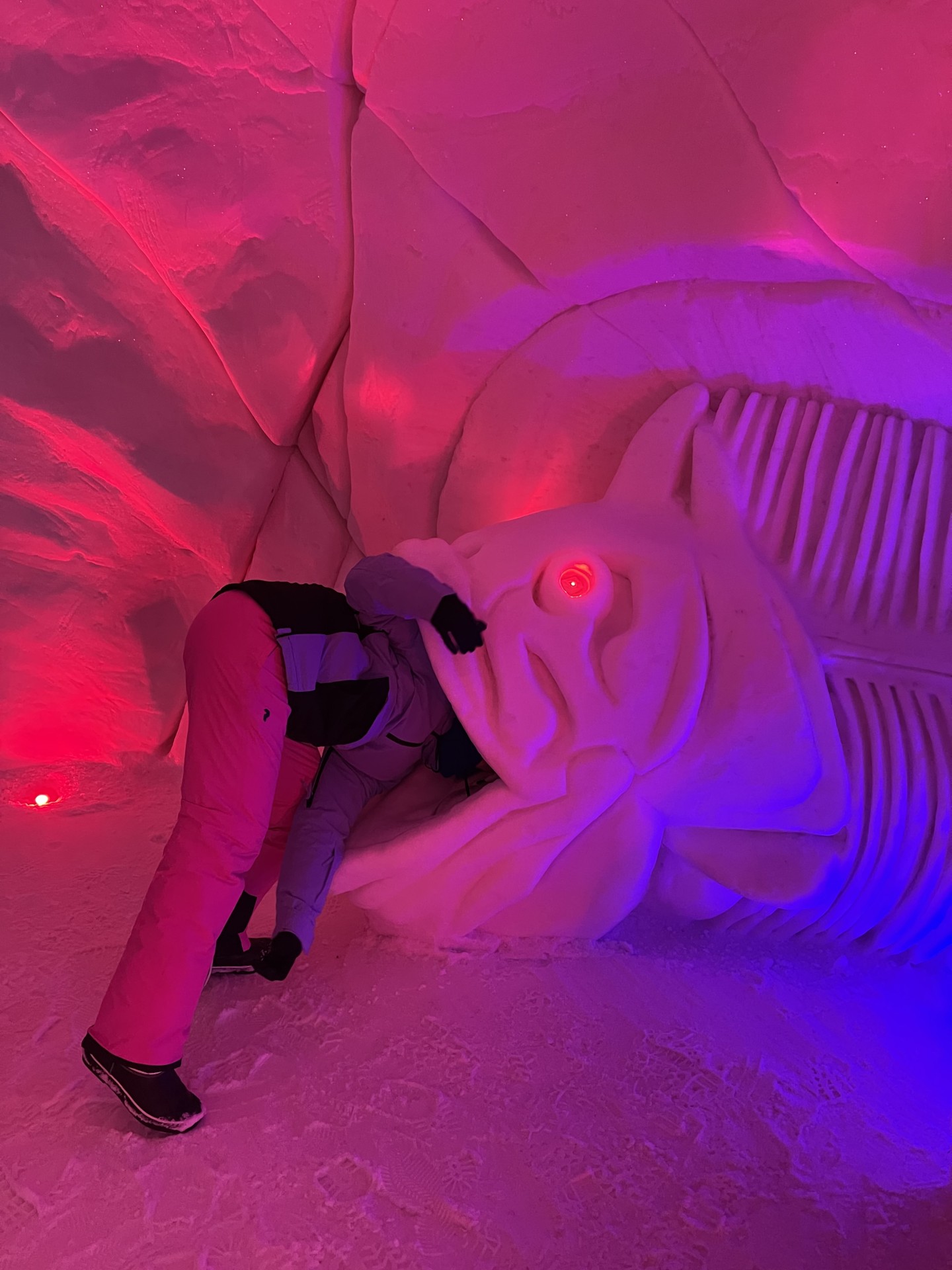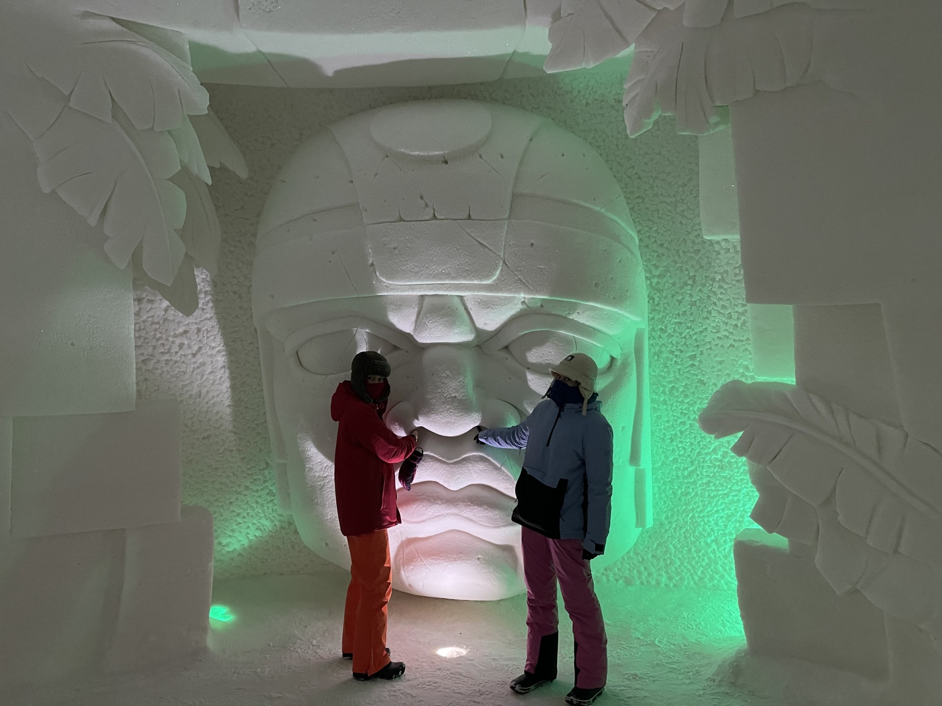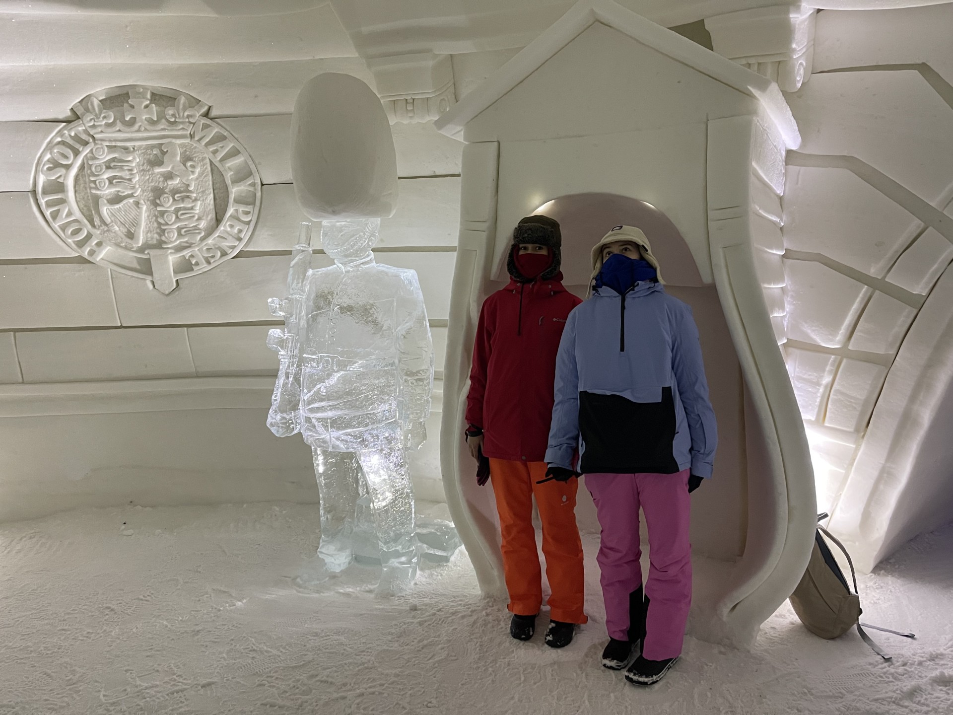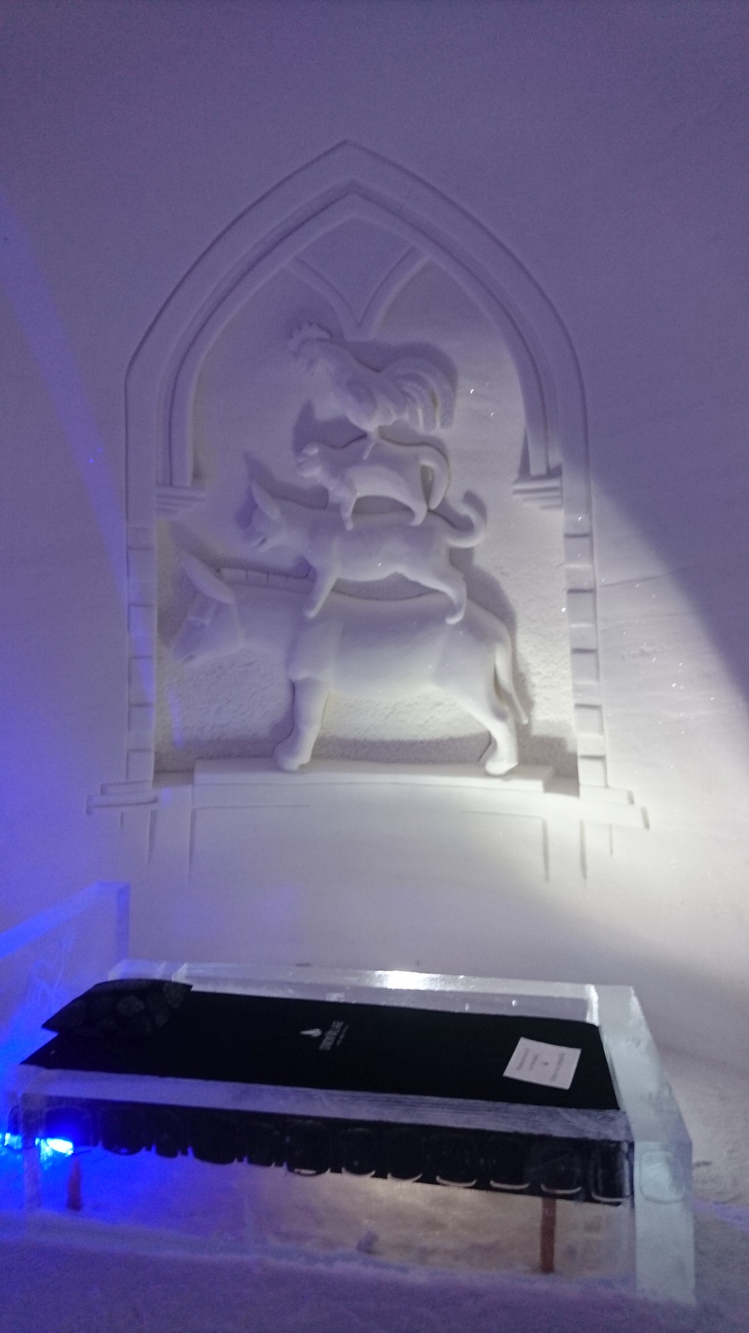 Nous arrivons au Lapland Hotels Snow Village peu après 10h et par chance avant les 8 auto-cars bondés qui font aussi une halte dans cet endroit particulier durant leur trajet vers l'aéroport. Le Snow Village est une série d'igloo interconnectés et reconstruits chaque année en couvrant de neige des structures gonflable organisées en groupes de 4 à 5 "petits" igloos (chambres) répartis autour d'un grand igloo (lobby). L'intérieur des igloos est ensuite décoré avec des sculptures de glace et des bas-reliefs inspirés d'une thématique variant d'une année à l'autre. Pour la saison 2022-2023, le thème est "World's best-known attractions" (Les attractions touristiques les plus connues du monde). Durant la journée, le "village" est ouvert au visite par le grand public, puis se transforme pour la nuit en hôtel avec plus de 15 suites de 2 à 5 places très fraîches...