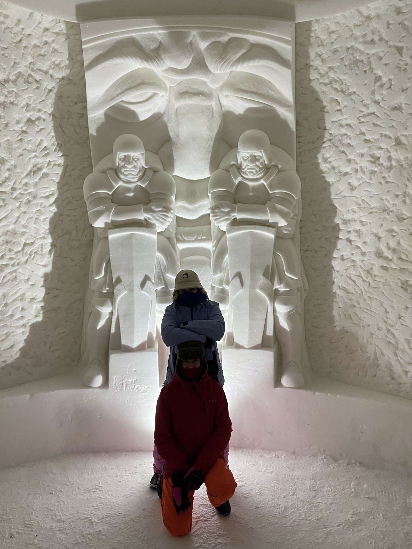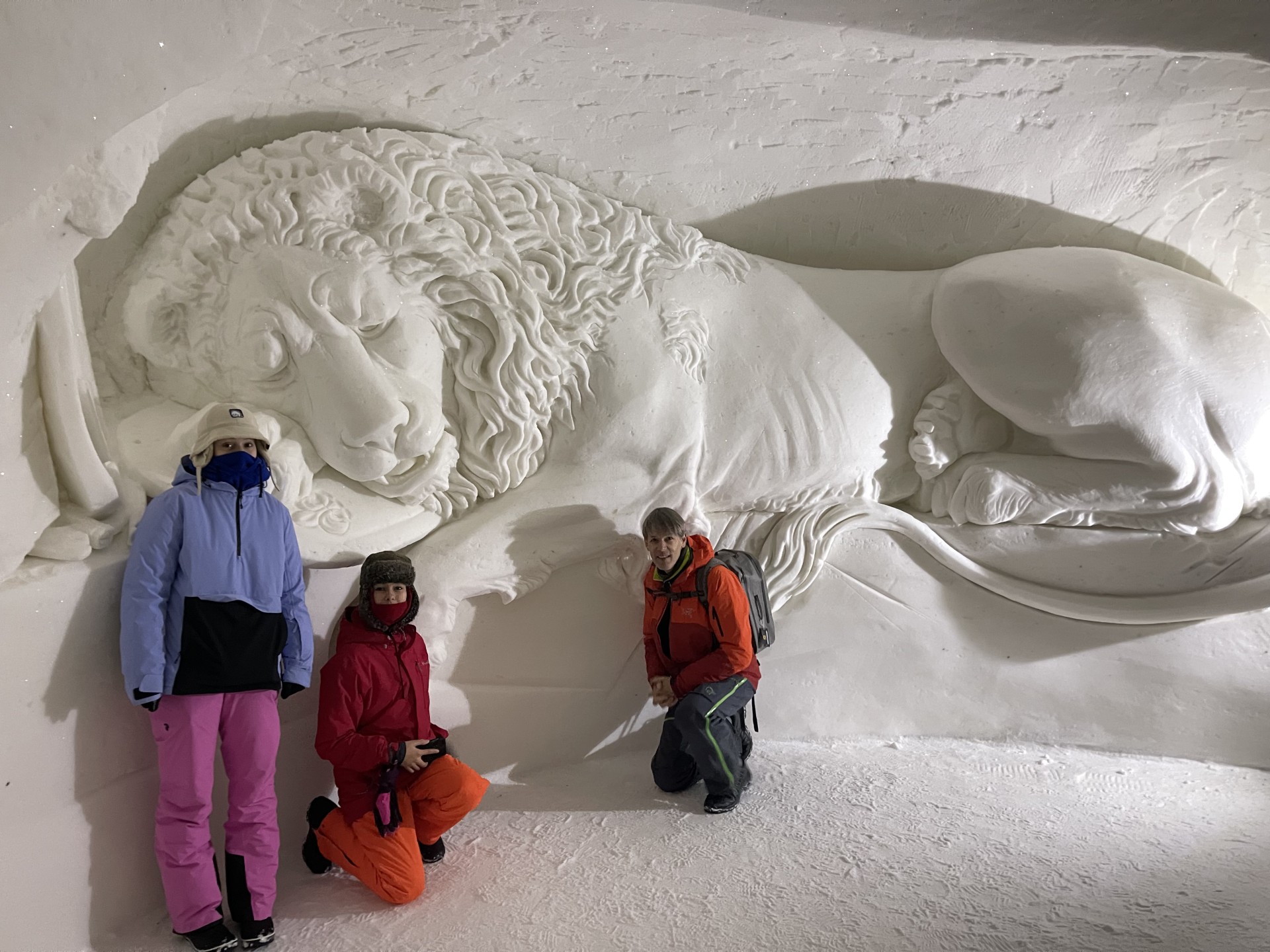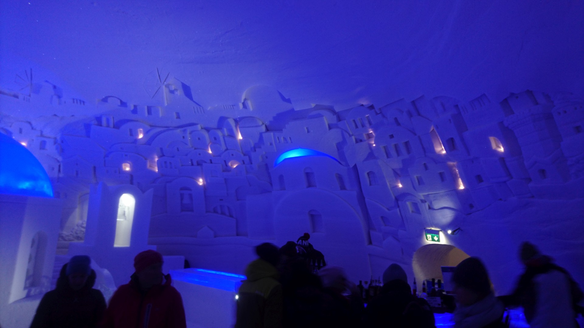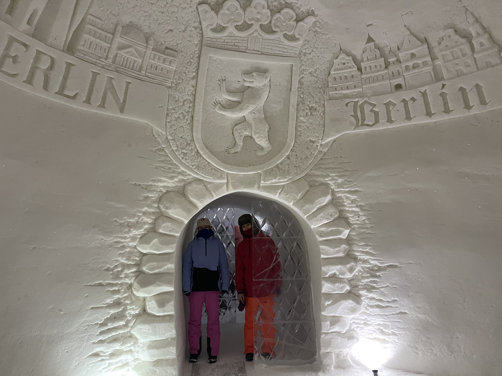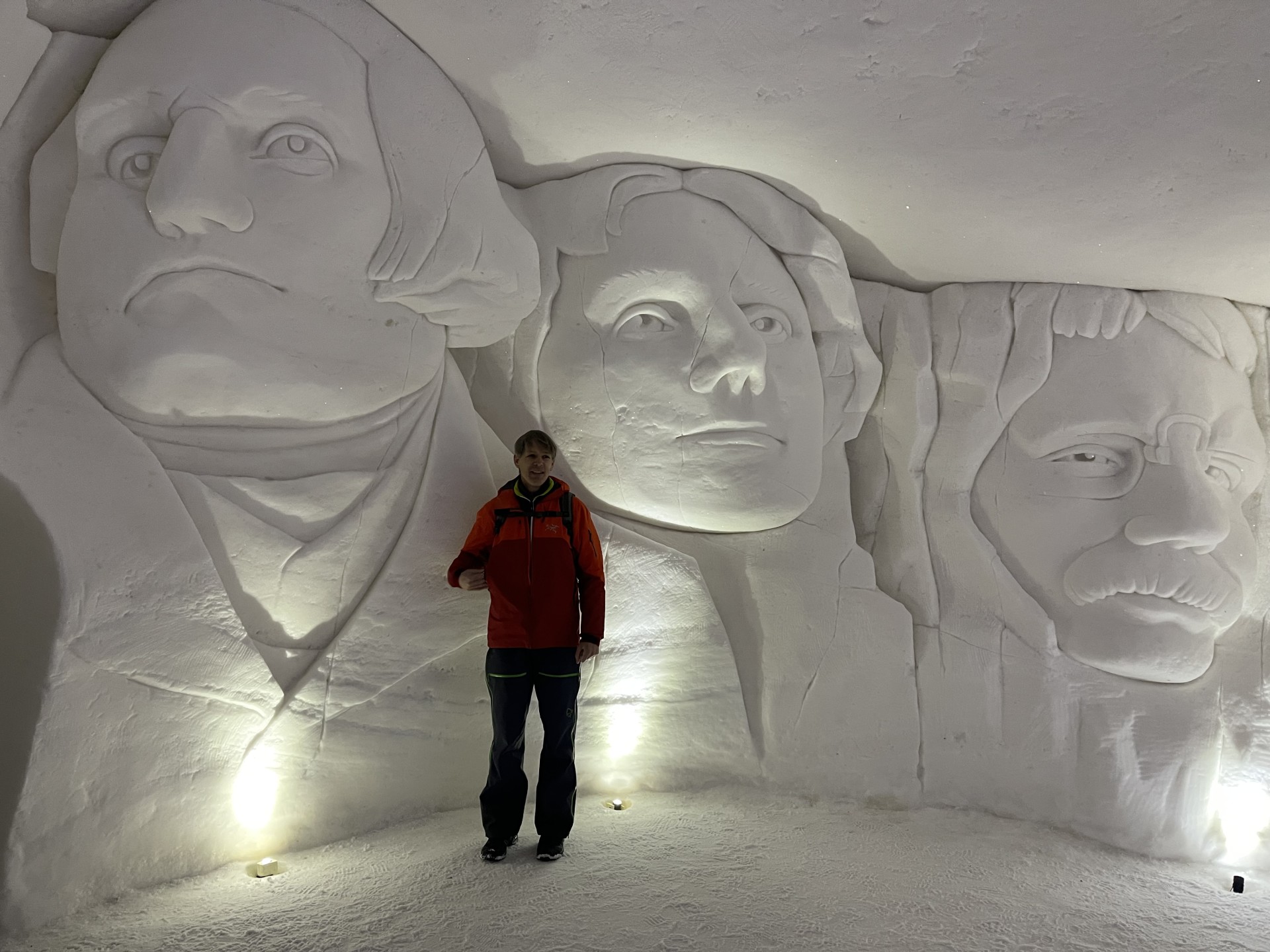 Nous arrivons au Lapland Hotels Snow Village peu après 10h et par chance avant les 8 auto-cars bondés qui font aussi une halte dans cet endroit particulier durant leur trajet vers l'aéroport. Le Snow Village est une série d'igloo interconnectés et reconstruits chaque année en couvrant de neige des structures gonflable organisées en groupes de 4 à 5 "petits" igloos (chambres) répartis autour d'un grand igloo (lobby). L'intérieur des igloos est ensuite décoré avec des sculptures de glace et des bas-reliefs inspirés d'une thématique variant d'une année à l'autre. Pour la saison 2022-2023, le thème est "World's best-known attractions" (Les attractions touristiques les plus connues du monde). Durant la journée, le "village" est ouvert au visite par le grand public, puis se transforme pour la nuit en hôtel avec plus de 15 suites de 2 à 5 places très fraîches...