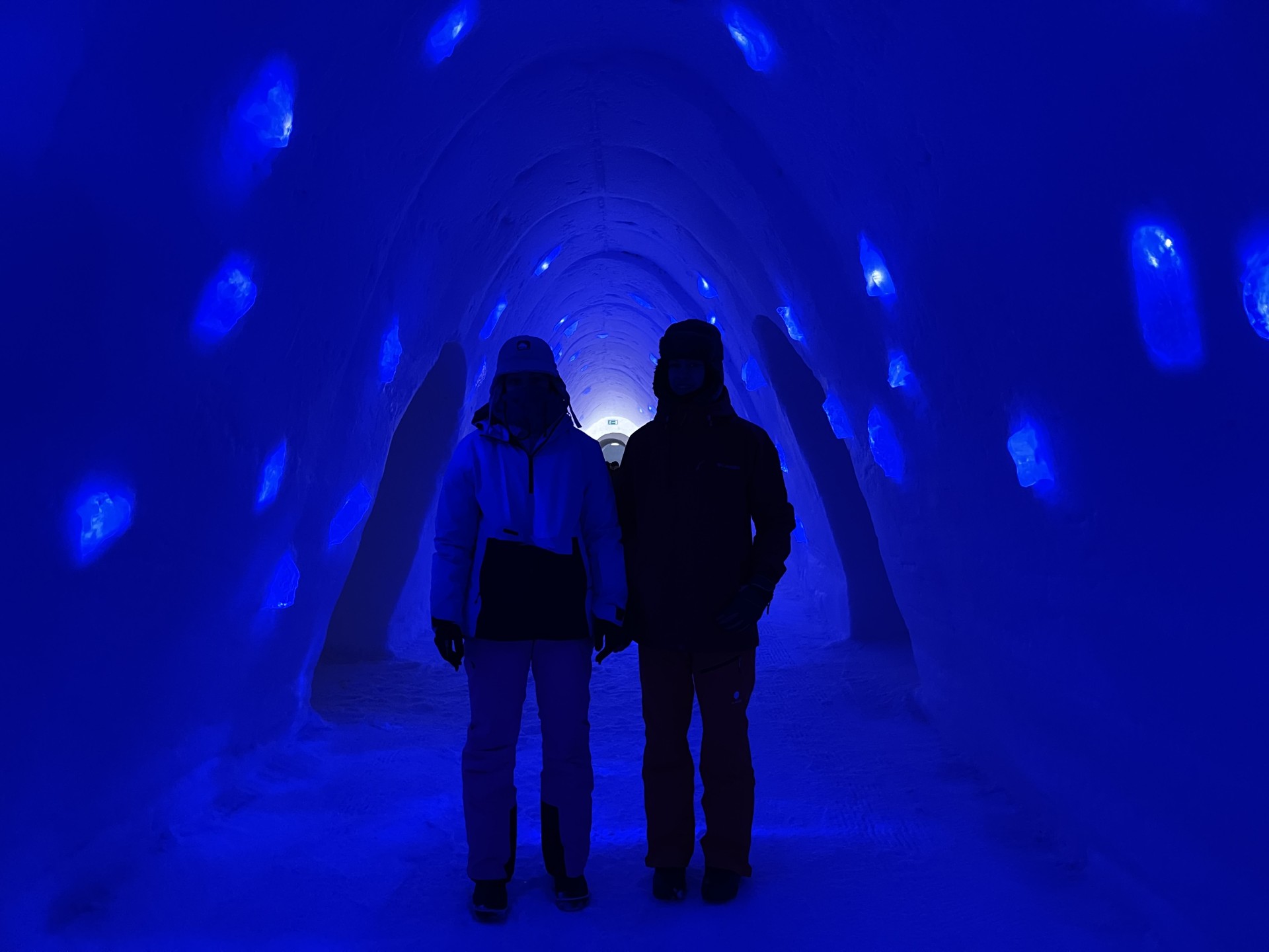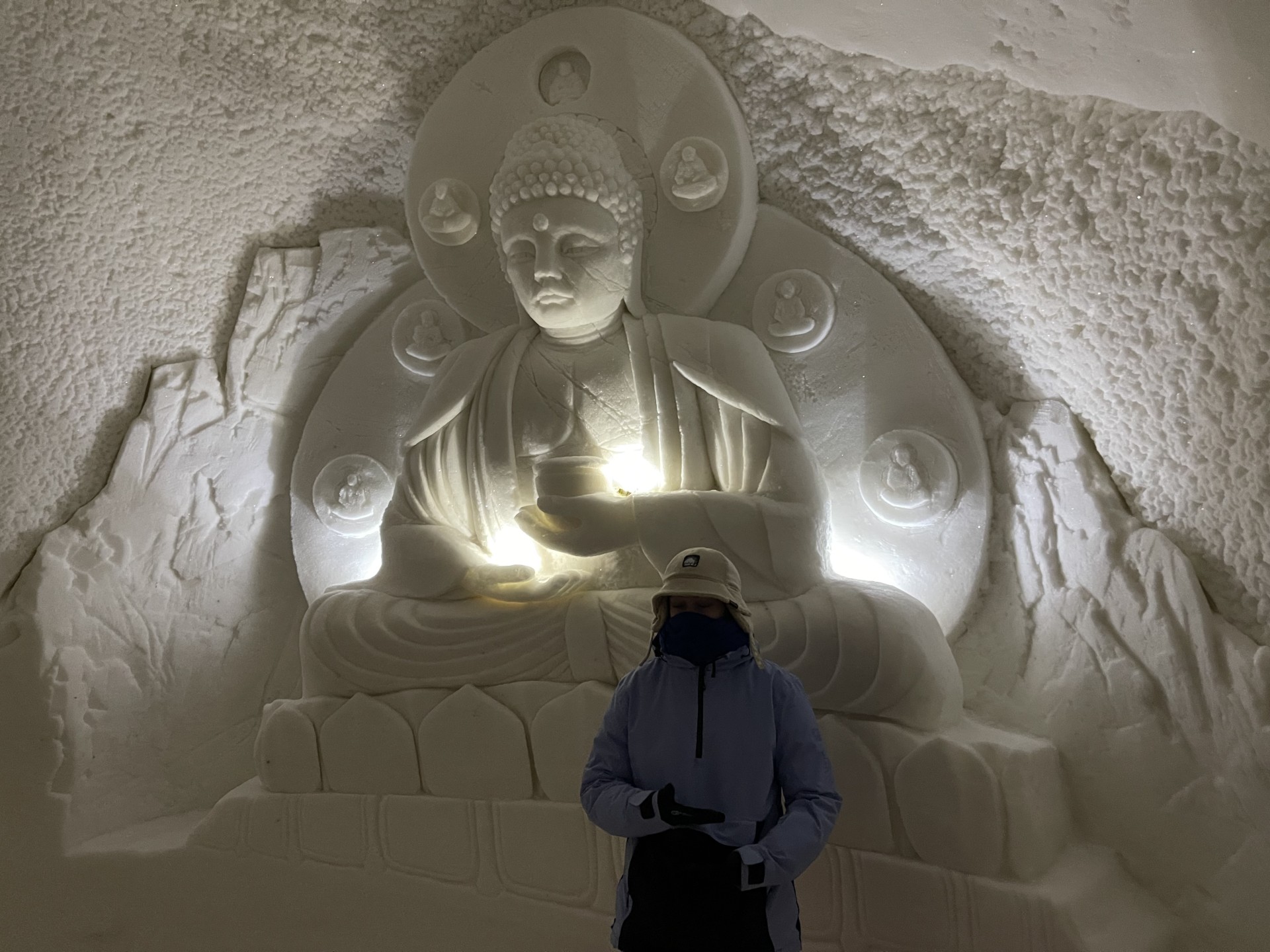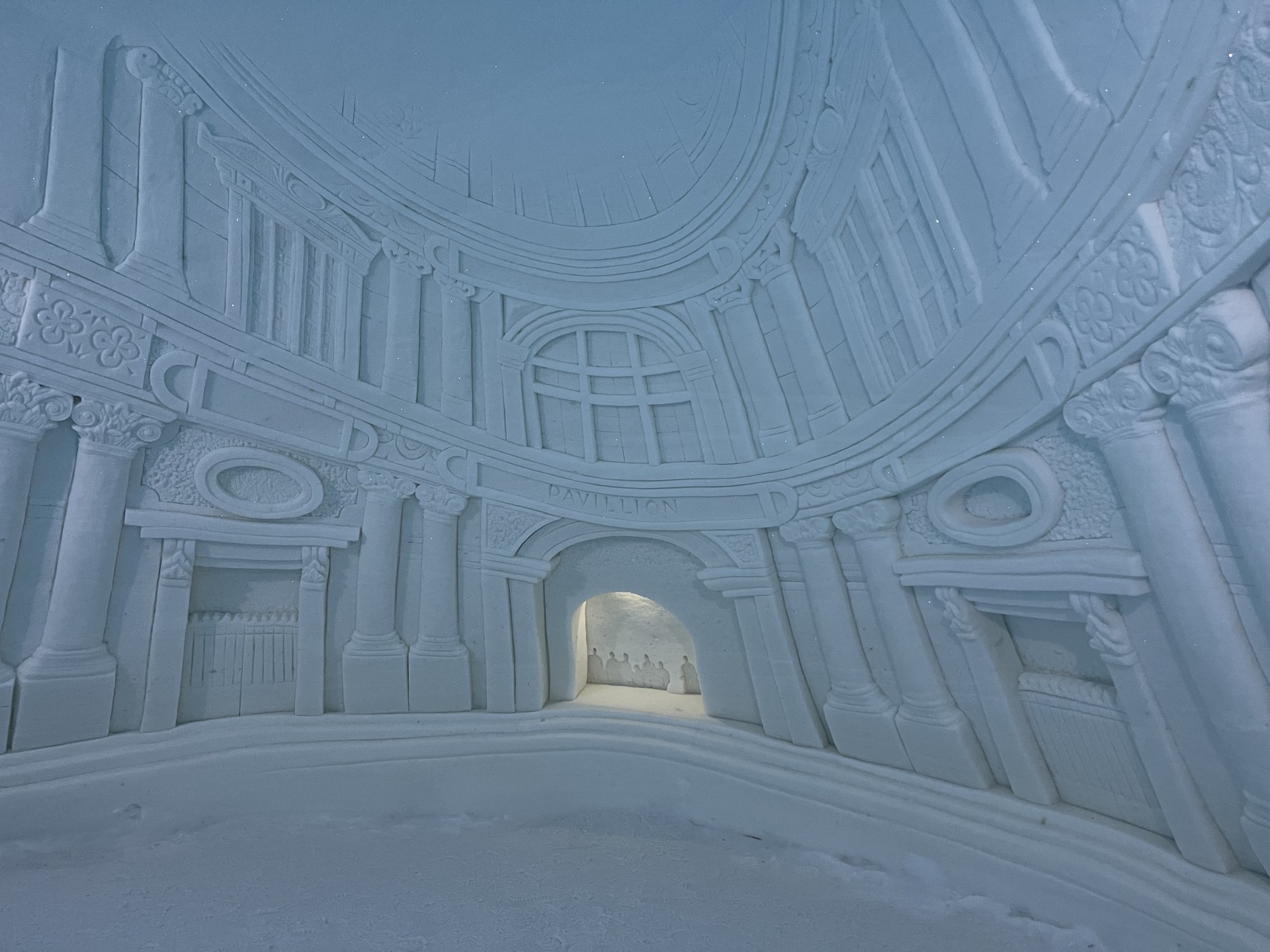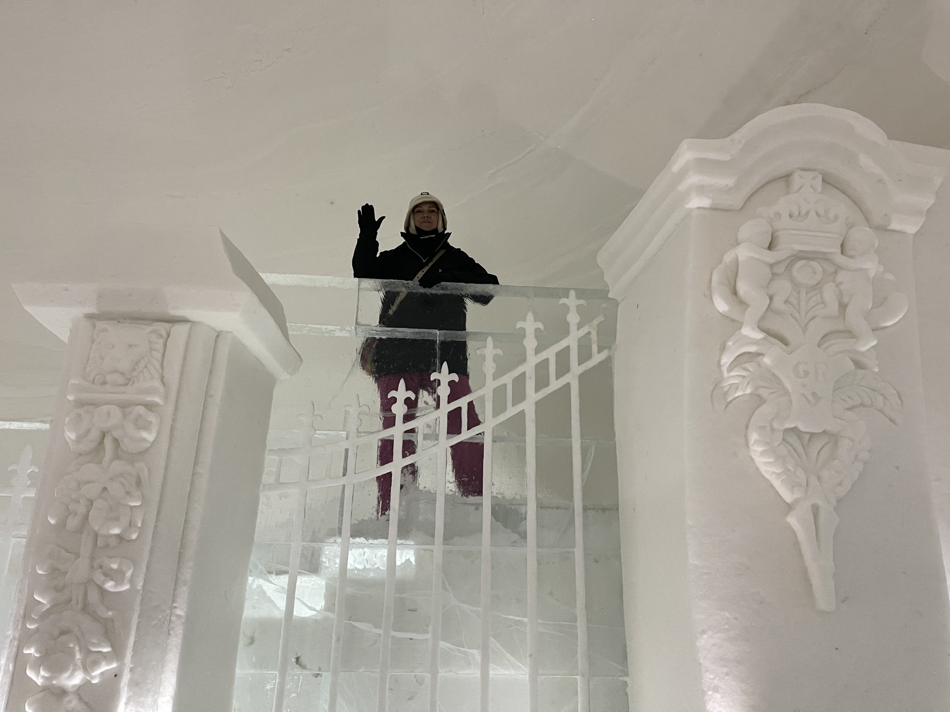 Nous arrivons au Lapland Hotels Snow Village peu après 10h et par chance avant les 8 auto-cars bondés qui font aussi une halte dans cet endroit particulier durant leur trajet vers l'aéroport. Le Snow Village est une série d'igloo interconnectés et reconstruits chaque année en couvrant de neige des structures gonflable organisées en groupes de 4 à 5 "petits" igloos (chambres) répartis autour d'un grand igloo (lobby). L'intérieur des igloos est ensuite décoré avec des sculptures de glace et des bas-reliefs inspirés d'une thématique variant d'une année à l'autre. Pour la saison 2022-2023, le thème est "World's best-known attractions" (Les attractions touristiques les plus connues du monde). Durant la journée, le "village" est ouvert au visite par le grand public, puis se transforme pour la nuit en hôtel avec plus de 15 suites de 2 à 5 places très fraîches...