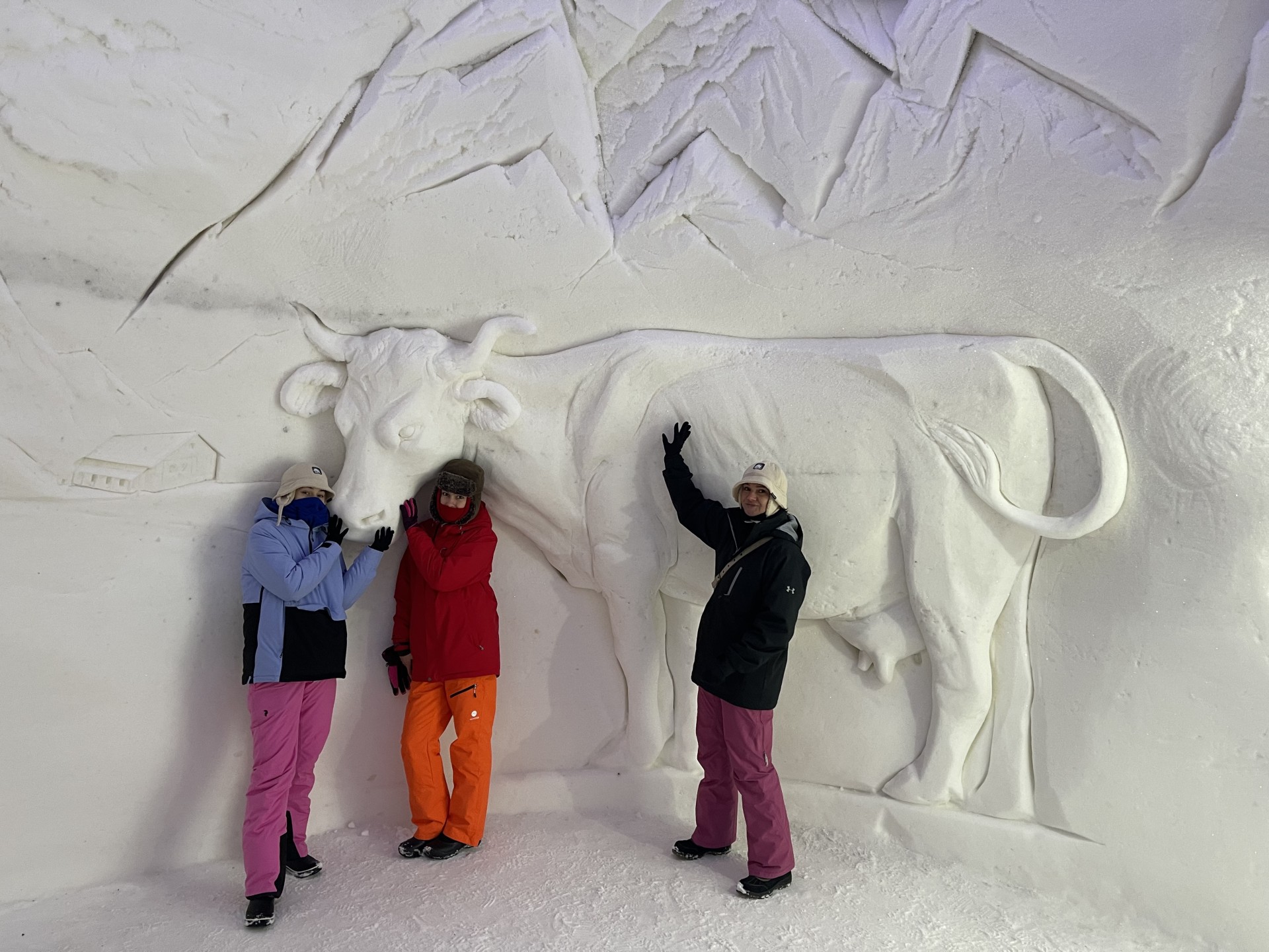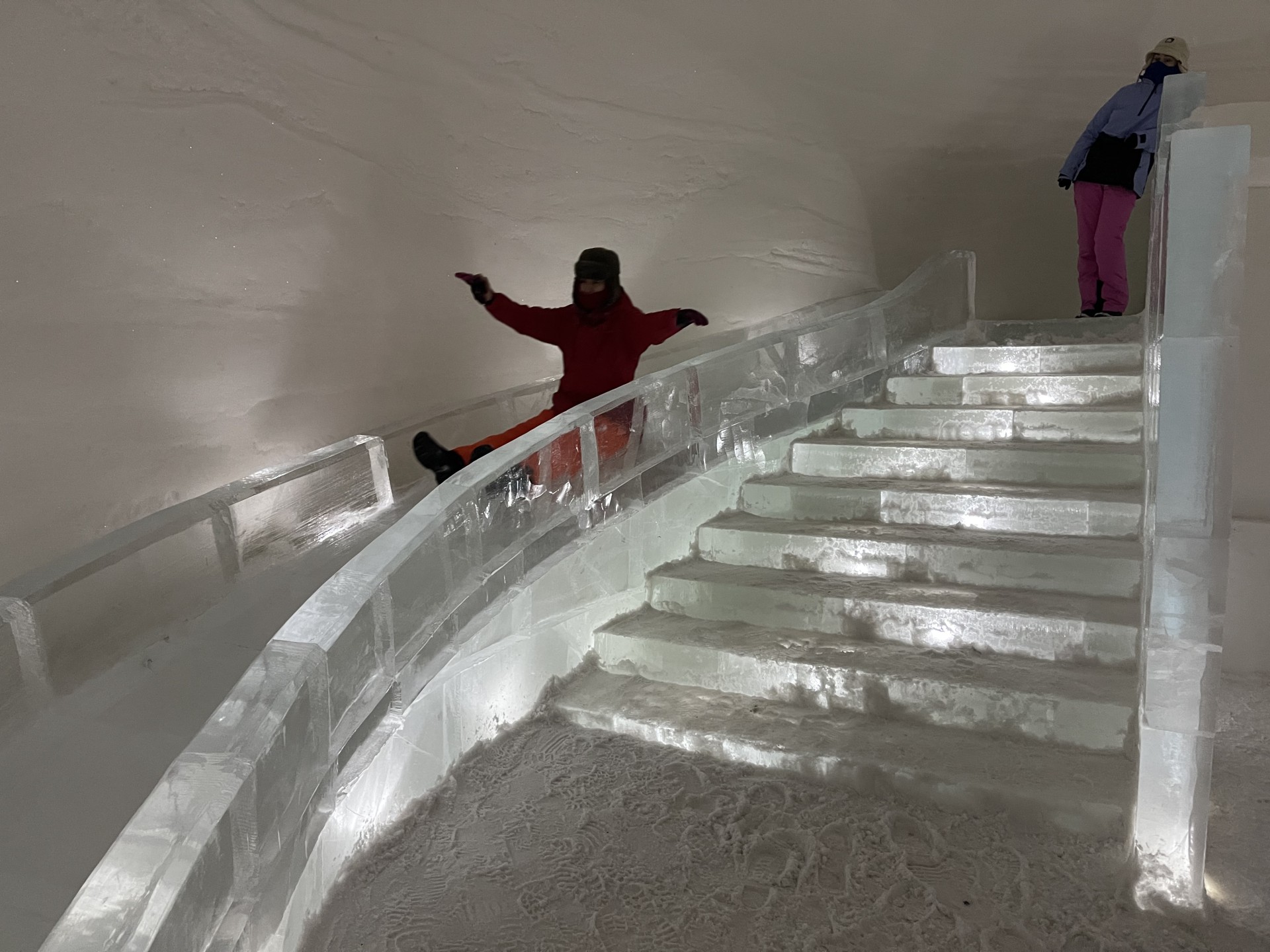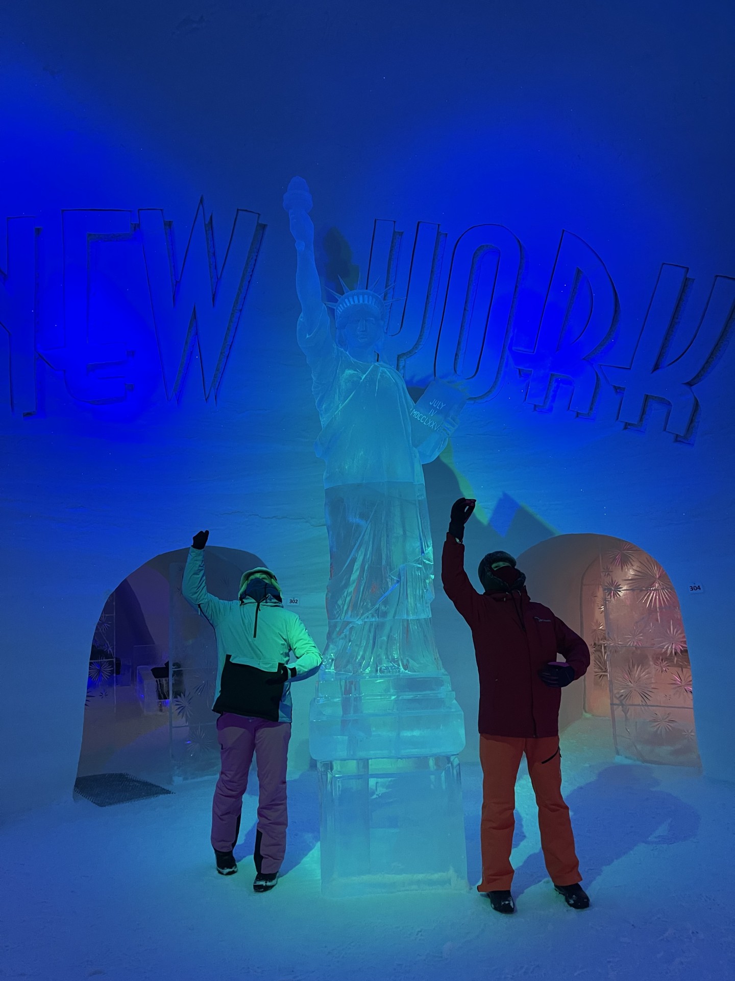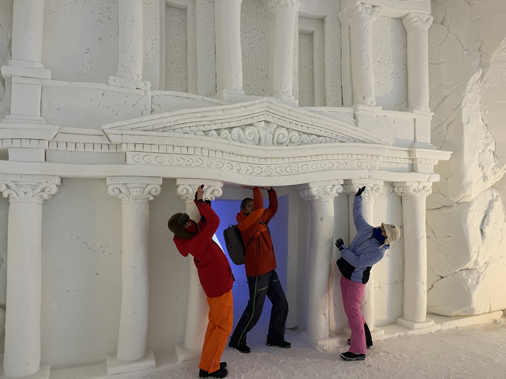 Nous arrivons au Lapland Hotels Snow Village peu après 10h et par chance avant les 8 auto-cars bondés qui font aussi une halte dans cet endroit particulier durant leur trajet vers l'aéroport. Le Snow Village est une série d'igloo interconnectés et reconstruits chaque année en couvrant de neige des structures gonflable organisées en groupes de 4 à 5 "petits" igloos (chambres) répartis autour d'un grand igloo (lobby). L'intérieur des igloos est ensuite décoré avec des sculptures de glace et des bas-reliefs inspirés d'une thématique variant d'une année à l'autre. Pour la saison 2022-2023, le thème est "World's best-known attractions" (Les attractions touristiques les plus connues du monde). Durant la journée, le "village" est ouvert au visite par le grand public, puis se transforme pour la nuit en hôtel avec plus de 15 suites de 2 à 5 places très fraîches...