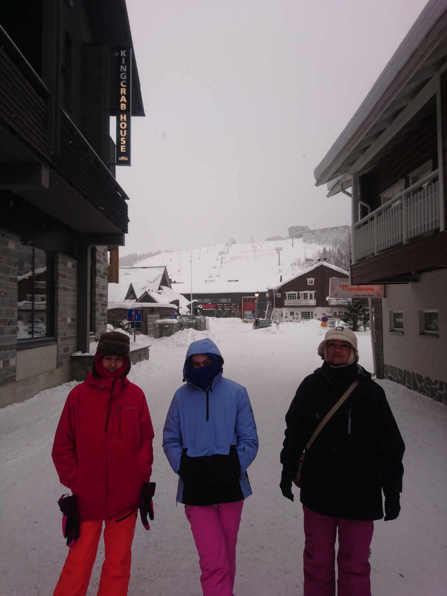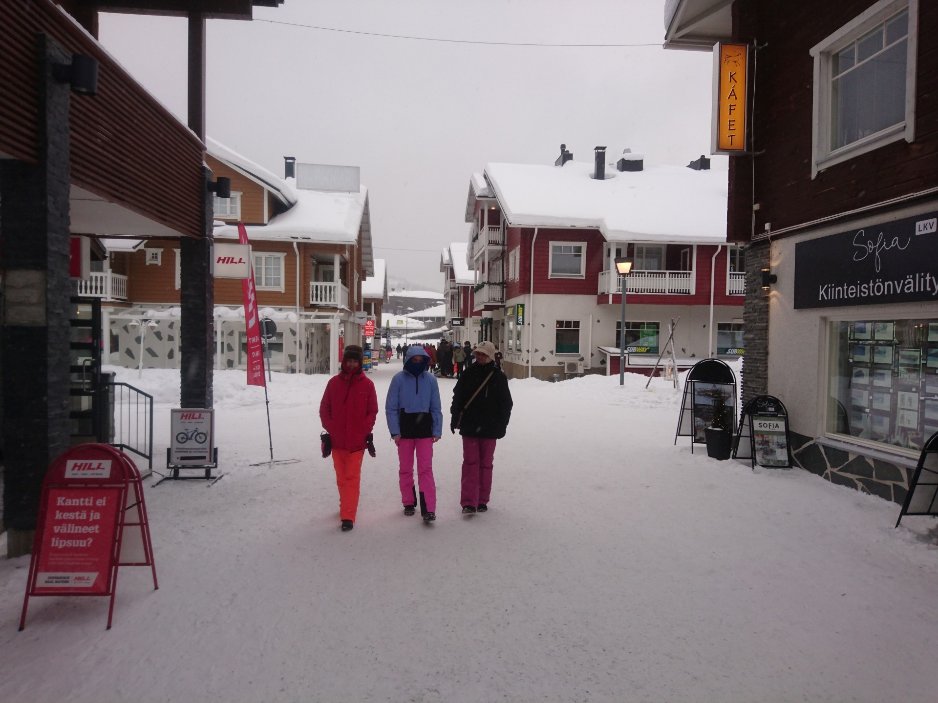 Disposant encore d'un peu de temps avant de devoir nous présenter pour l'embarquement, nous passons tout droit à côté de l'aéroport et continuons notre route sur une quinzaine de kilomètre pour arrivé à la fameuse station de ski de Levi ou se tient traditionnellement la première course de la saison de la coupe du monde de ski alpin. Emilie étant bien enruhmée, nous faisons déjà un tour de la station en voiture pour voir à quoi cela ressemble. Il nous faut chercher un peu pour trouver une place de parc pas trop loin de la petite zone piétonne du centre située juste au pied des pistes de ski du flanc nord de la colline de Levi.