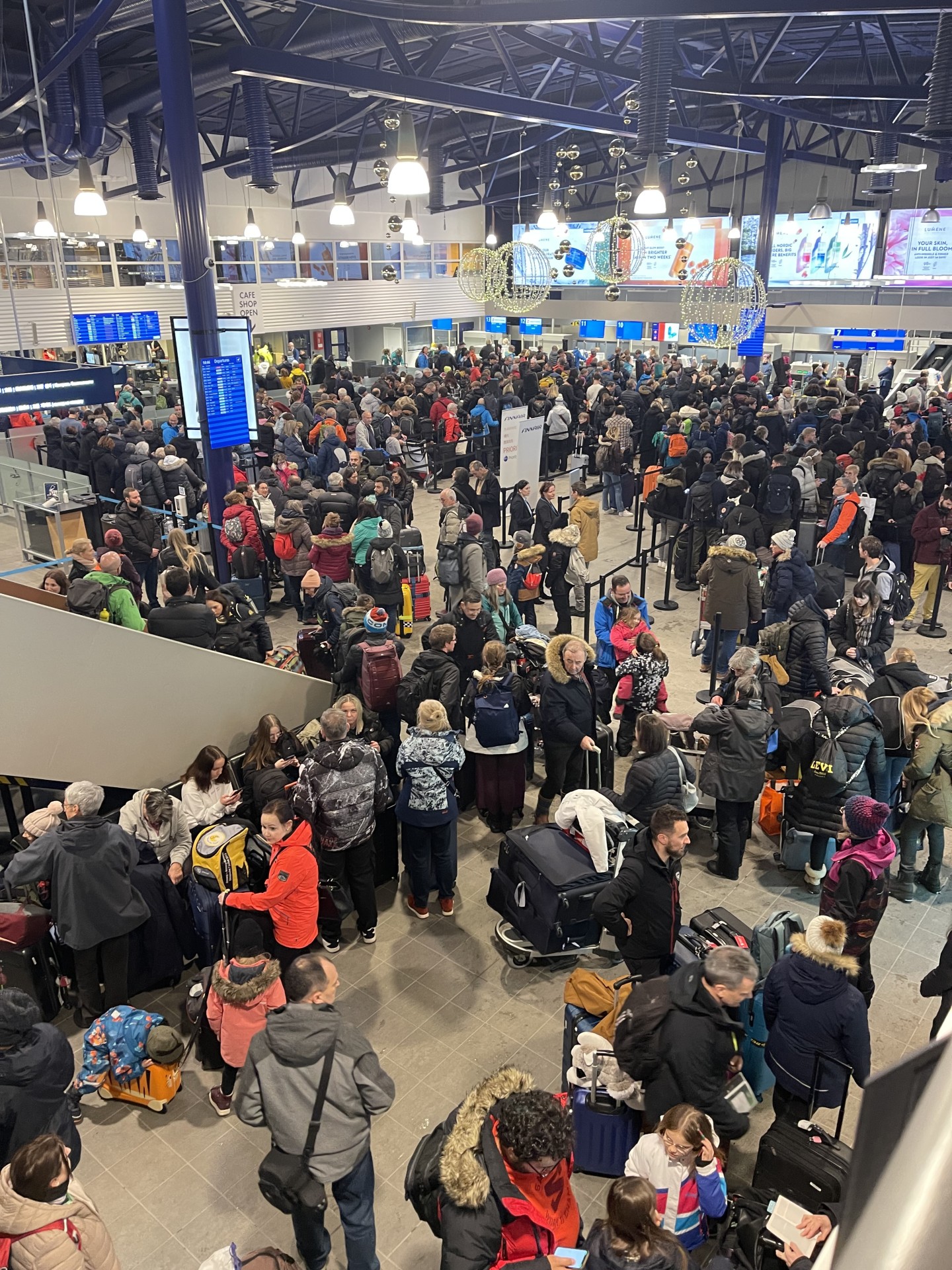 Vers 14h, nous nous retrouvons dans le hall principal de l'aéroport de Kittilä... pour 3 heures d'attente avant de savoir à quel guichet nous devons enregistrer nos bagages, 1 heures de "queue" pour l'enregistremnt des bagages (en fait il s'agissait plutôt d'un hamas cahotique de touristes tentant tant bien que mal de se rendre à leur guichet d'enregistrement sans vraiment pouvoir savoir lequel est le bon, les affichages étant assez aléatoirs et variables) et 30 minutes pour les contrôles de sécurité et l'embarquement.