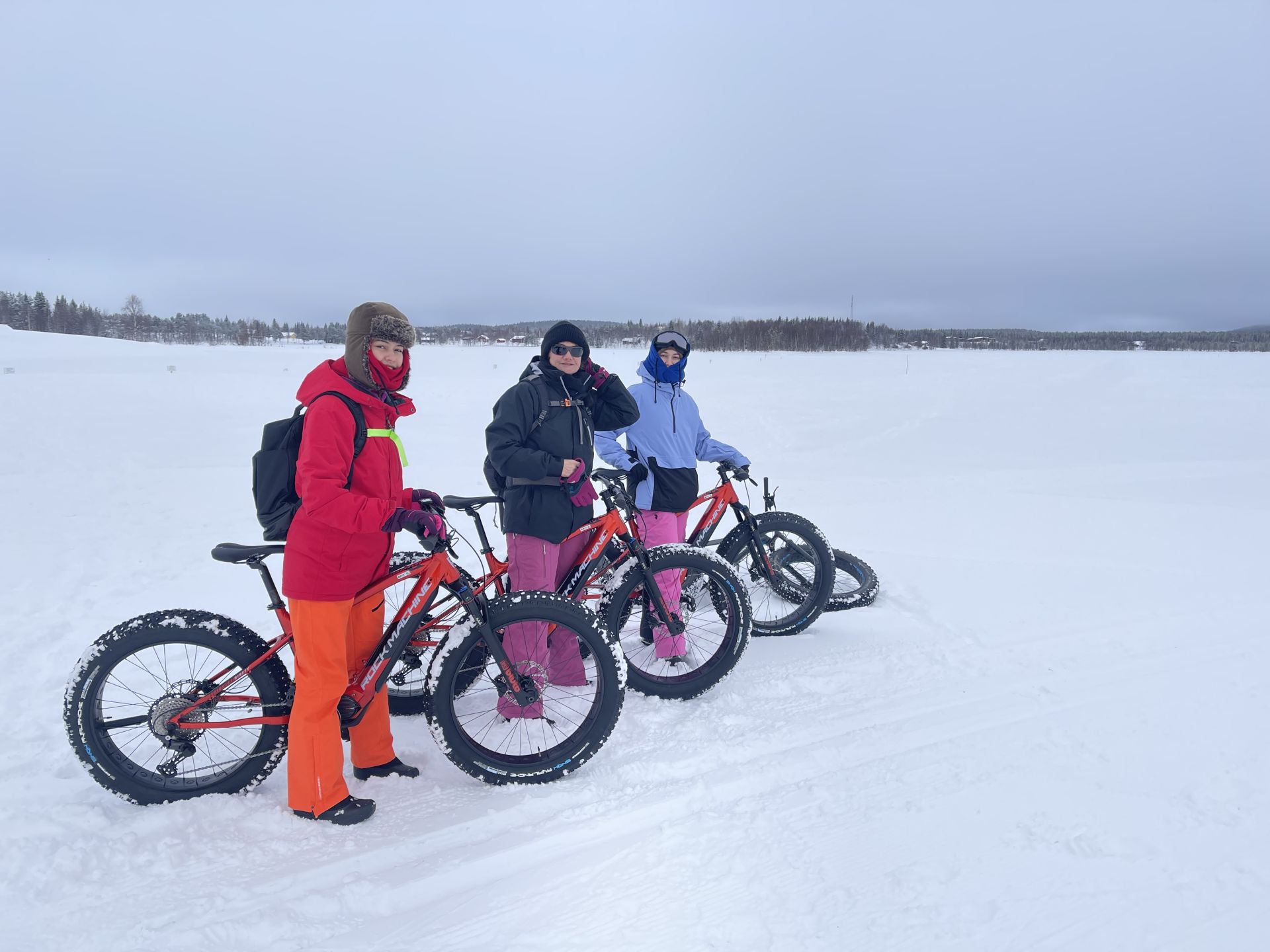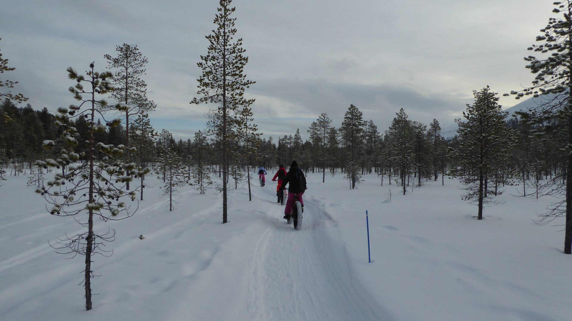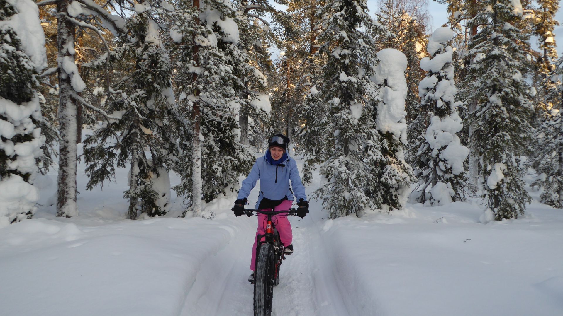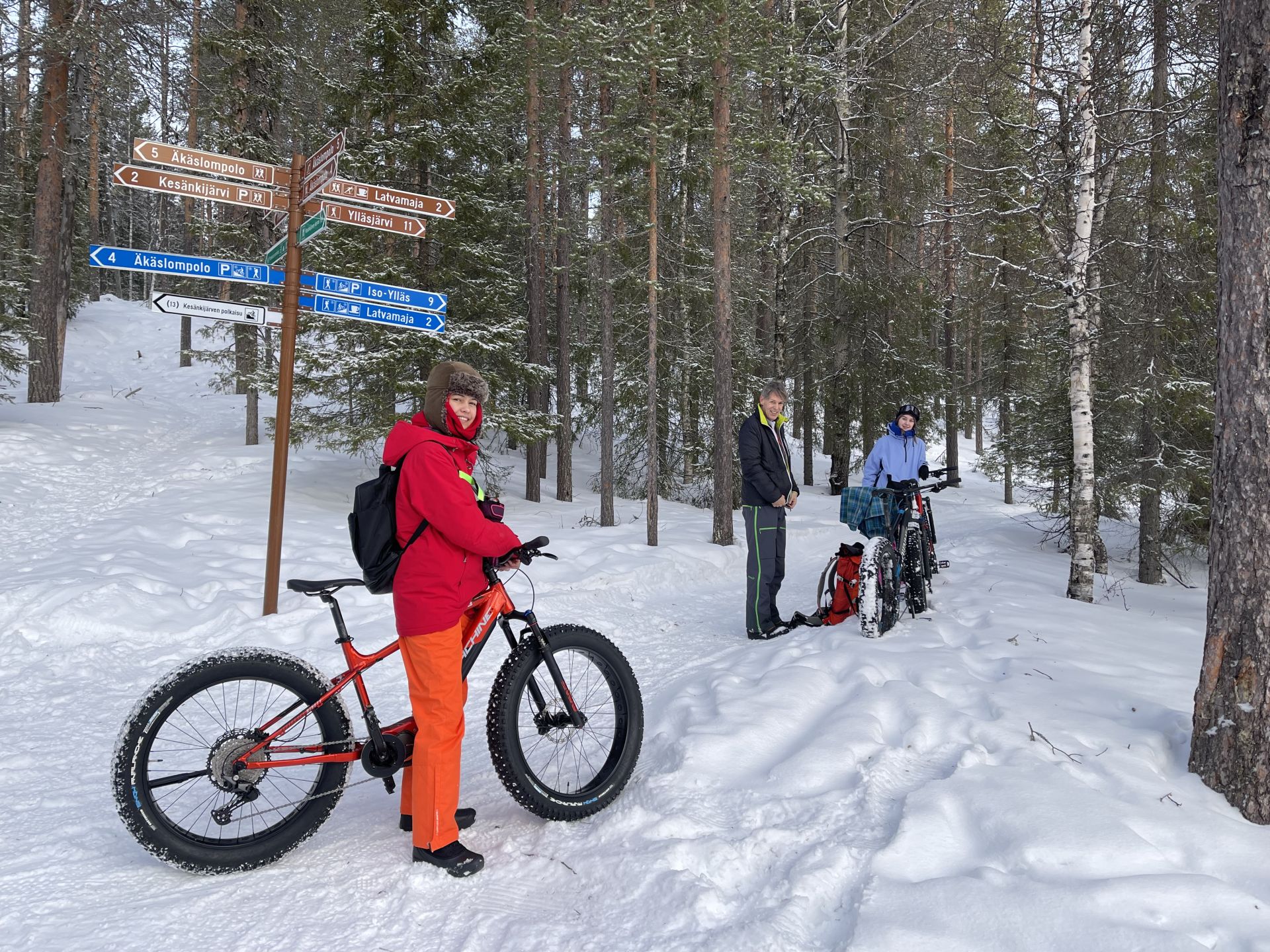 Nous sommes prêts, chacun équipé d'un vélo à pneus large (fatbike) électrifié, pour la majorité d'entre-nous, l'autre a envie de transpirer. Nous prenons la piste de rando-raquette-vélo qui traverse le lac en direction de l'hôtel Äkäshotelli et c'est plutôt roulant malgré la petite couche de neige fraiche qui a bien blanchi le paysage.