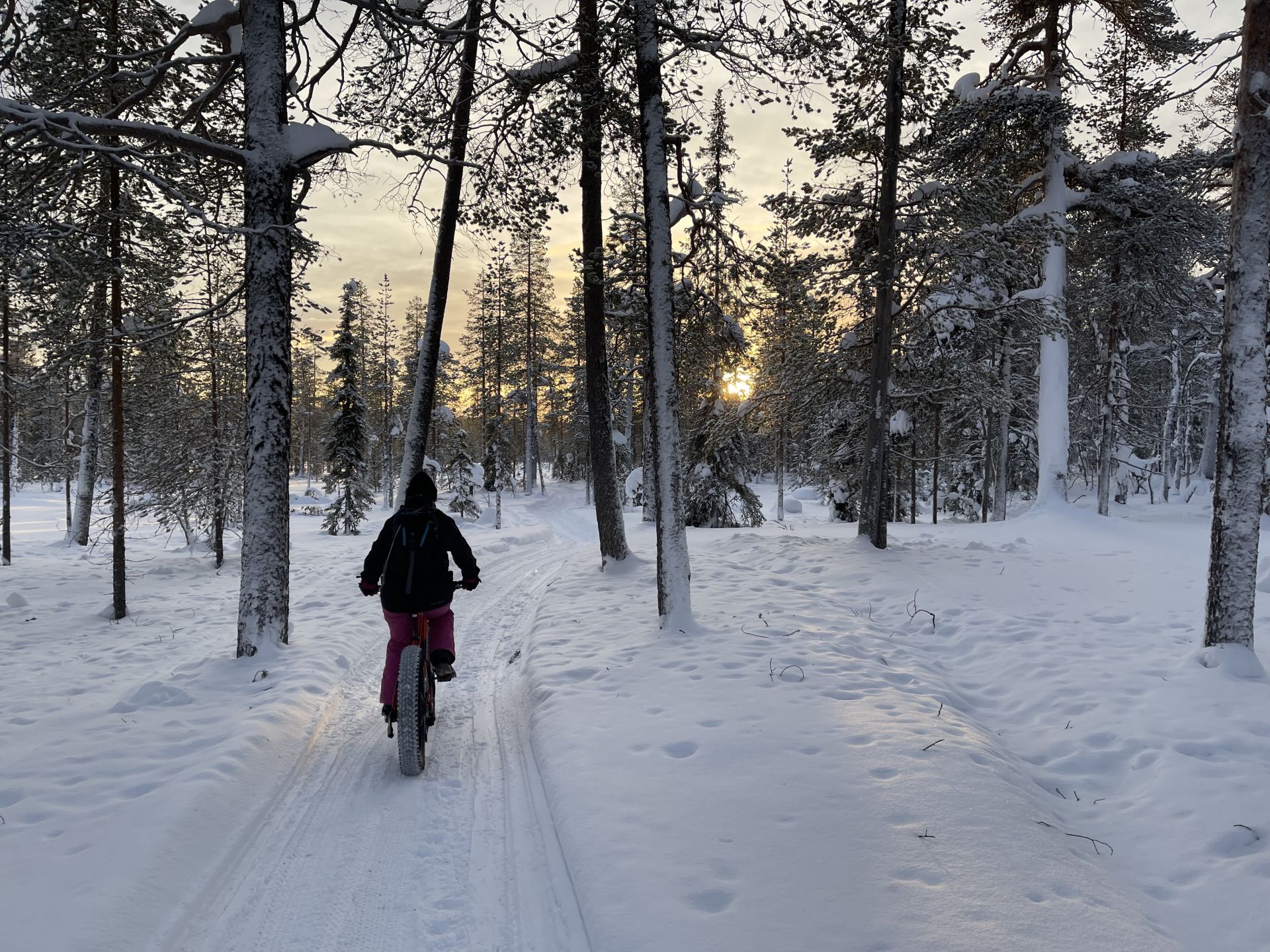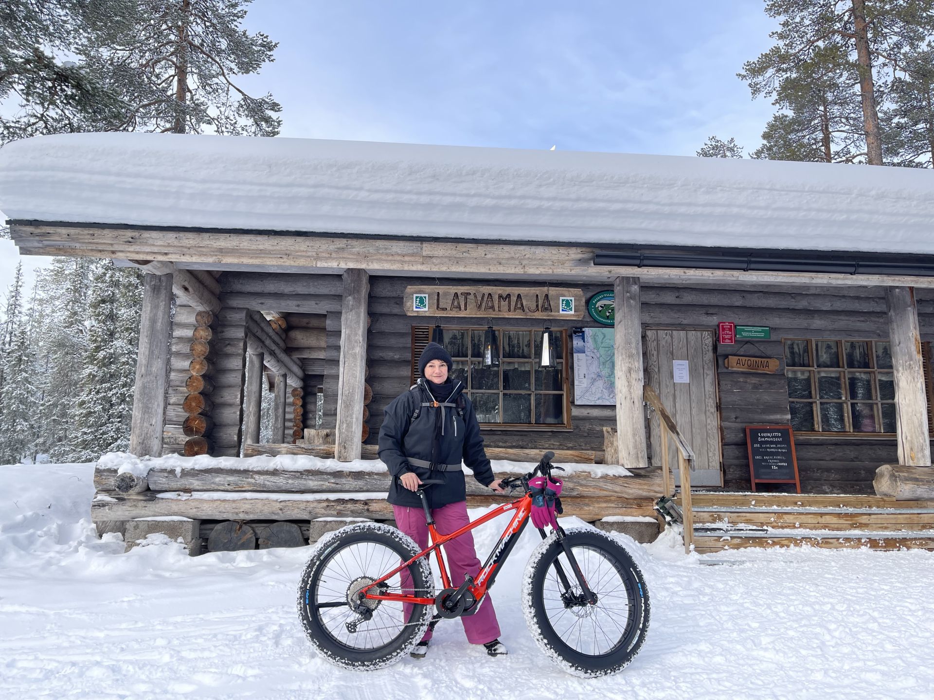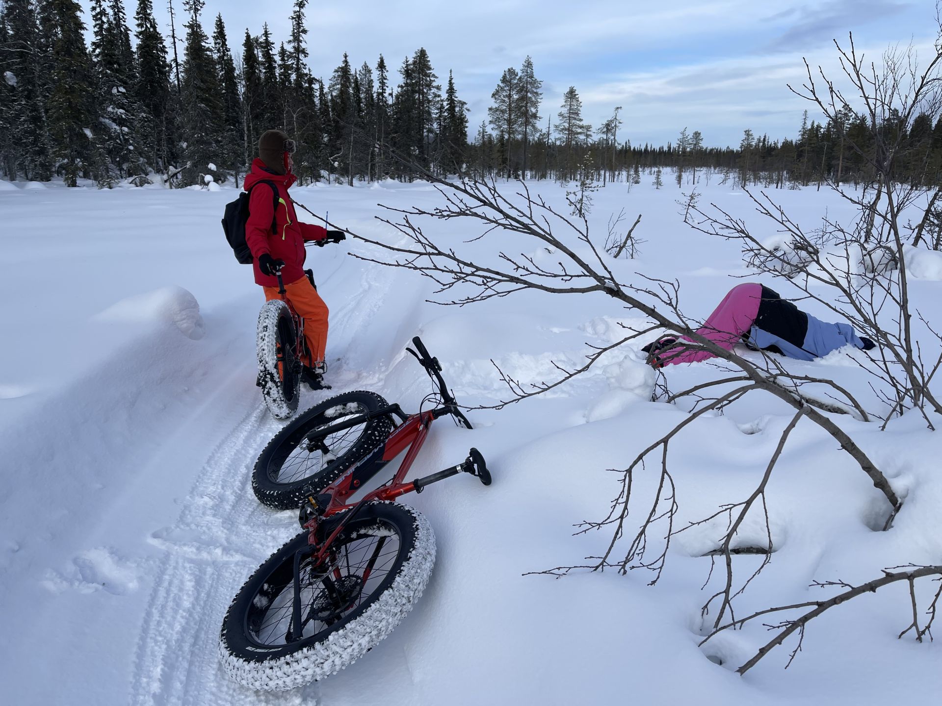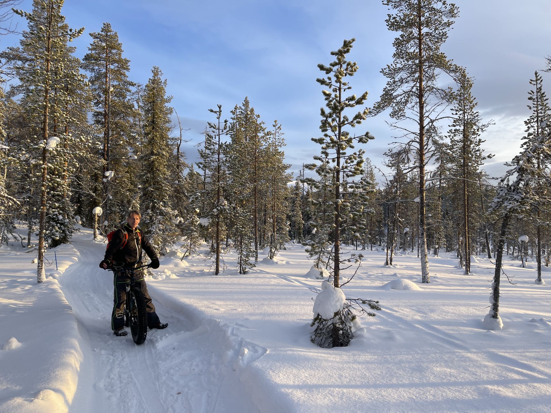 Nous sommes prêts, chacun équipé d'un vélo à pneus large (fatbike) électrifié, pour la majorité d'entre-nous, l'autre a envie de transpirer. Nous prenons la piste de rando-raquette-vélo qui traverse le lac en direction de l'hôtel Äkäshotelli et c'est plutôt roulant malgré la petite couche de neige fraiche qui a bien blanchi le paysage.