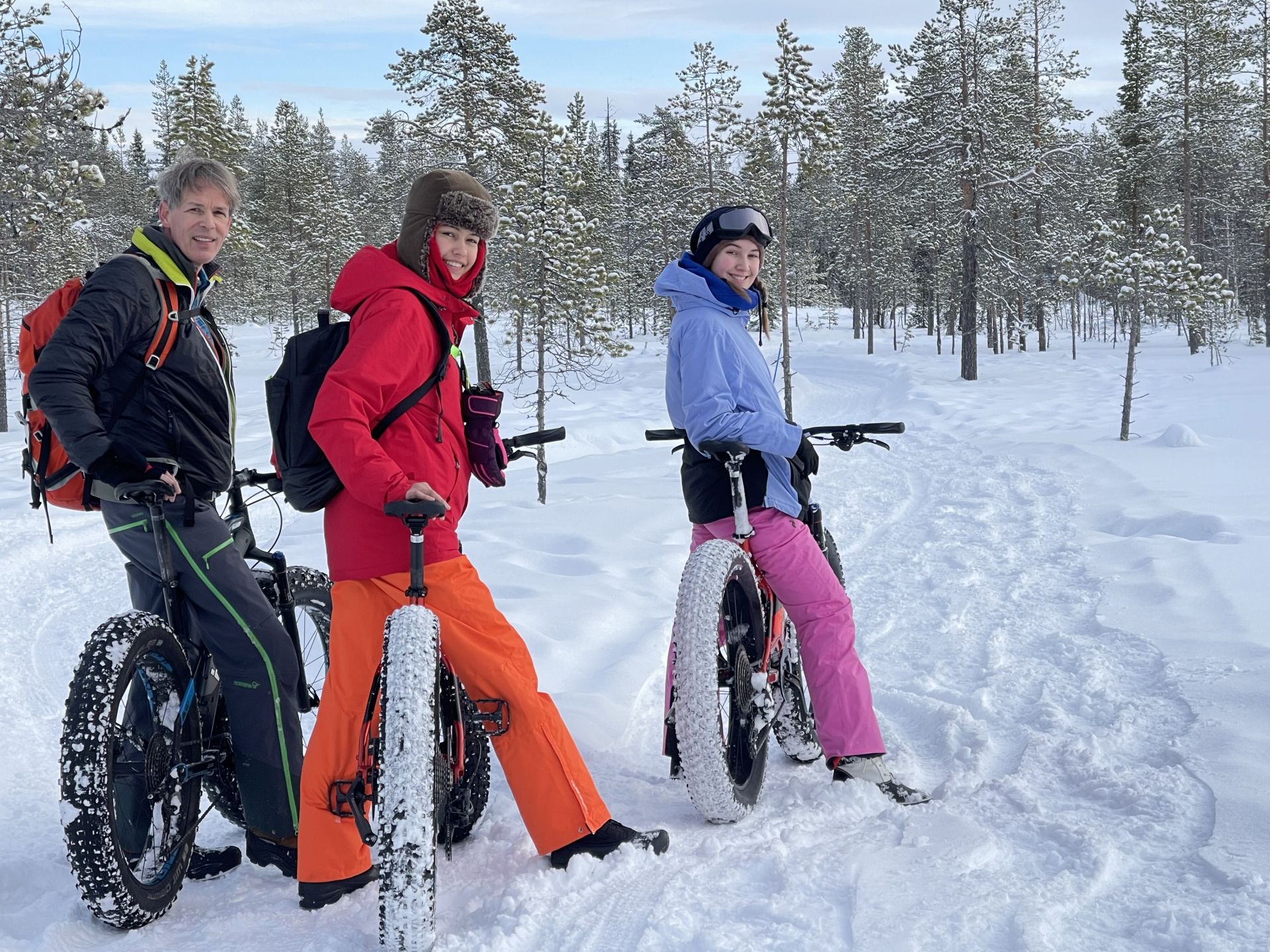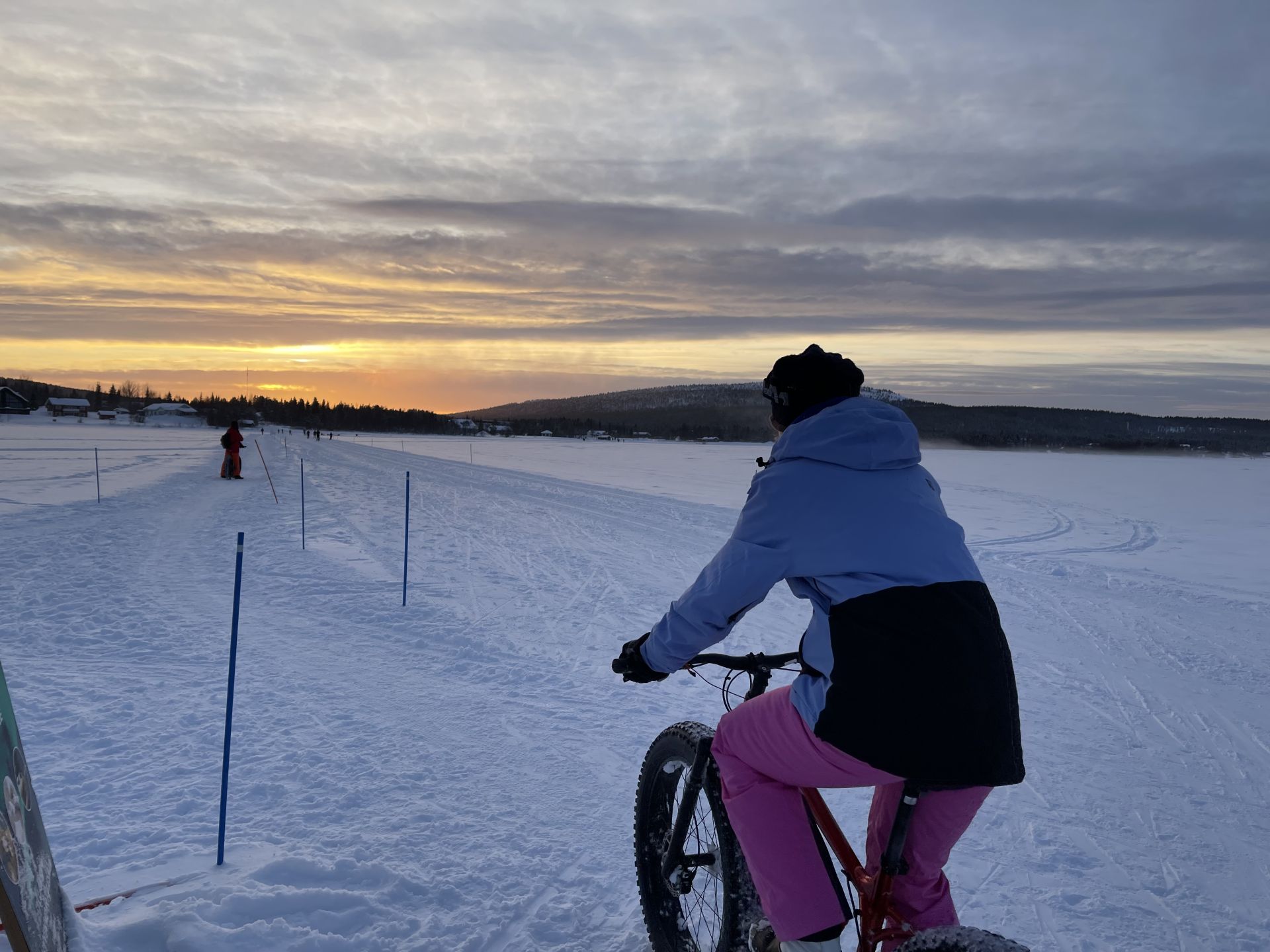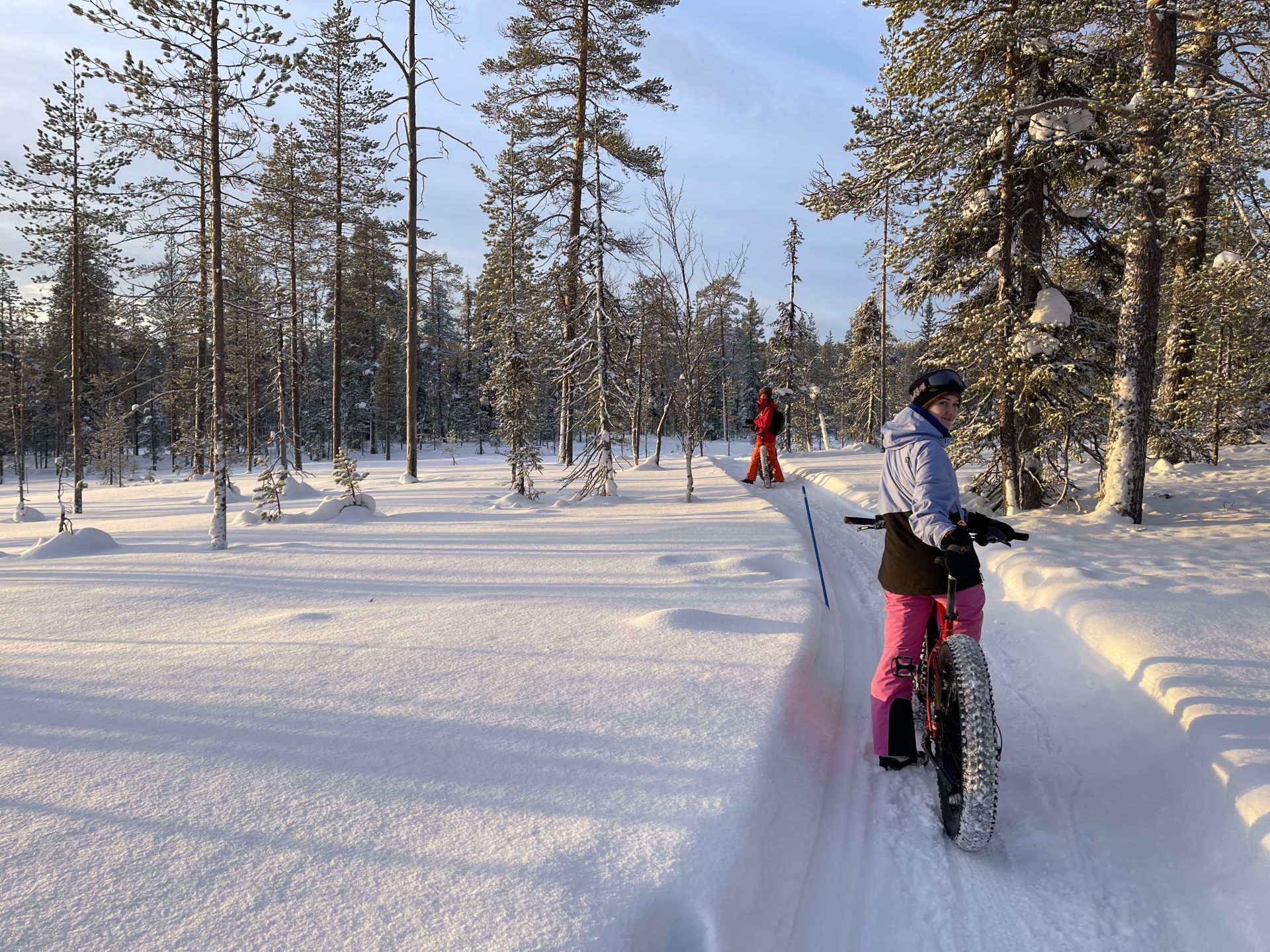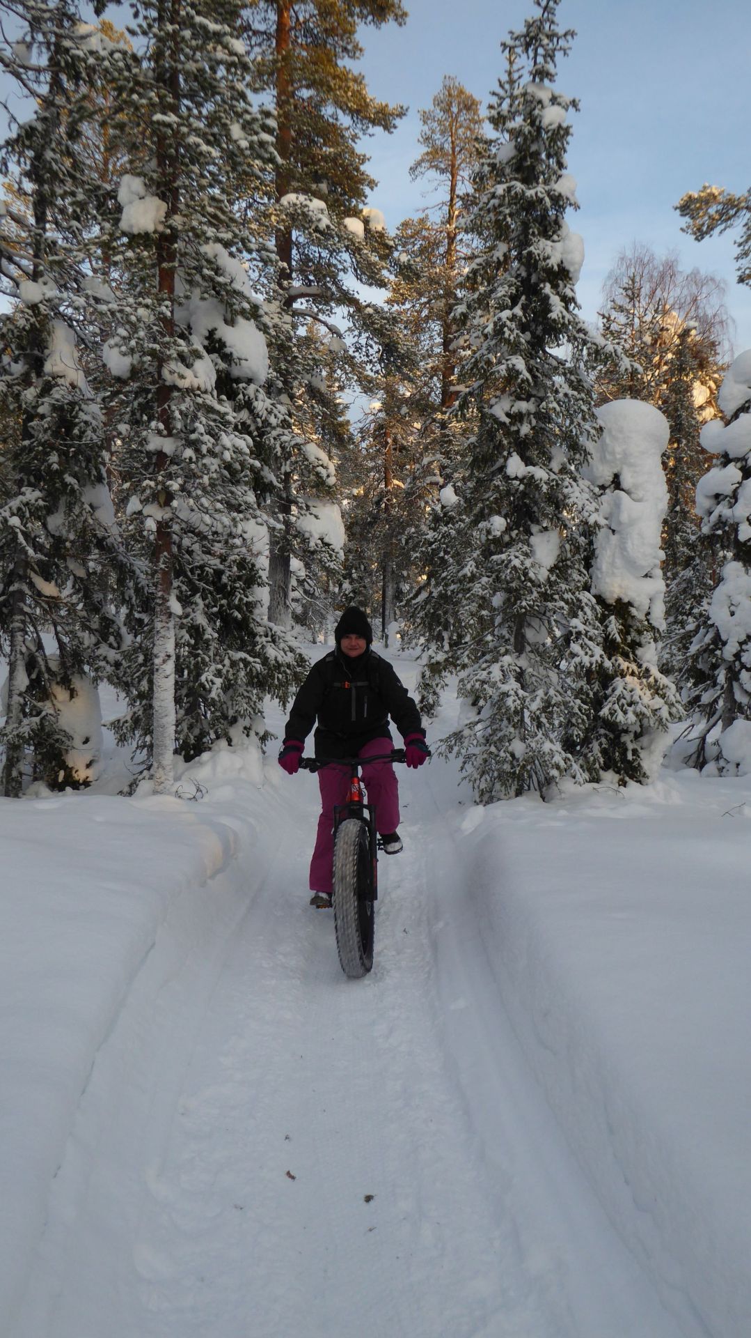 Nous sommes prêts, chacun équipé d'un vélo à pneus large (fatbike) électrifié, pour la majorité d'entre-nous, l'autre a envie de transpirer. Nous prenons la piste de rando-raquette-vélo qui traverse le lac en direction de l'hôtel Äkäshotelli et c'est plutôt roulant malgré la petite couche de neige fraiche qui a bien blanchi le paysage.