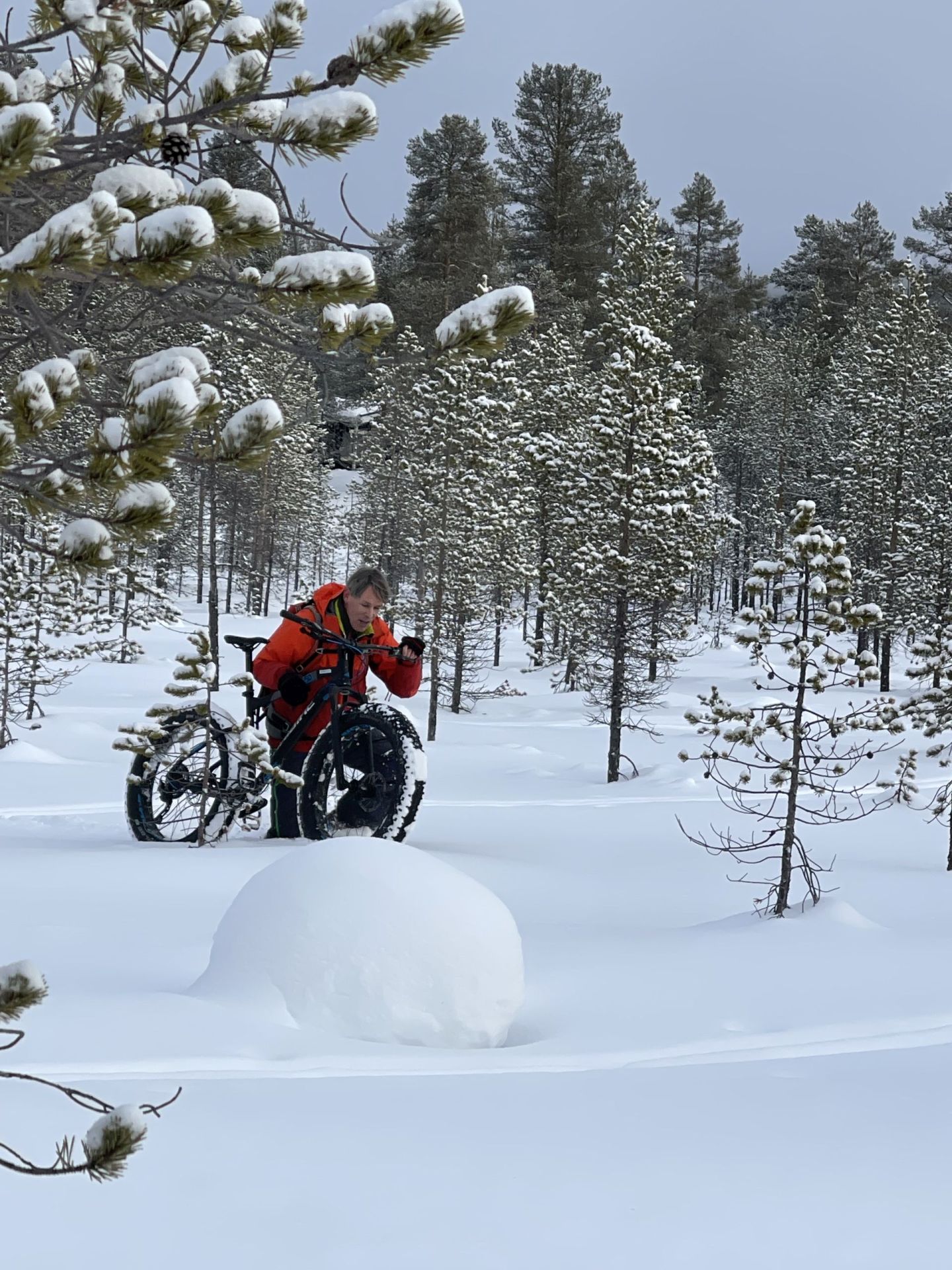 La première partie du trajet jusqu'au café Lavamaja est assez facile. La piste est bien marquée et il y a peu de montée et de descente. La seule difficulté pour Yannick a été de rejoindre le chemin vélo après avoir suivi la route principle sur quelques centaines de mètre. Après avoir constaté que la route ne revenait pas vraiment vers la piste vélo, il a pris à travers "champs". Pousser le vélo sur 150m avec de la neige parfois jusqu'à mi-cuisse, c'est assez physique...