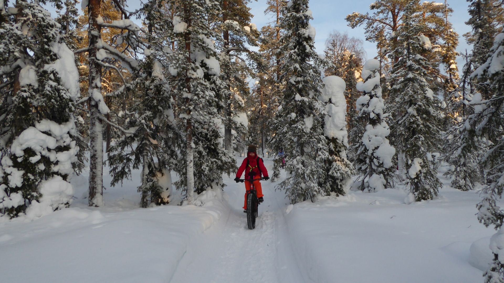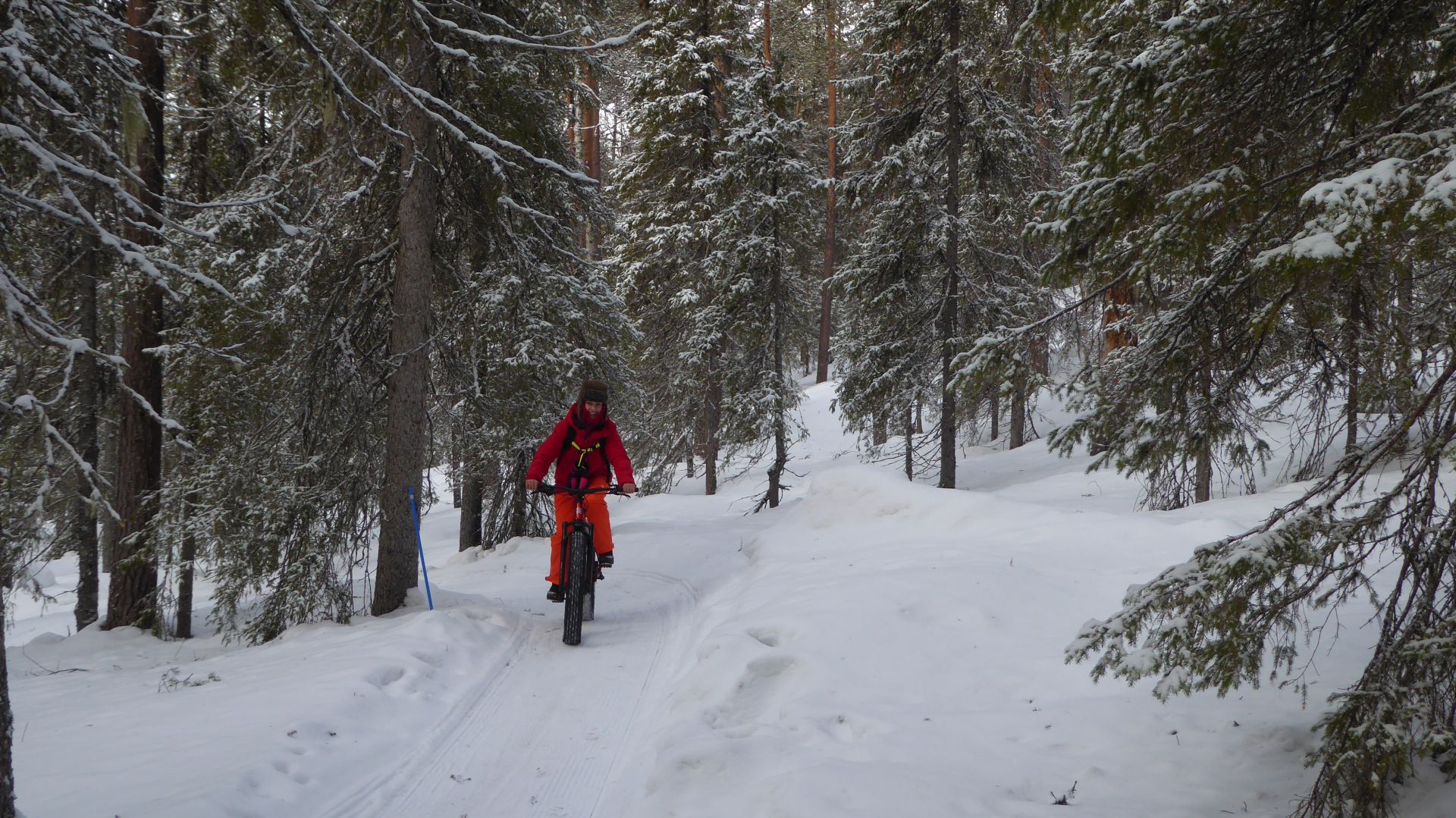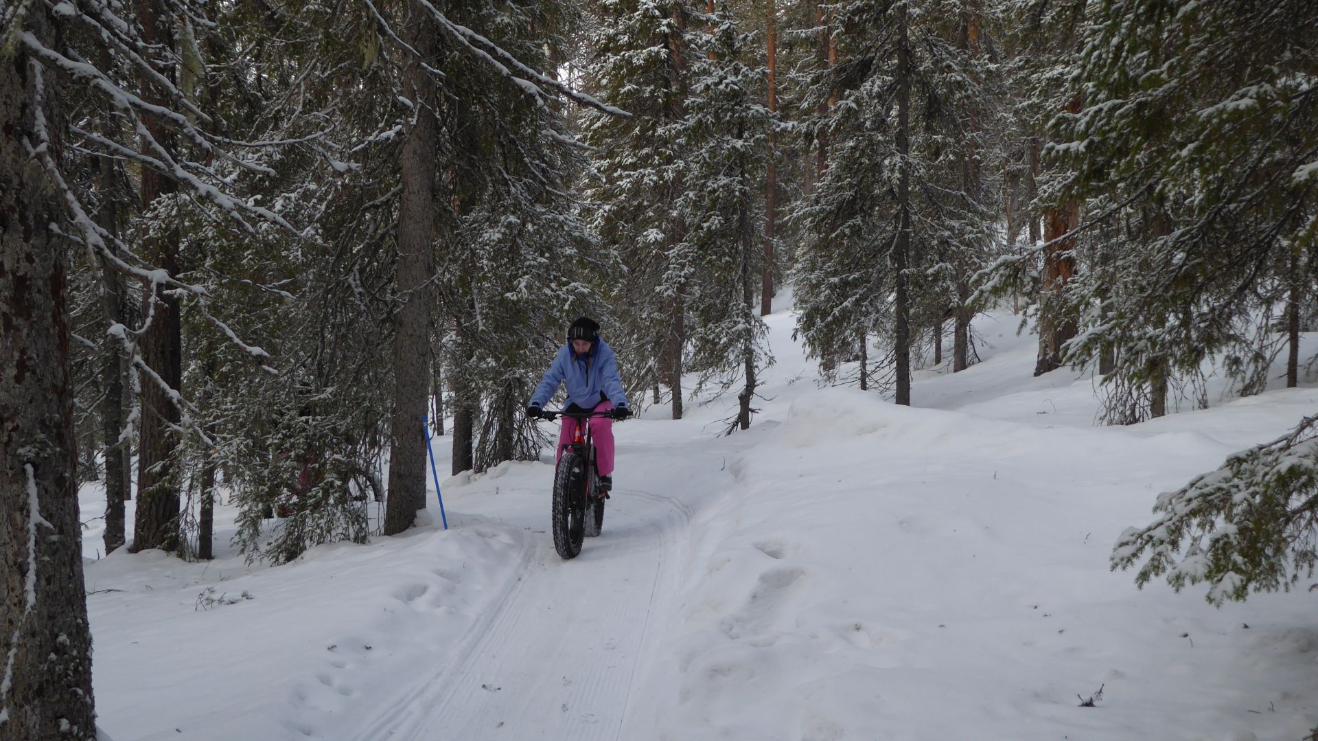 Une petite halte au café pour profiter de l'ambiance très sympa et boire un jus de baies chaud nous prépare pour la suite du trajet, a priori pas trop difficile. Mais la neige fraîche partiellement tassée par le passage d'autres vélos rend le parcours un peu plus technique que prévu et provoque quelques chutes dans la neige beaucoup plus amusantes que méchantes.