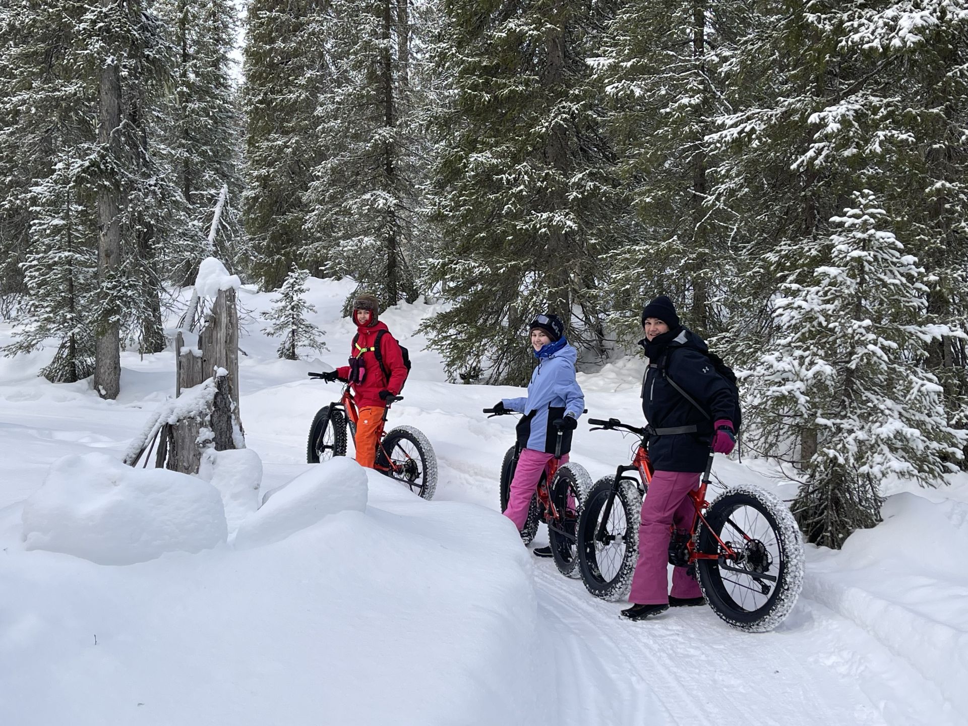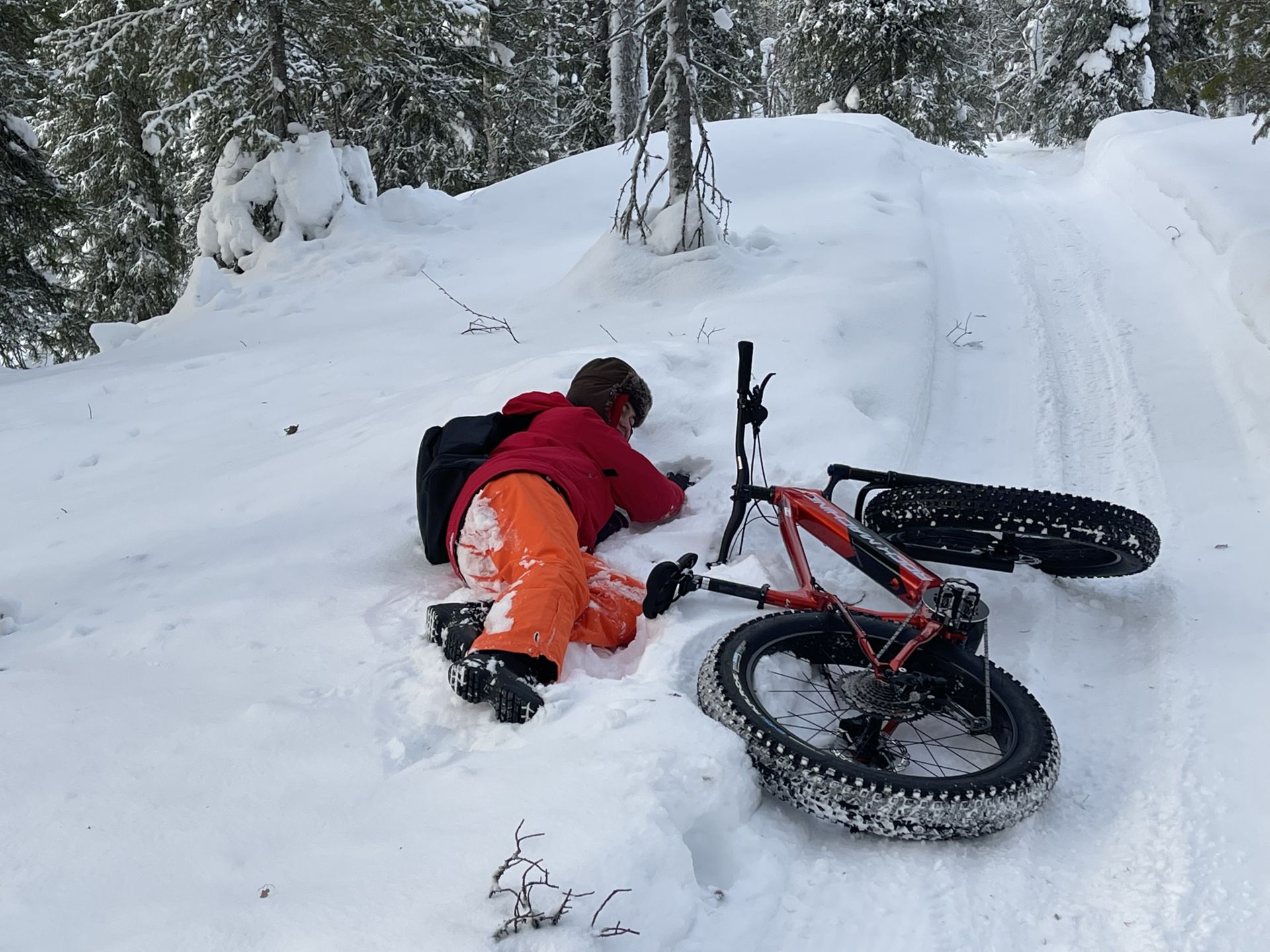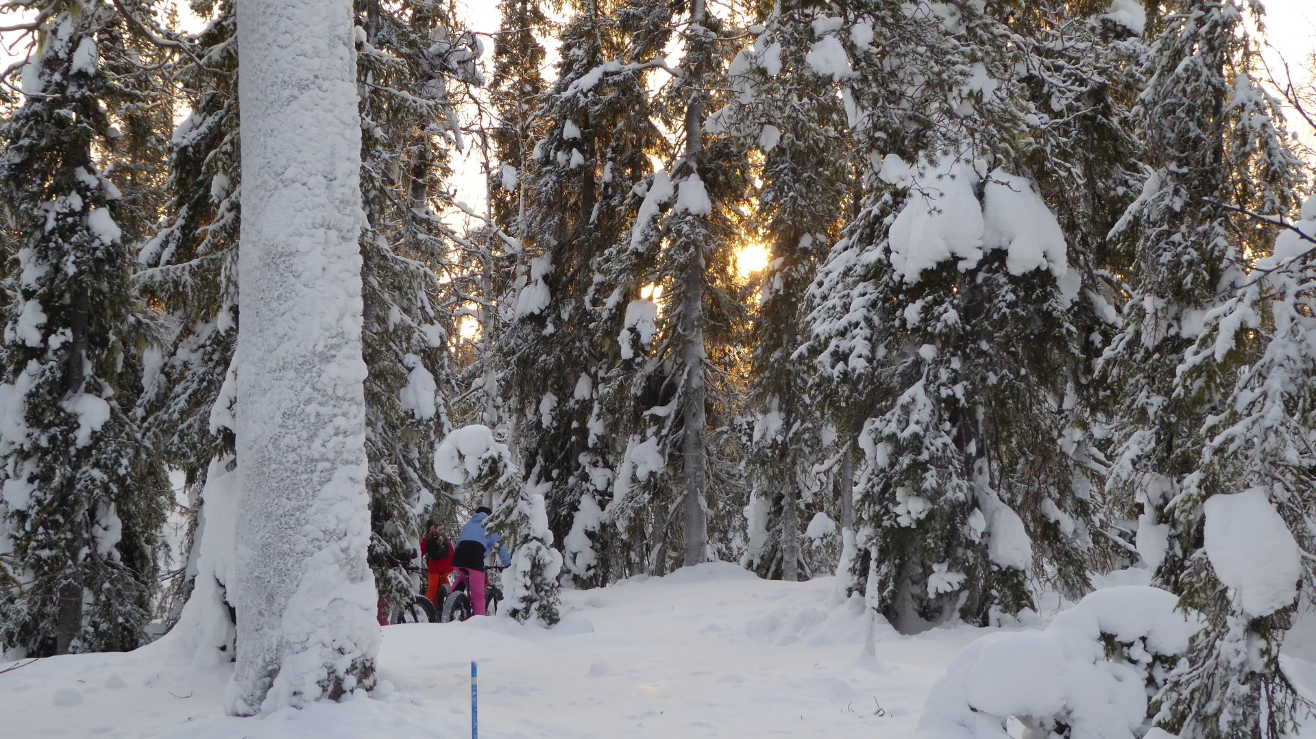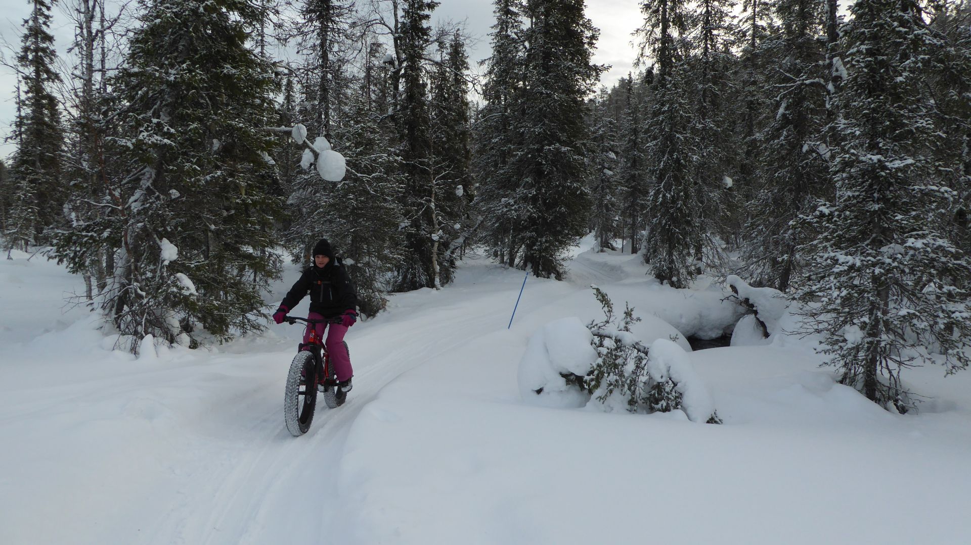 Une petite halte au café pour profiter de l'ambiance très sympa et boire un jus de baies chaud nous prépare pour la suite du trajet, a priori pas trop difficile. Mais la neige fraîche partiellement tassée par le passage d'autres vélos rend le parcours un peu plus technique que prévu et provoque quelques chutes dans la neige beaucoup plus amusantes que méchantes.