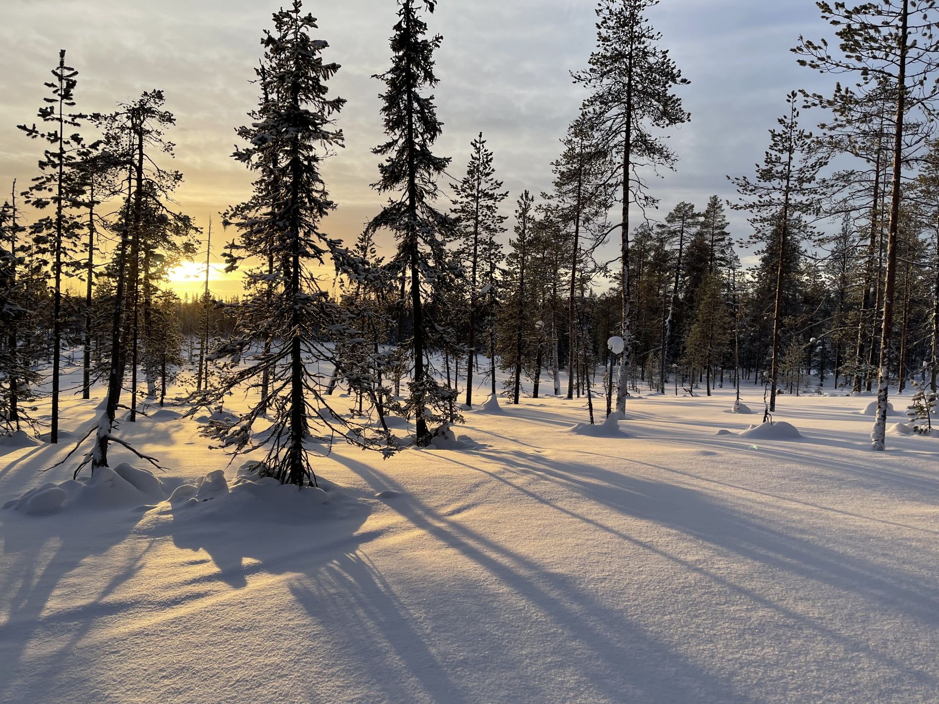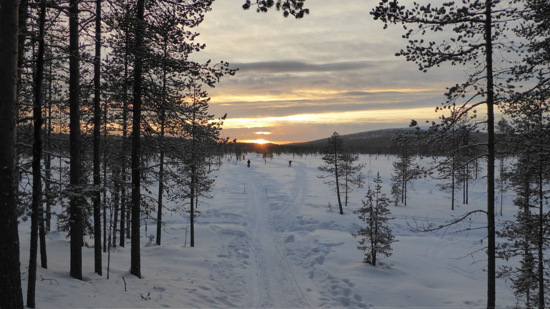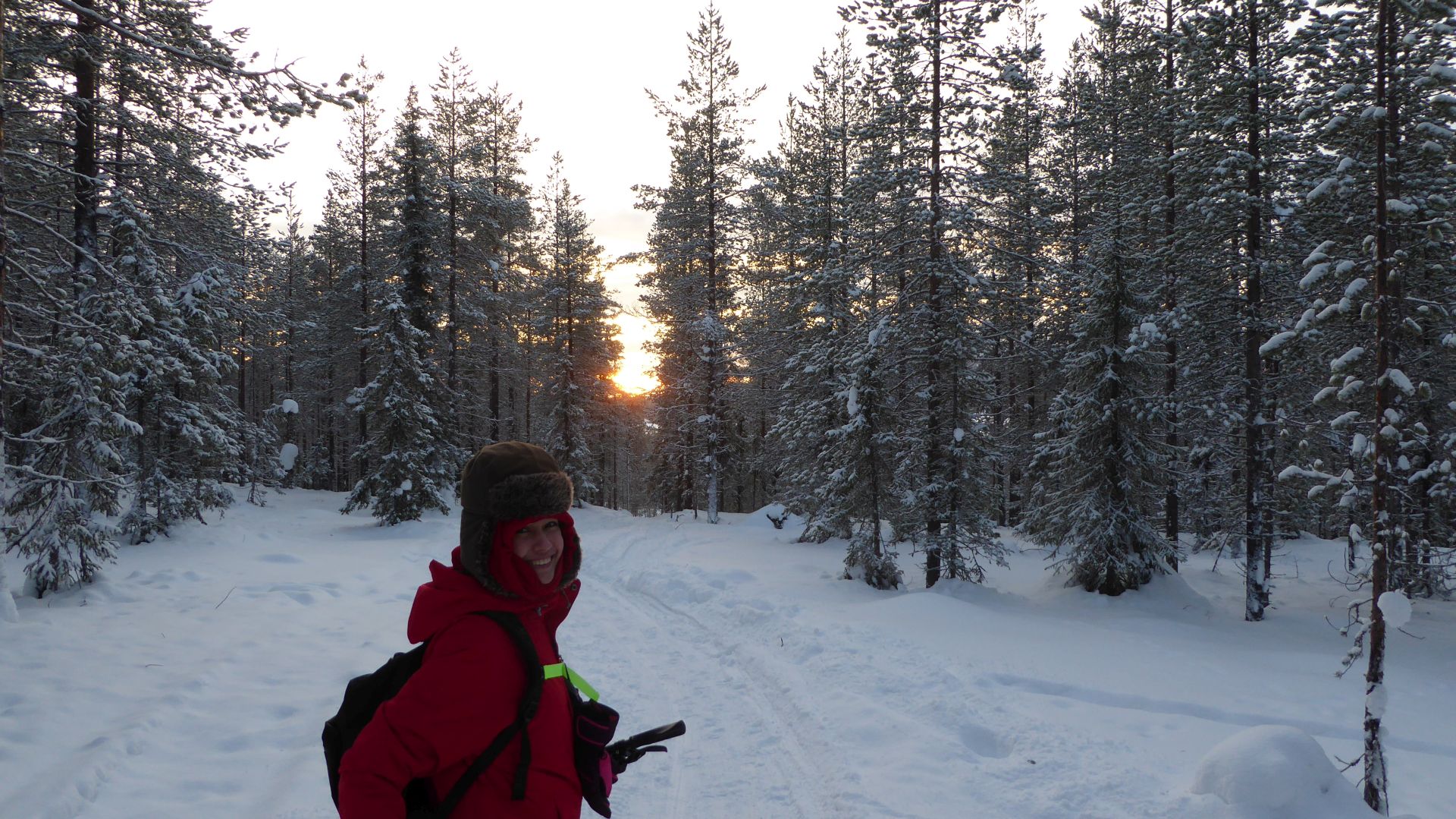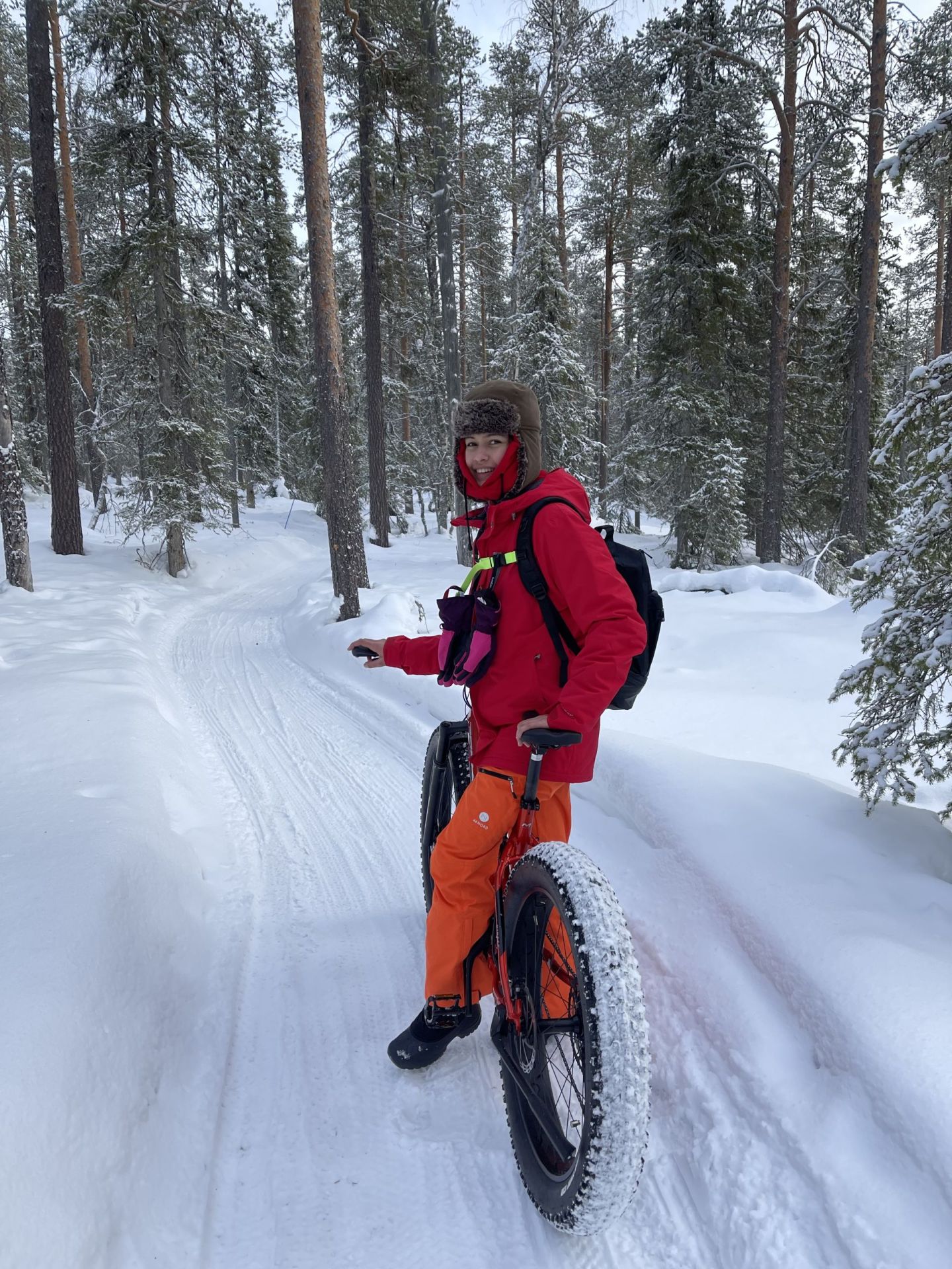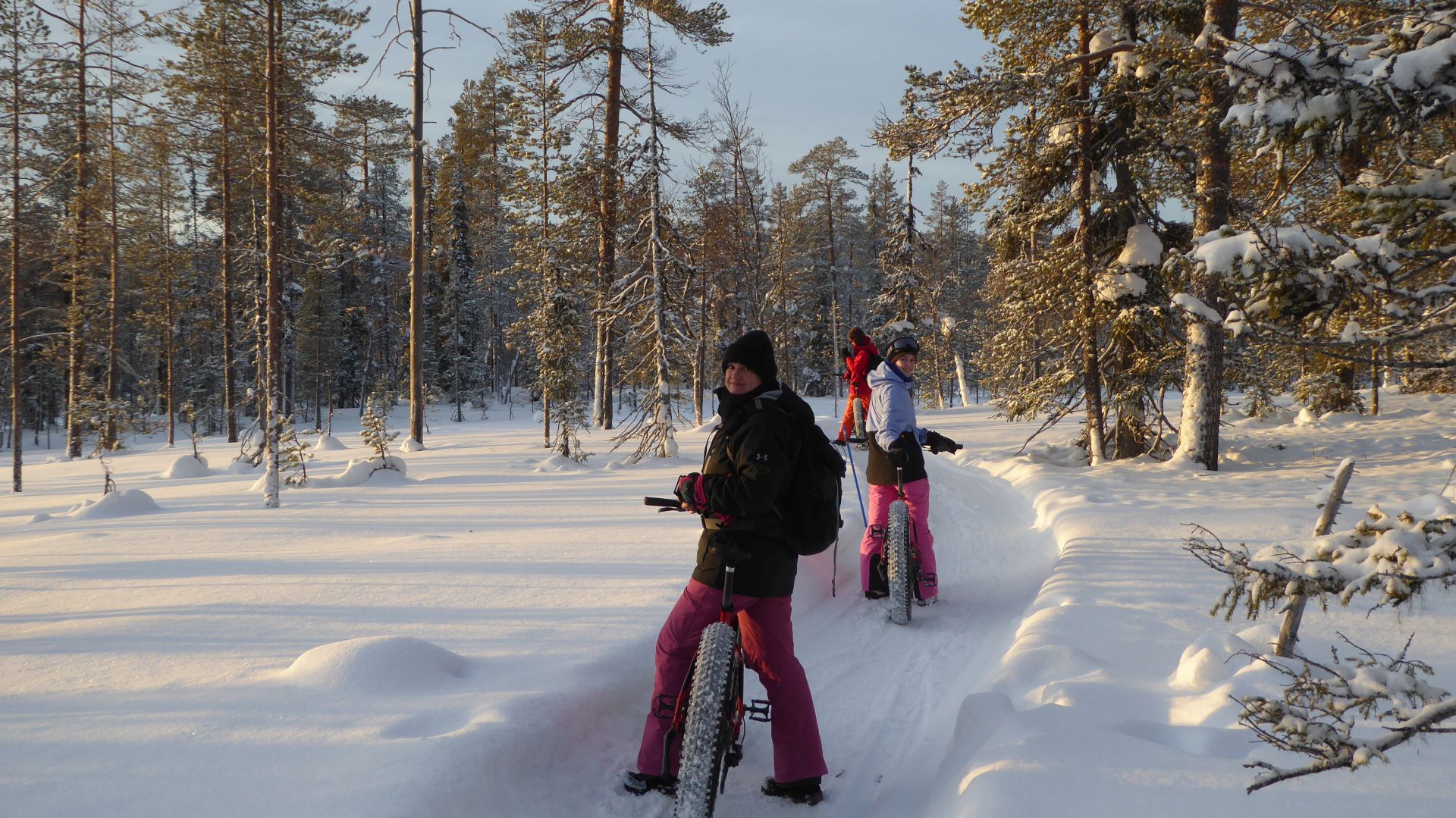 Avec le sommeil en retard, la première soirée "aurores boréales" et quelques activités sportives, le réveil est un peu laborieux que prévu. La météo peu engagente pour le tour en vélo que nous envisageons ne nous motive pas plus que ça. Finalement, vers 11h après un petit déjeuner tardif nous nous mettons en route direction le magasin de sport pour louer des vélos. Le temps a l'air de vouloir s'améliorer et le paysage fraichement enneigé nous redonne envie de bouger.