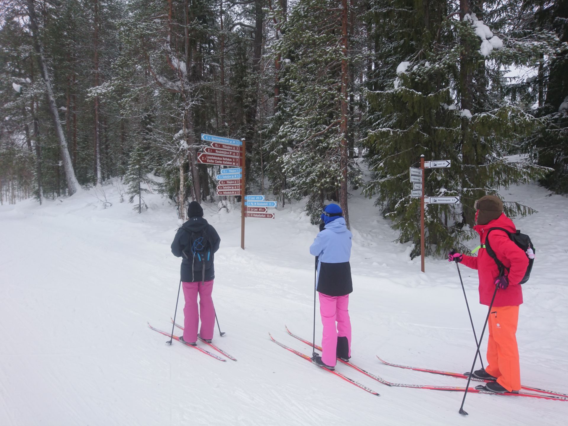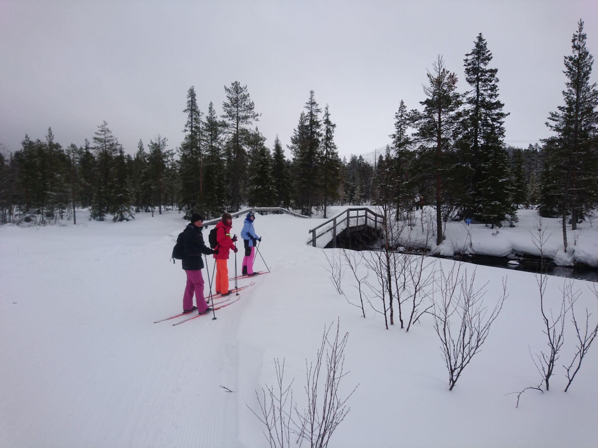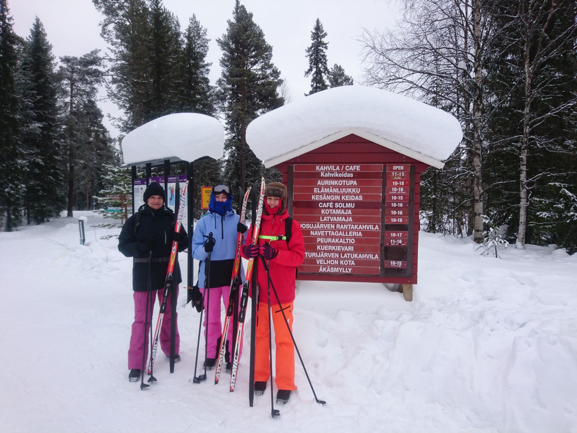 Avec le peu de lumière ambiante et sans réveil, il est difficile de se lever avant 9h30. Le temps de prendre un bon petit déjeuner et de s'équiper il est déjà passé 11h. Mais le ciel nuageux et les quelques flocons qui flottent dans l'air ne nous poussent pas à nous dépecher de sortir. Nous reprenons la voiture jusqu'à l'hôtel Äkashotelli où nous chaussons nos ski de fond. Nous partons en direction de Kesänginkeidas et si les cloques le permettent nous irons jusqu'à Latvamaja.