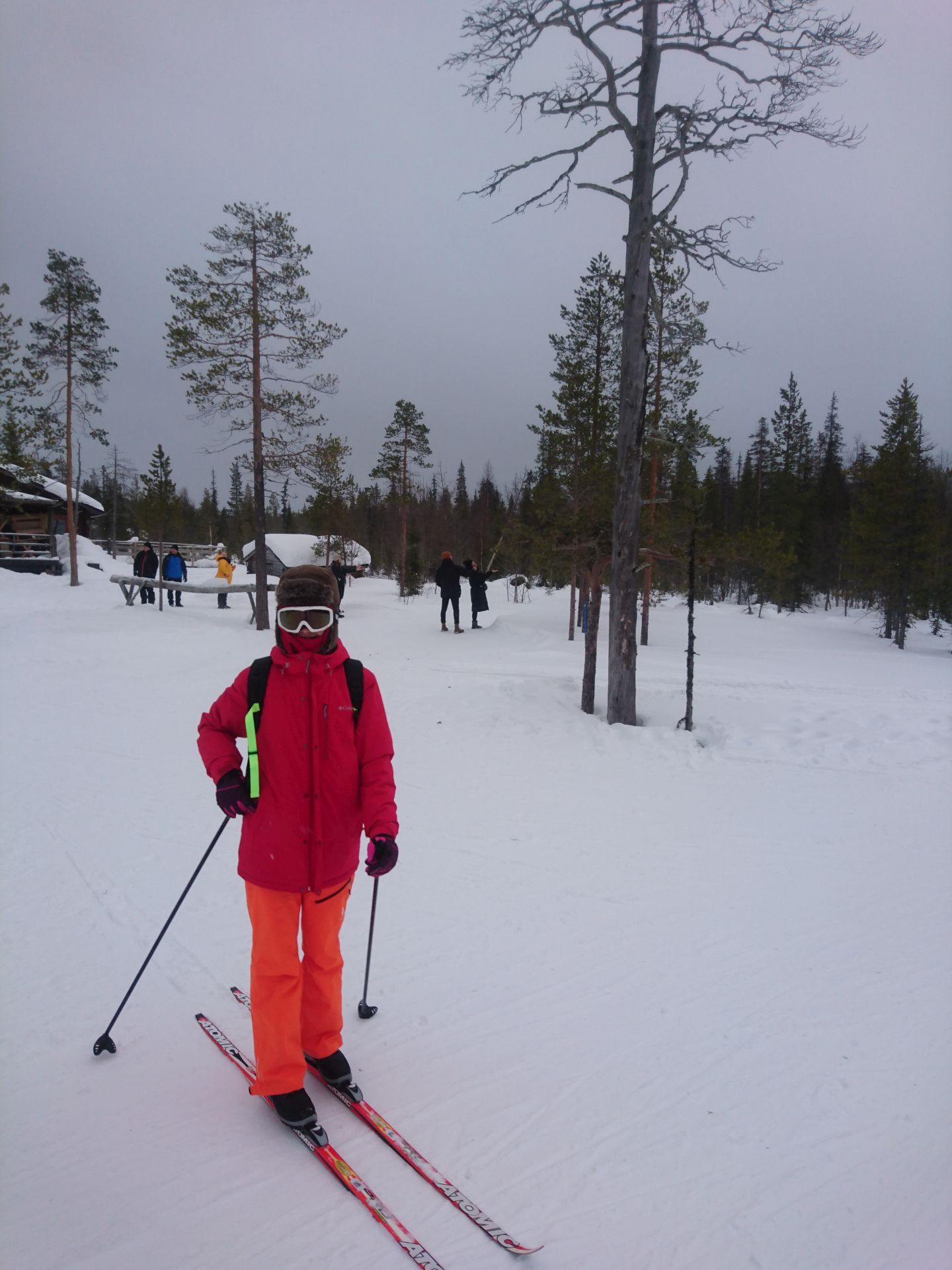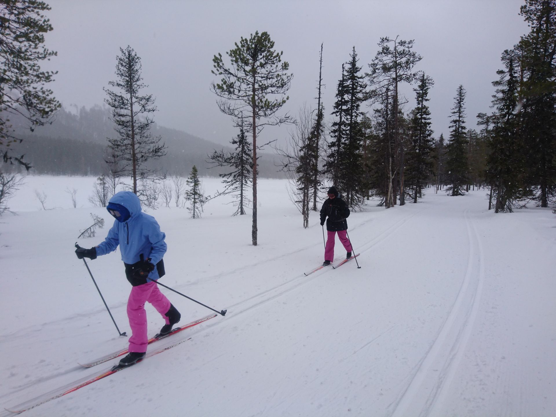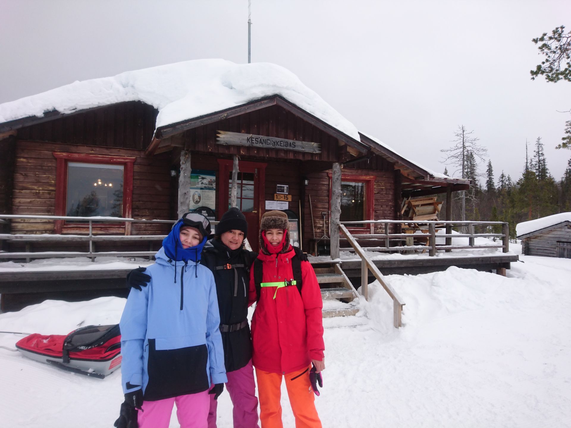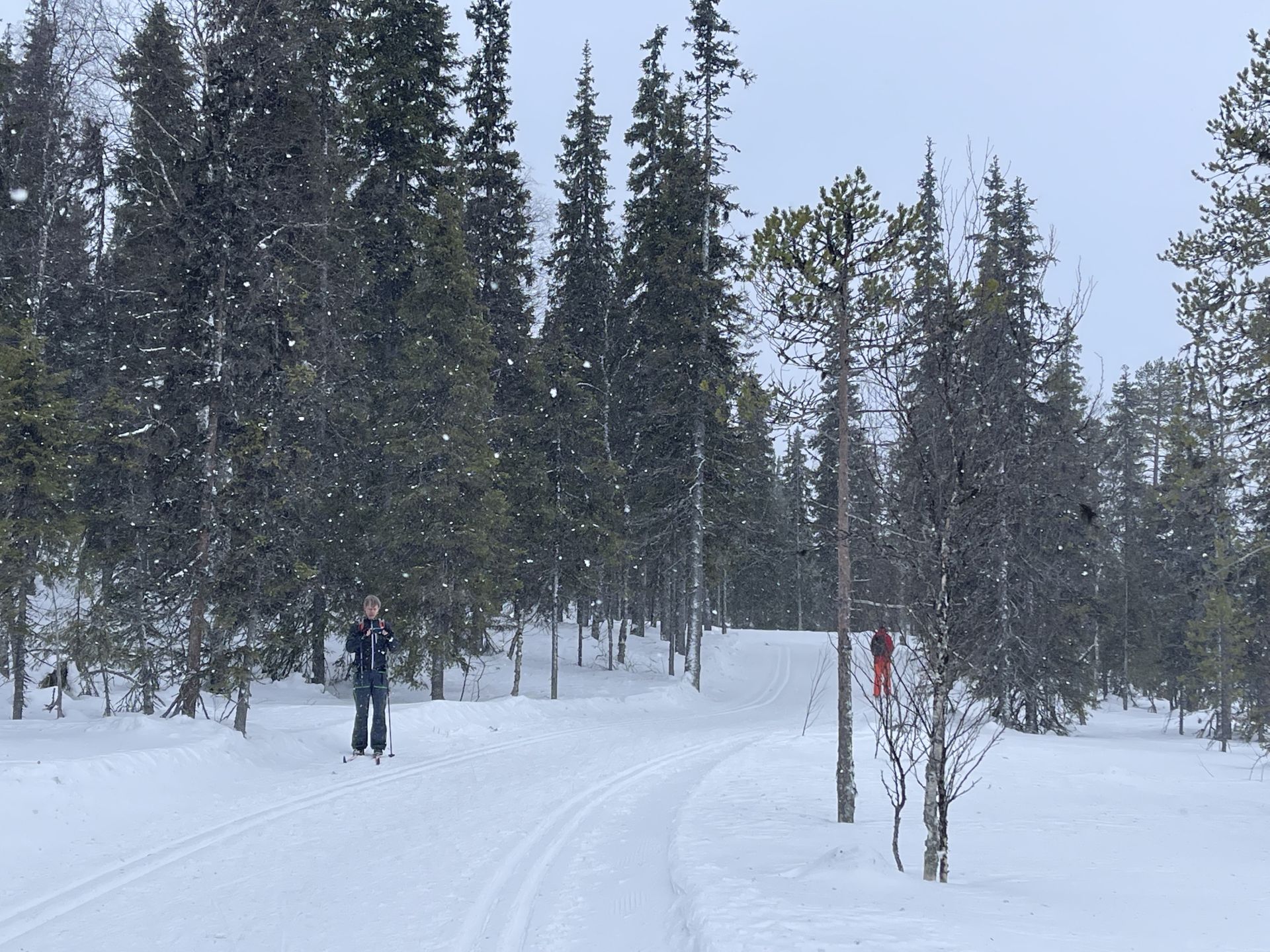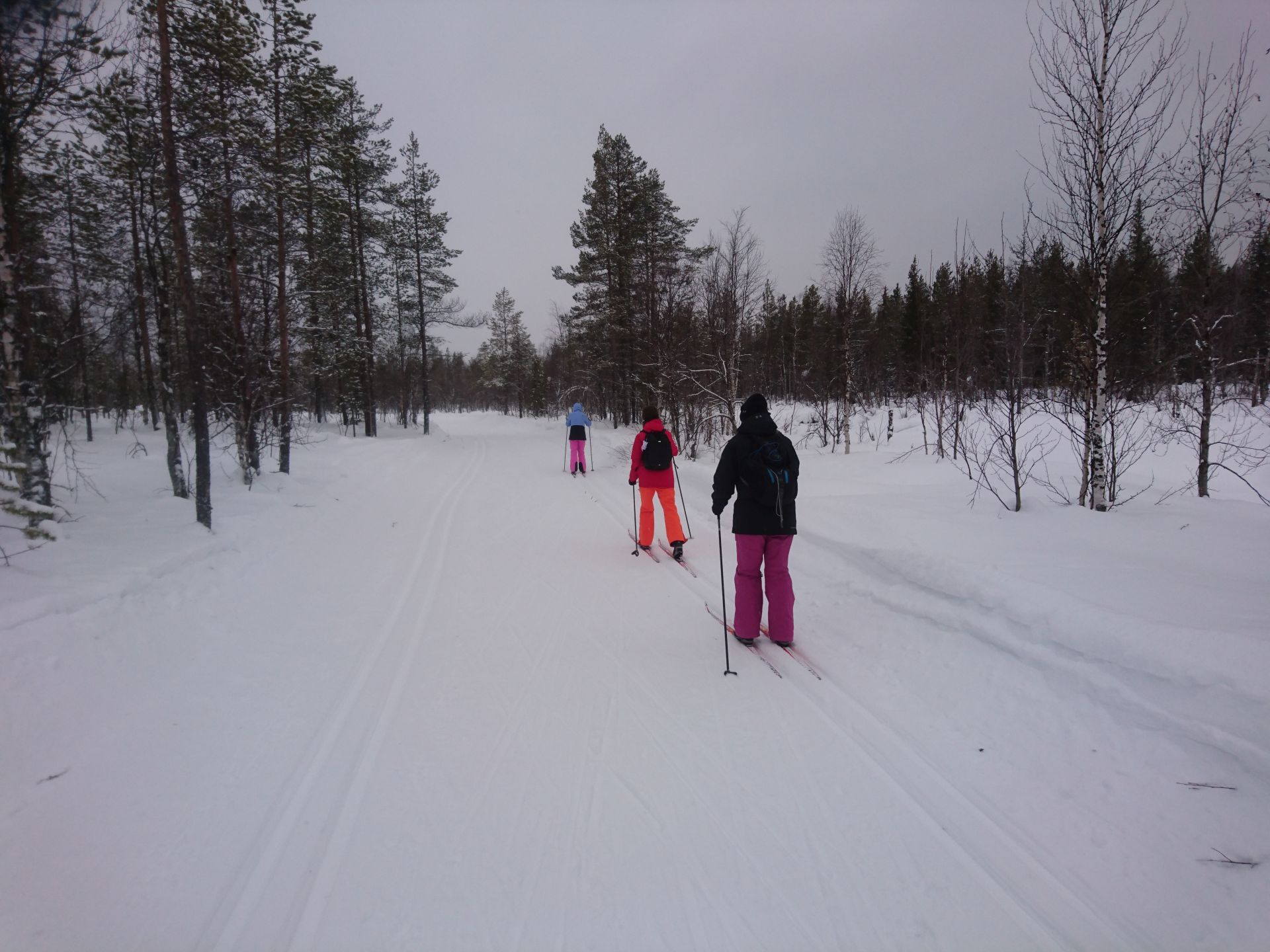 Sans les arbres, nous aurions droit à un super jour blanc. Dans les passages plus dégagés, tout devient plat... même si le terrain monte. Mais l'ambiance générale est très agréable et appaisante. Quelques bourrasques viennent ponctuer notre trajet et nous rappeler que nous sommes bien dans le Nord. Moins d'une heure plus tard nous arrivons à Kesänginkeidas. Après une petite pause et un jus chaud, les cloques se faisant toujours bien sentir, nous choisissons de revenir en direction d'Äkäslompolo.
