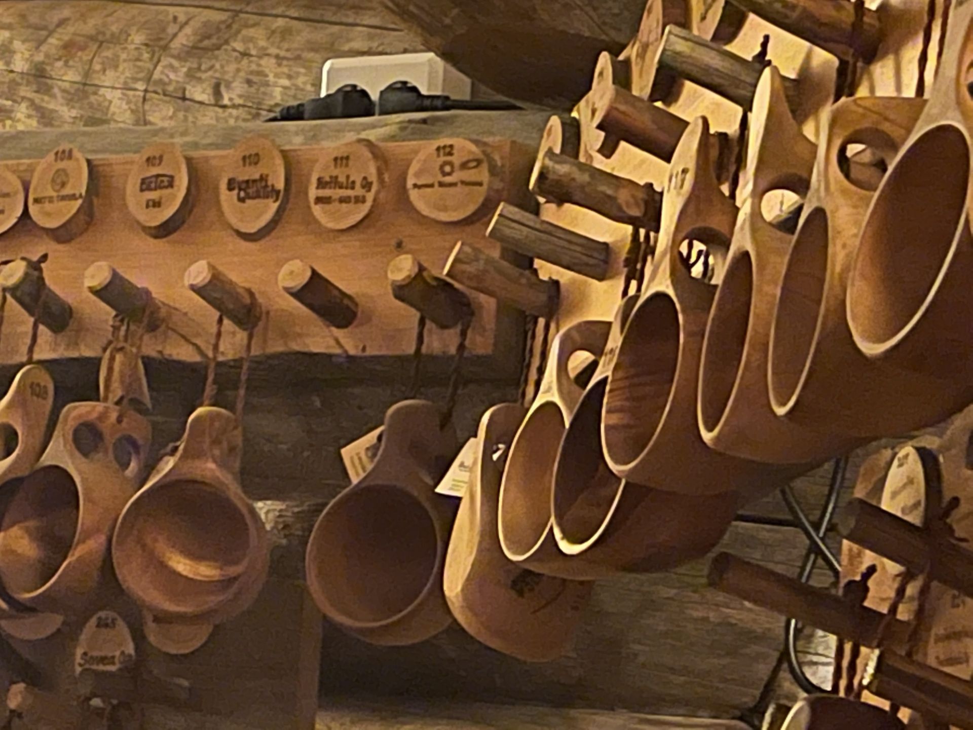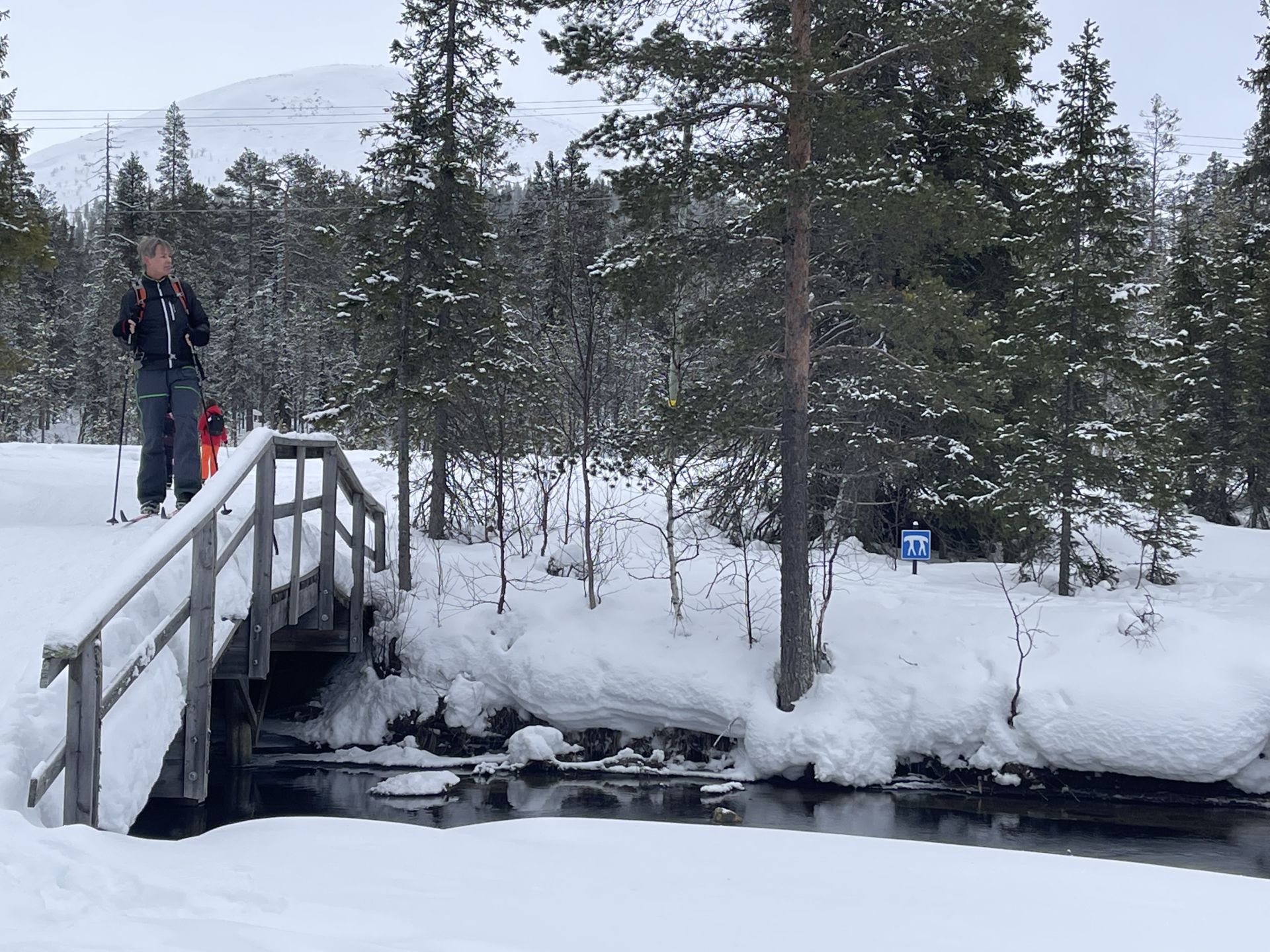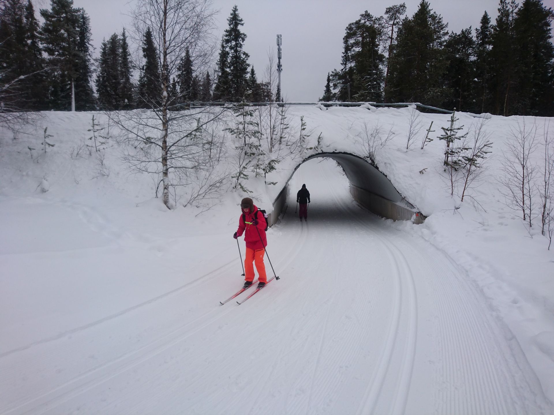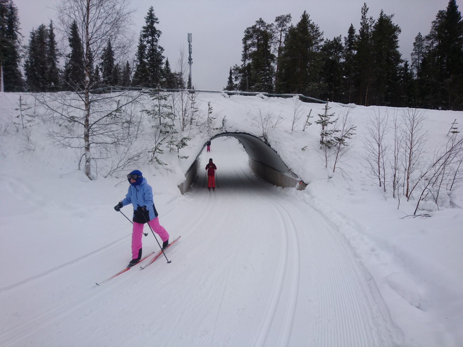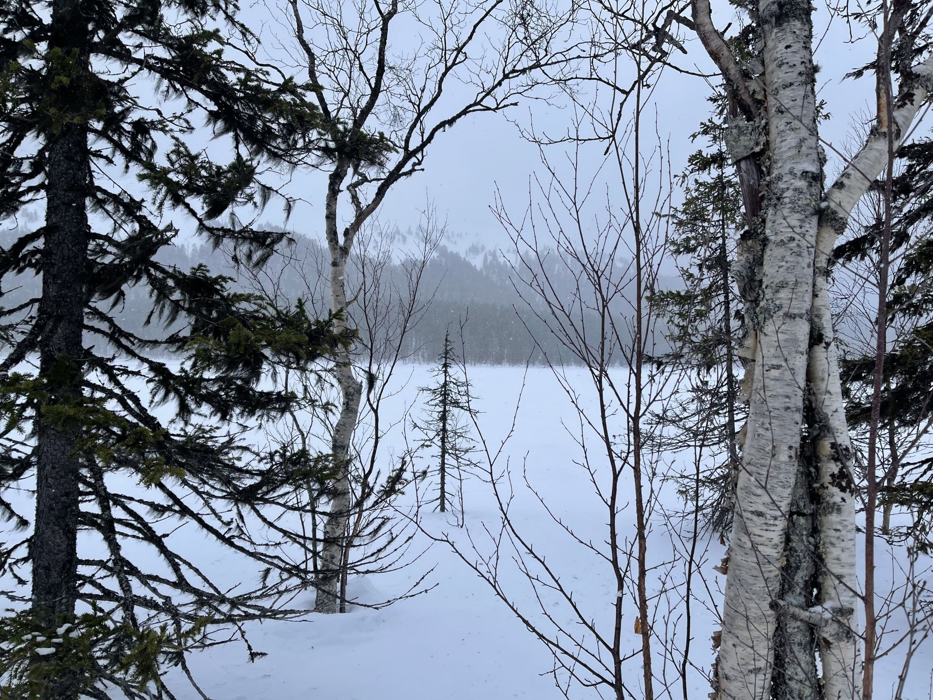 Sans les arbres, nous aurions droit à un super jour blanc. Dans les passages plus dégagés, tout devient plat... même si le terrain monte. Mais l'ambiance générale est très agréable et appaisante. Quelques bourrasques viennent ponctuer notre trajet et nous rappeler que nous sommes bien dans le Nord. Moins d'une heure plus tard nous arrivons à Kesänginkeidas. Après une petite pause et un jus chaud, les cloques se faisant toujours bien sentir, nous choisissons de revenir en direction d'Äkäslompolo.