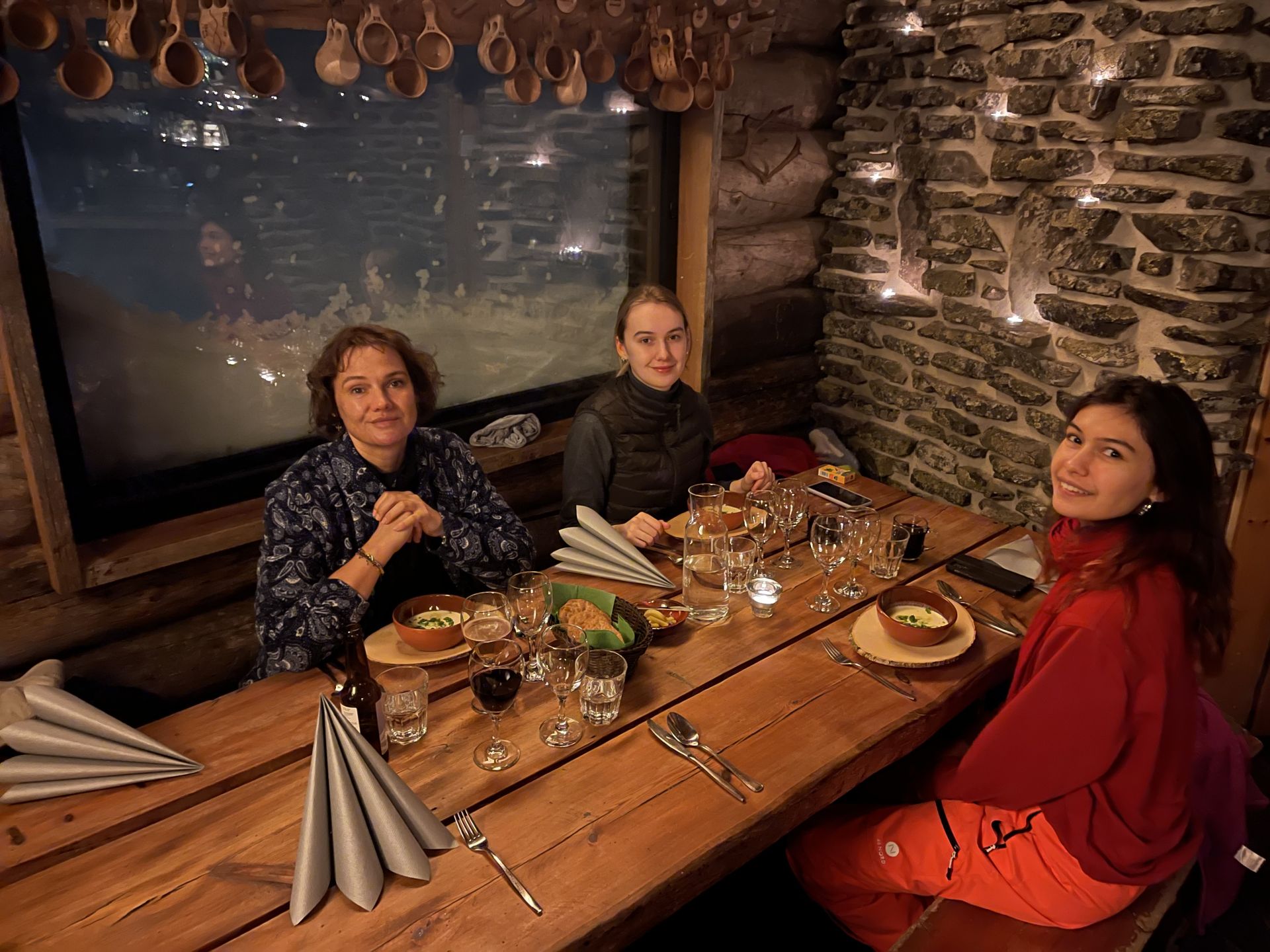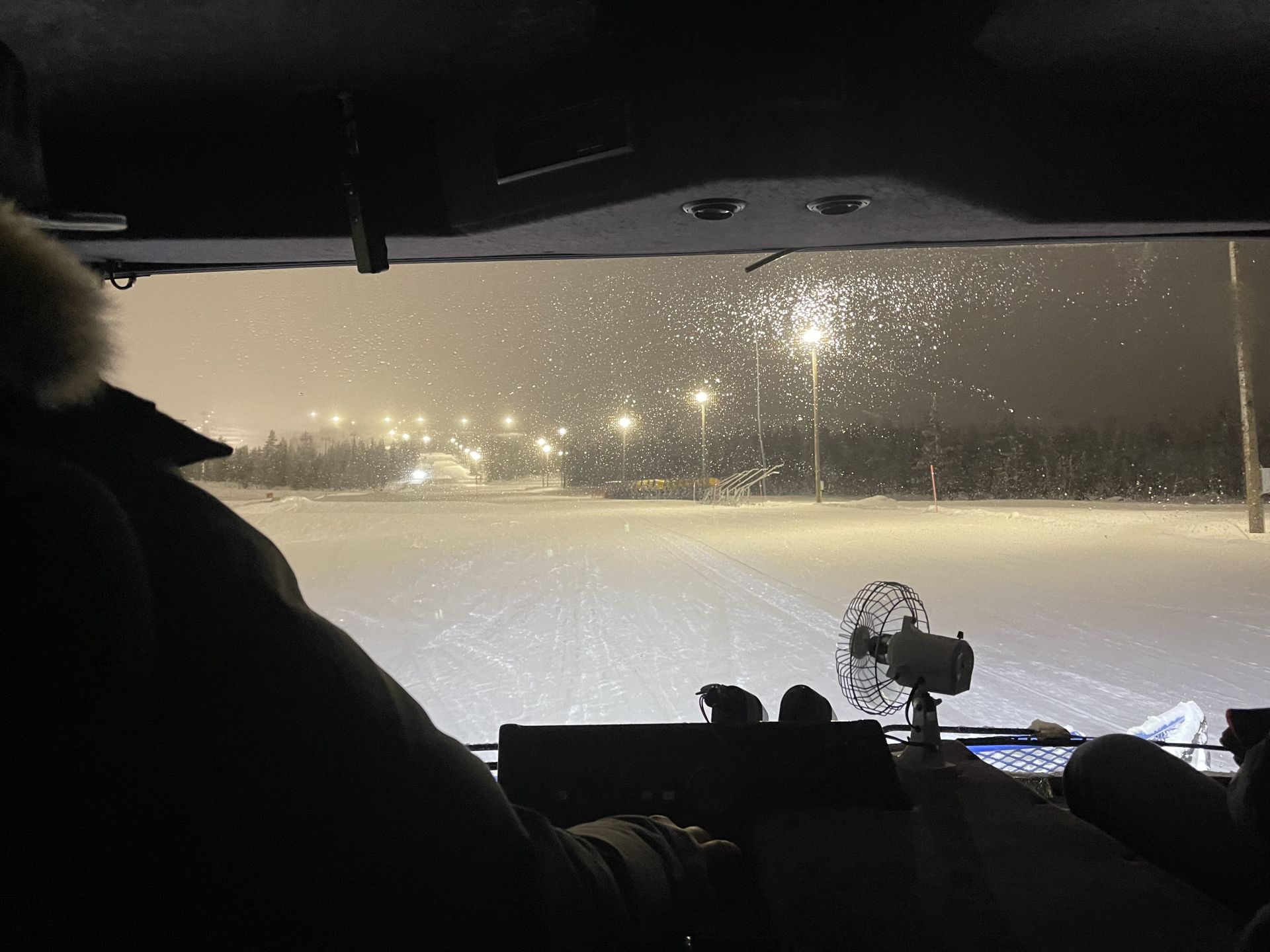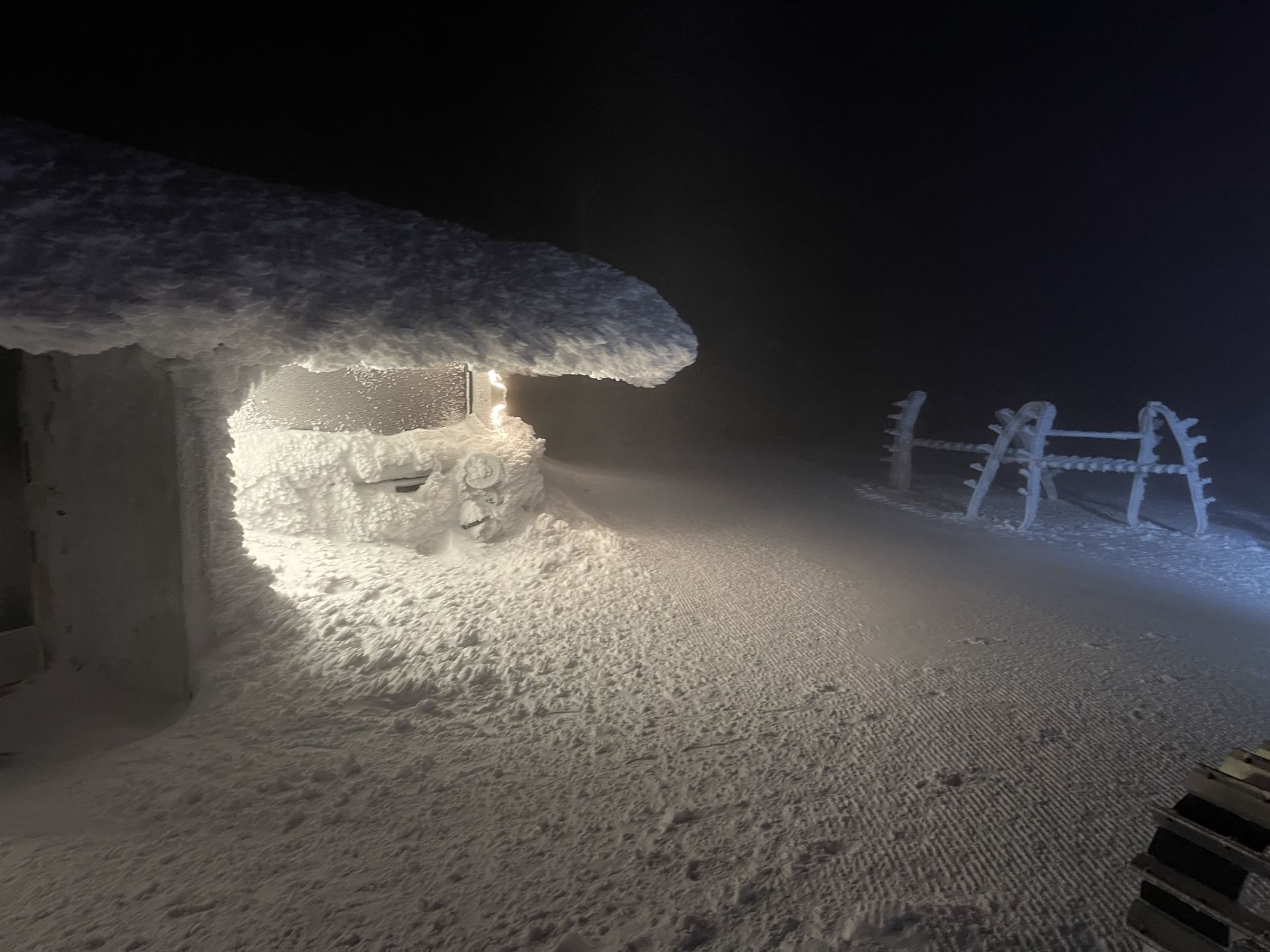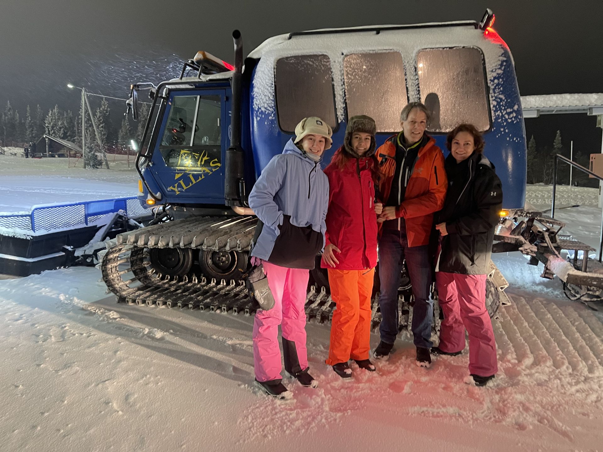 La météo a tourné à la neige et la route est bien blanche. Le vent pousse quelques congères qui n'empêchent pas notre chauffeur de nous conduire jusqu'à Ylläsjärvi ou nous changeons de véhicule. La montée en ratrac de nuit, avec du vent et des chutes de neige nous mettent bien dans l'ambiance "hiver". Notre petit groupe de 12 personnes est accueilli au sommet du Ylläs par le personnel du restaurant ouvert spécialement pour nous. On nous souhaite la bievenue dans le restaurant le plus haut de finlande... à 718m d'altitude. Le repas en 3 plats est très bon. Une soupe de navet pour l'entrée, un emincé de renne sur lit de purée de patate agrémenté d'airelles et de pickels de concombre pour plat principal et un gâteau au chocolat accompagé de glace vanille et coulis de framboise pour finir. Bon appétit!