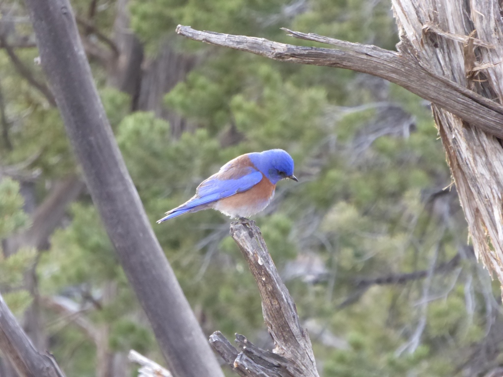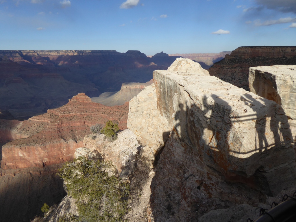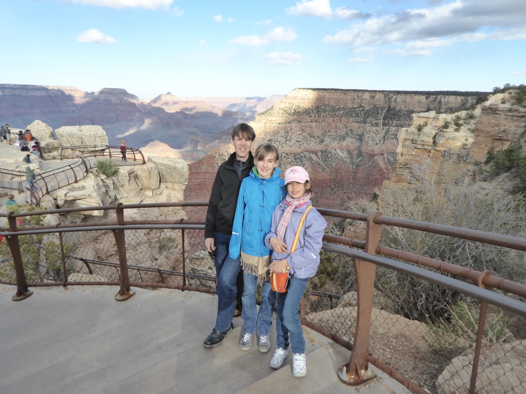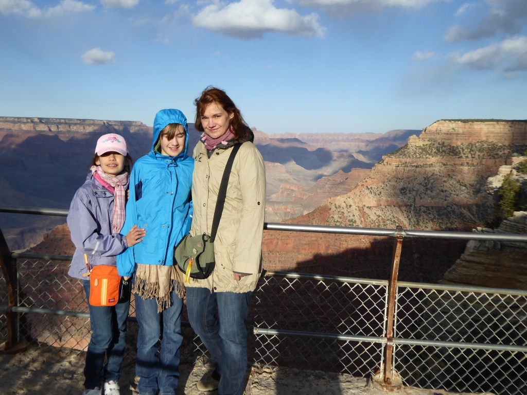 Retour sur la route, qui monte de plus en plus. Le paysage change, et devient plus vert, mais on remarque que la région souffre de sécheresse. Le village de Grand Cayon est à plus de 2000m et au milieu de forêts de pins. La température devient vraiment fraîche (~6°C) et le vent tempétueux rend l'ambiance glaciale. Ce qui ne nous arrête pas et après avoir enfilé nos vestes et jaquettes, nous profitons de la lumière de fin de journée pour une première découverte du Canyon. Nous sommes tous ébahis par le spectacle qui s'offre à nous.