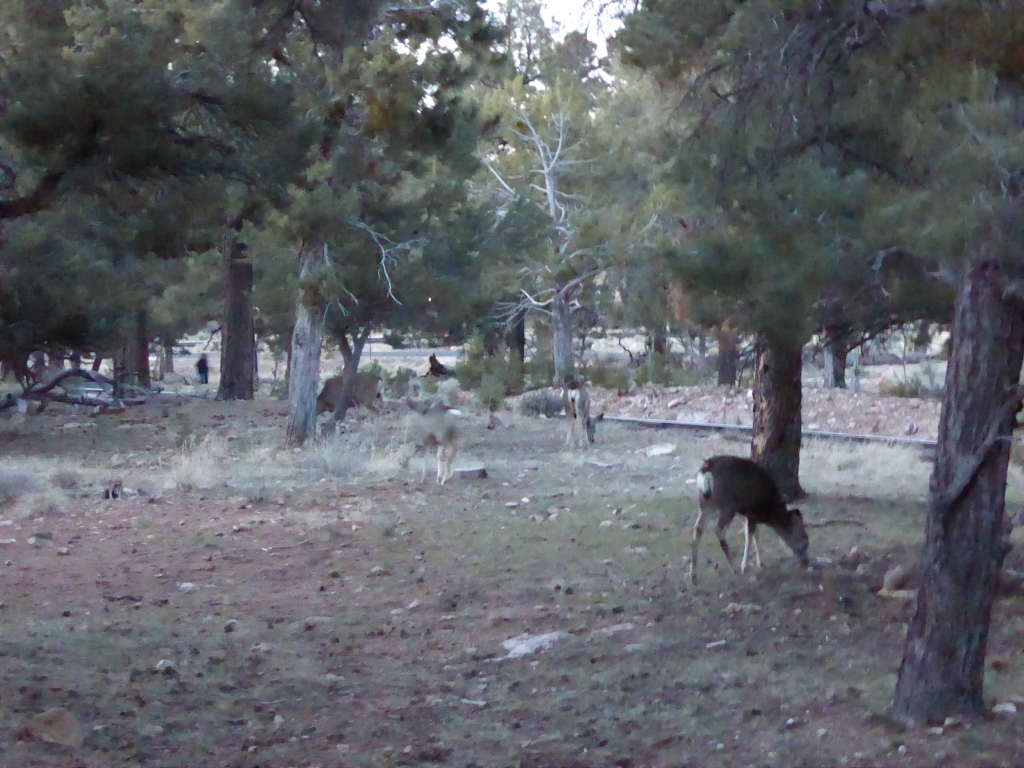Une surprise nous attend encore, quand Yannick sort pour aller chercher quelque chose dans la voiture, il reste bouche bée: une horde de daims (Mule Deers) est à quelques mètres de la porte d'entrée, en train de brouter paisiblement sous les pins. Il fait déjà sombre et les photos ne sont pas des meilleures, dommage.