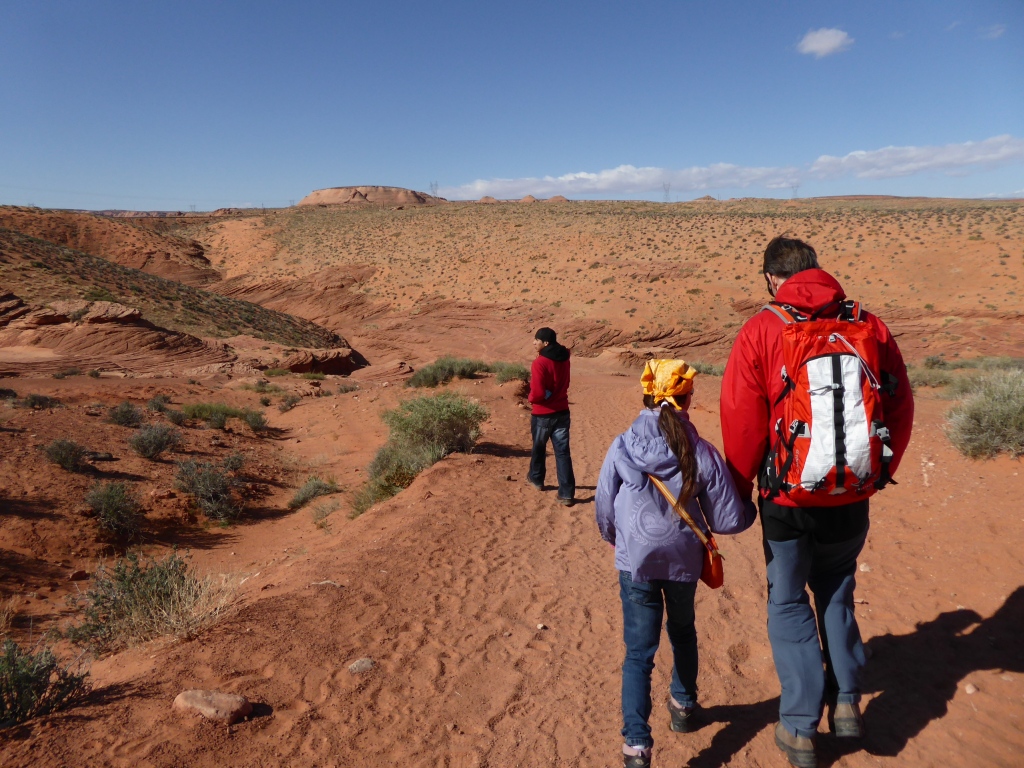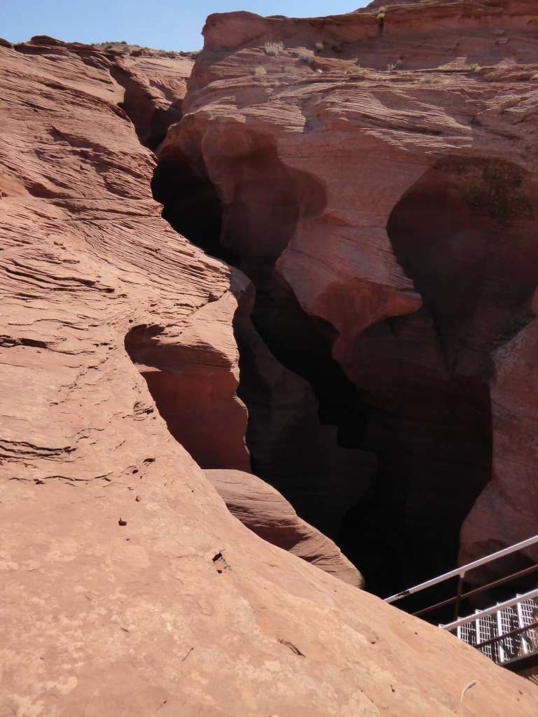 Selon Tony, le gérant du motel, il faut visiter Lower Antelope Canyon le matin et Upper Antelope Canyon vers midi pour profiter de la meilleure lumière. Nous suivons son conseil et à 9h20, après avoir déboursé 88$ (6$ par personne de taxe pour l'accès au territoire Navajo et 64$ pour la visite guidée), nous partons à la suite de notre guide indien sur un plateau désertique et plat. Une dizaine de minutes de marche plus loin, nous arrivons devant une faille équipée d'escaliers métallique. Il faut vraiment être tout proche pour remarquer qu'il y a un canyon ici. Quatre volée d'escaliers plus tard, nous nous retrouvons dans la gorge étroite (slot canyon) de Lower Antelope, quelques 20 à 30m sous le niveau du plateau.