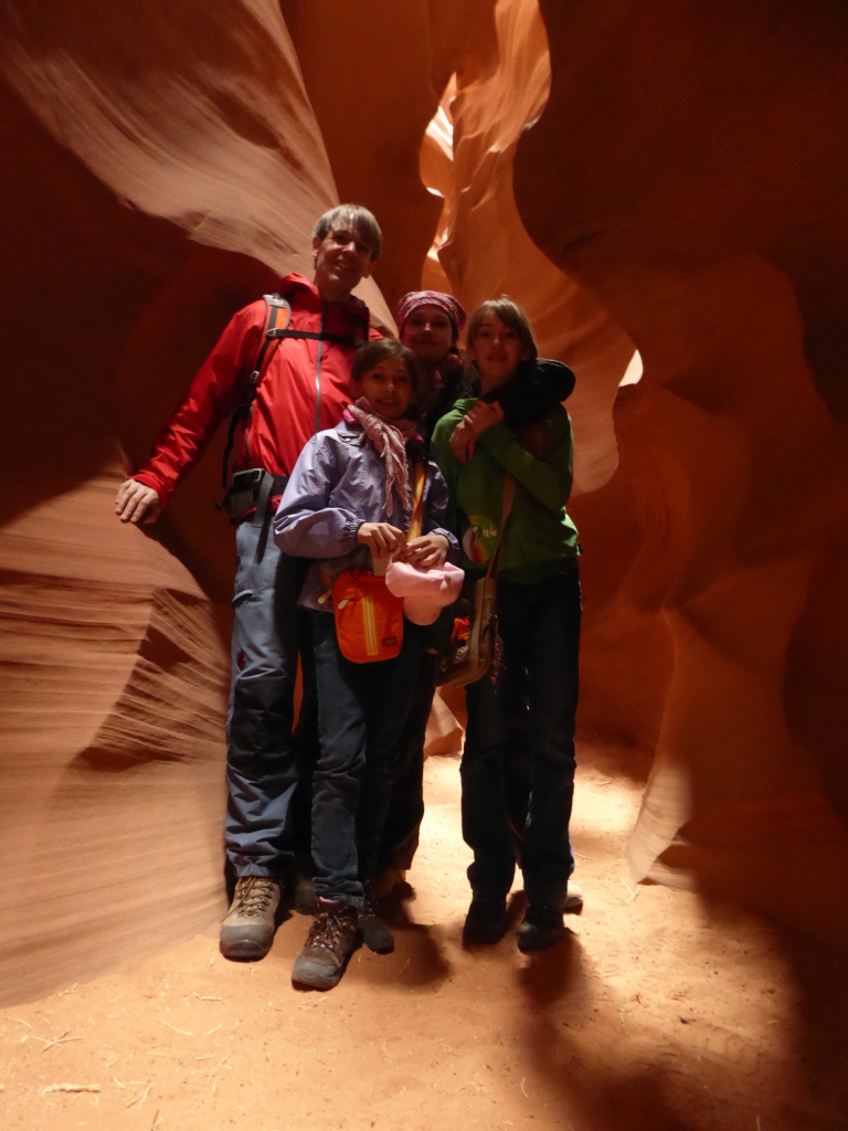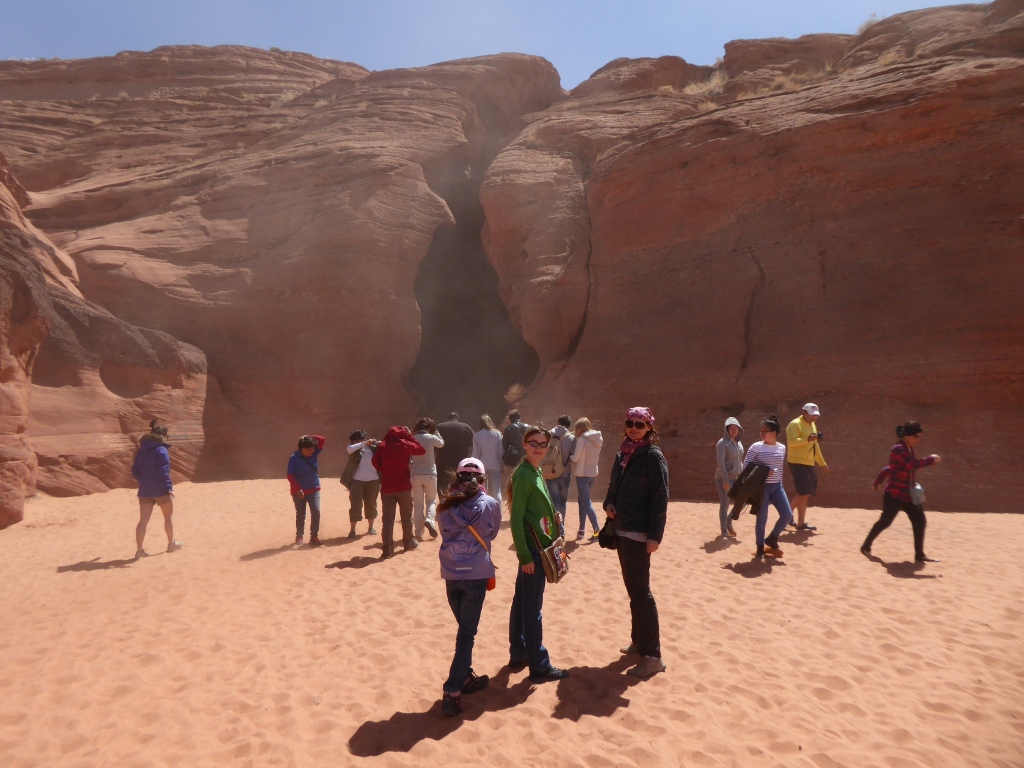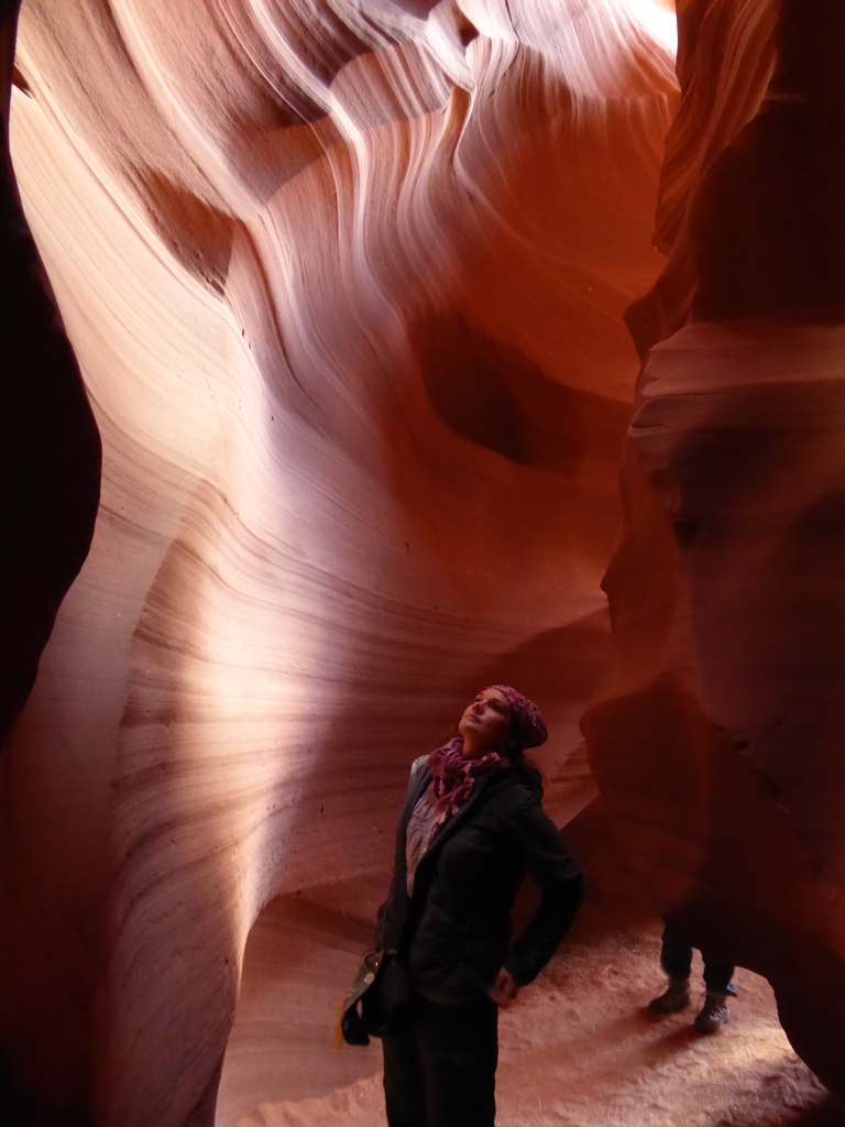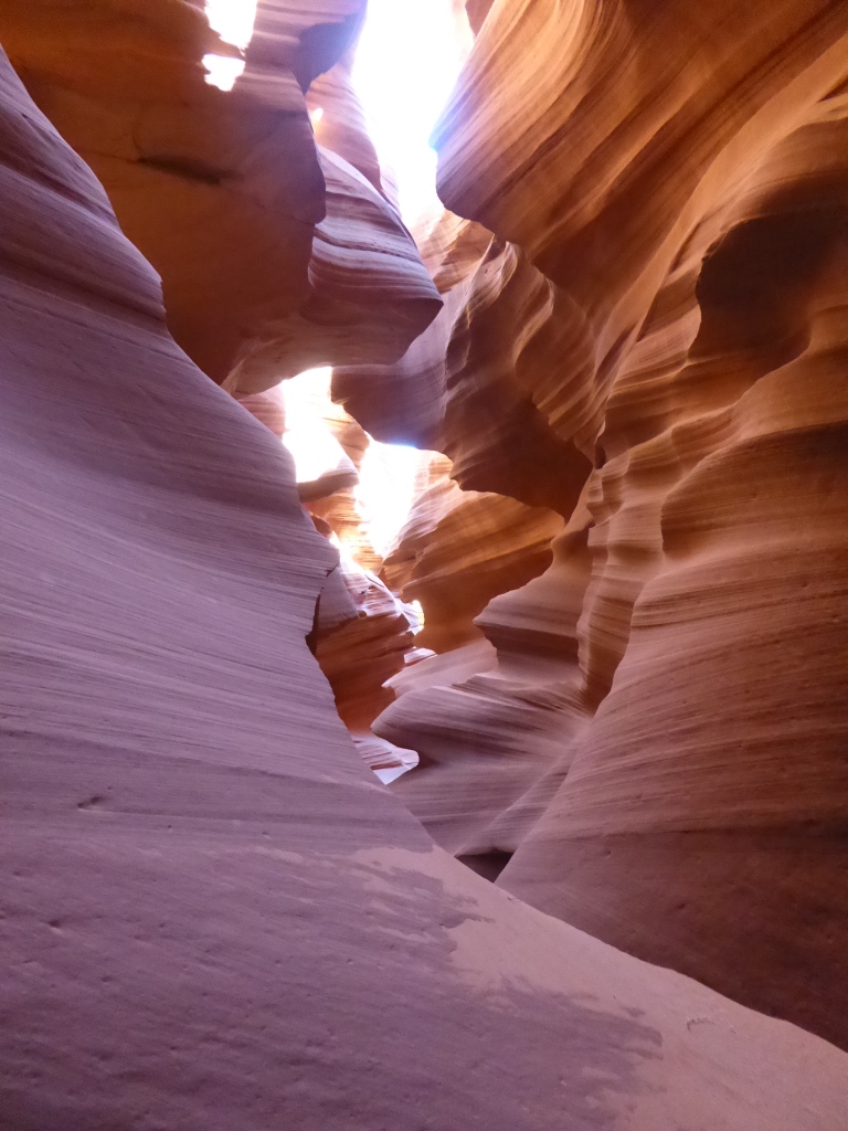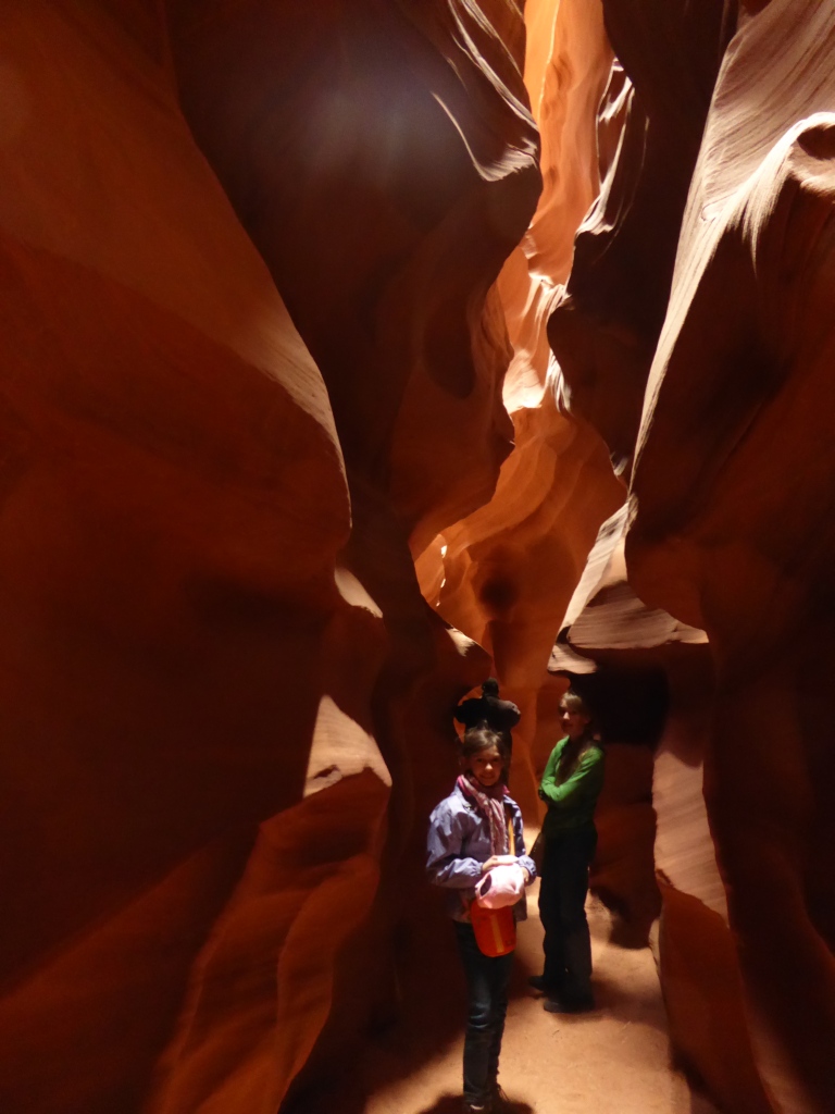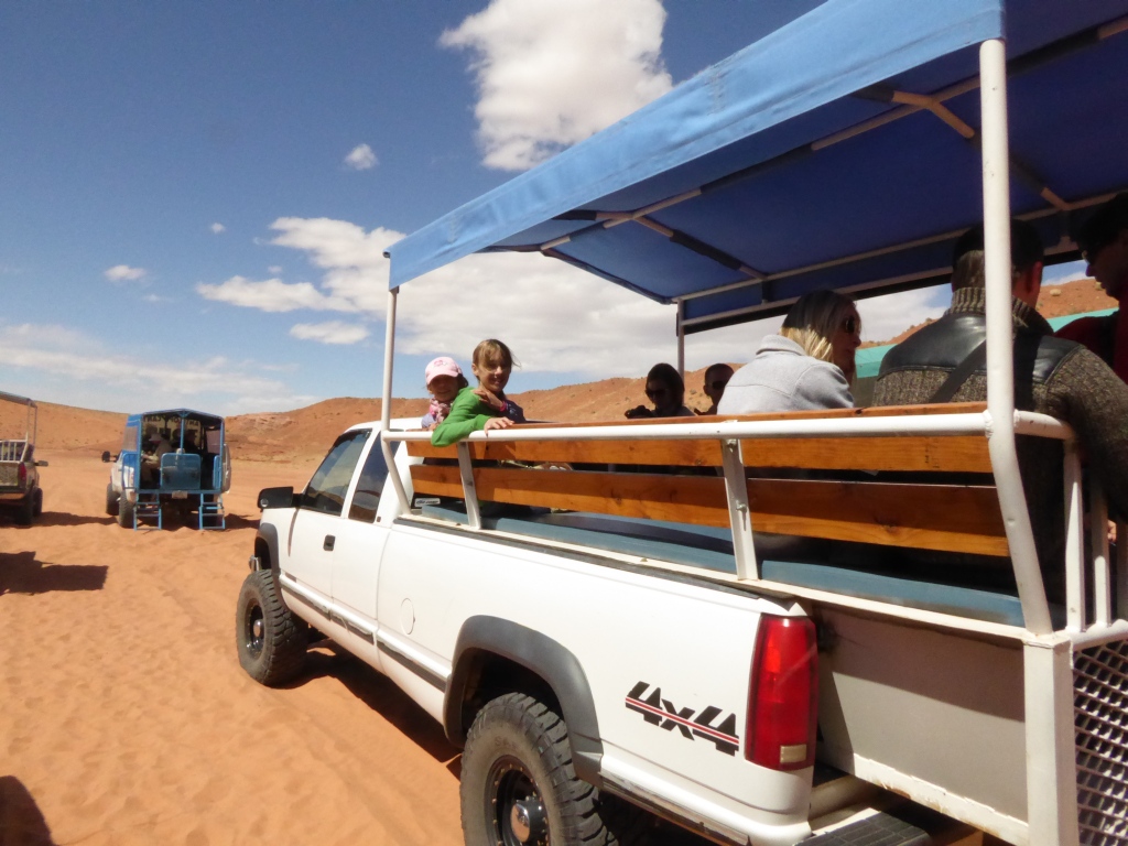 Puis nous reprenons la voiture pour traverser la Highway 98 et réserver à l'avance la visite d'Upper Antelope Canyon. La taxe Navajo est valable pour la journée, mais les visites pour les heures favorables (lightbeam hours, 11h, 12h et 13h) sont plutôt onéreuses et nous déboursons 120$ cette fois. Nous avons choisi le tour de 12h et il nous reste un peu plus d'une heure à patienter. Un petit (dé)tour en direction de la marina d'Antelope ou les 15$ d'entrée nous poussent à faire demi-tour et revenir en direction de Page afin d'acheter une bricole à manger. A 11h45 nous sommes de retour à l'entrée d'Upper Antelope Canyon et à 12h, notre guide navajo, Lance, nous fait monter à l'arrière d'un pick-up 4x4 aménagé avec des bancs et nous voilà parti pour 3miles de piste dans le lit asséché de la rivière Antelope. L'entrée du canyon est toute différente du précédent et nous nous retrouvons au pied d'une falaise de plus de 30m fendue par une gorge étroite. La visite est faite en aller-retour dans cette gorge magnifique et très différente de Lower Antelope Canyon. Le guide et très loquace et très agréable. Il nous donne plein de trucs pour réaliser de magnifiques photos et la visite, malgré un nombre important de groupes, est magique. Les 120$ pour le tour? Déjà oubliés (ou presque). Notre guide nous raconte plein d'anecdotes (clip de Britney Spears, tournage d'Indiana Jones, origines du nom, histoire et développement du canyon....).