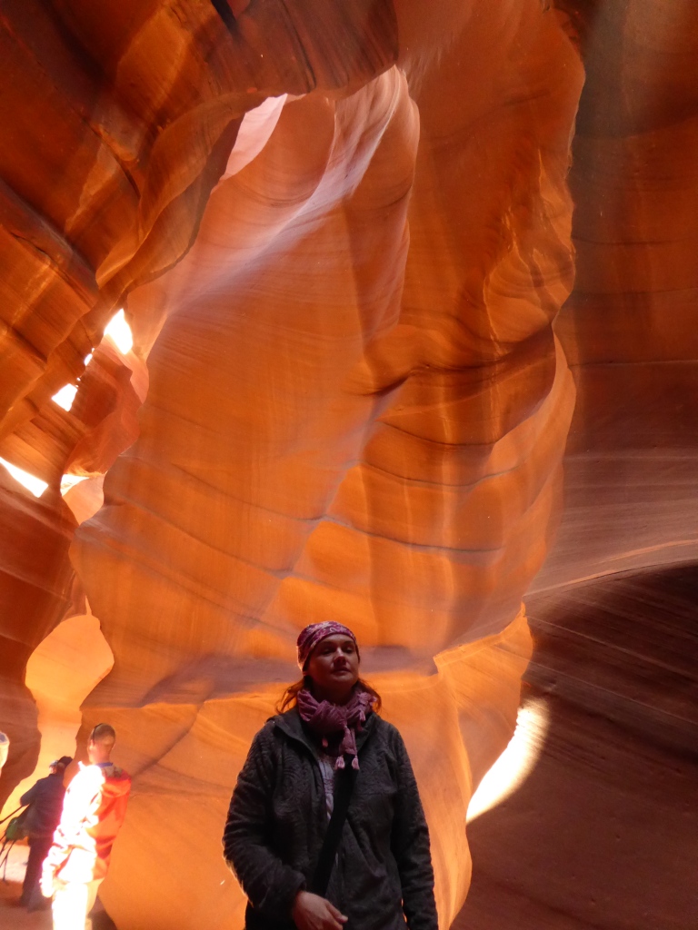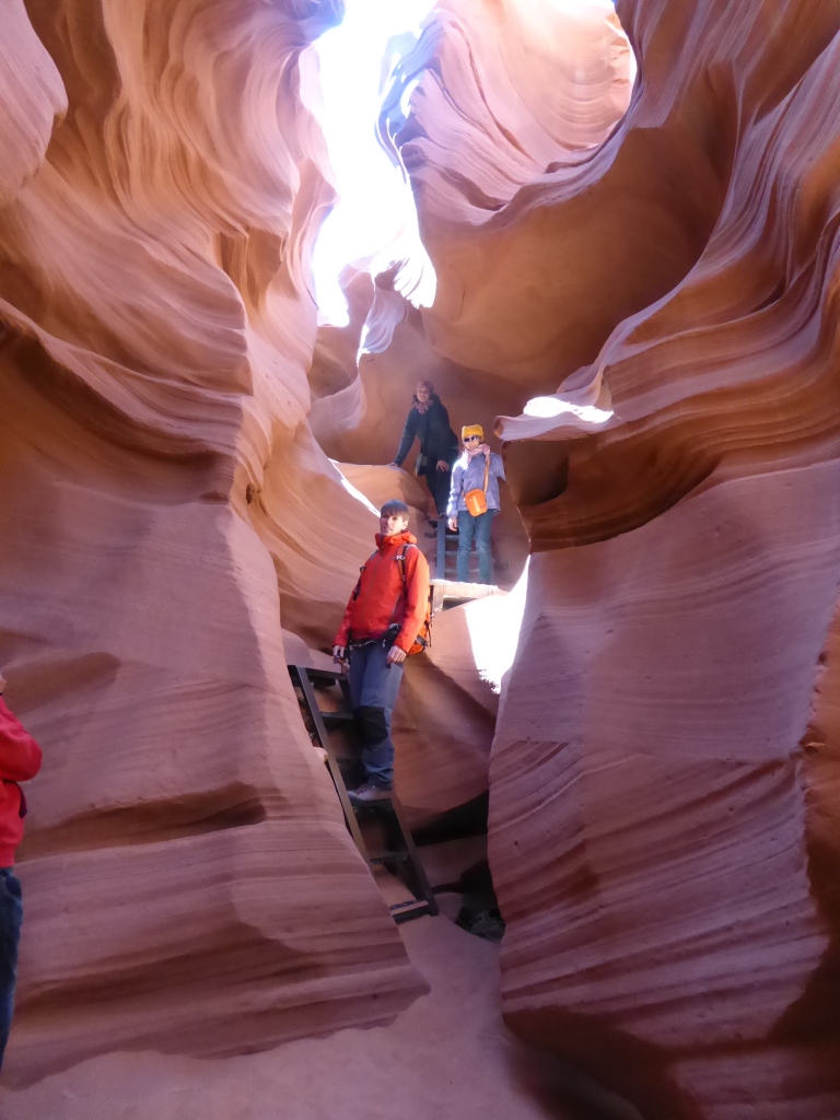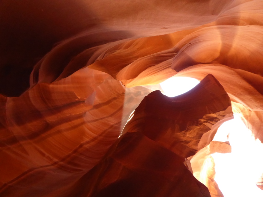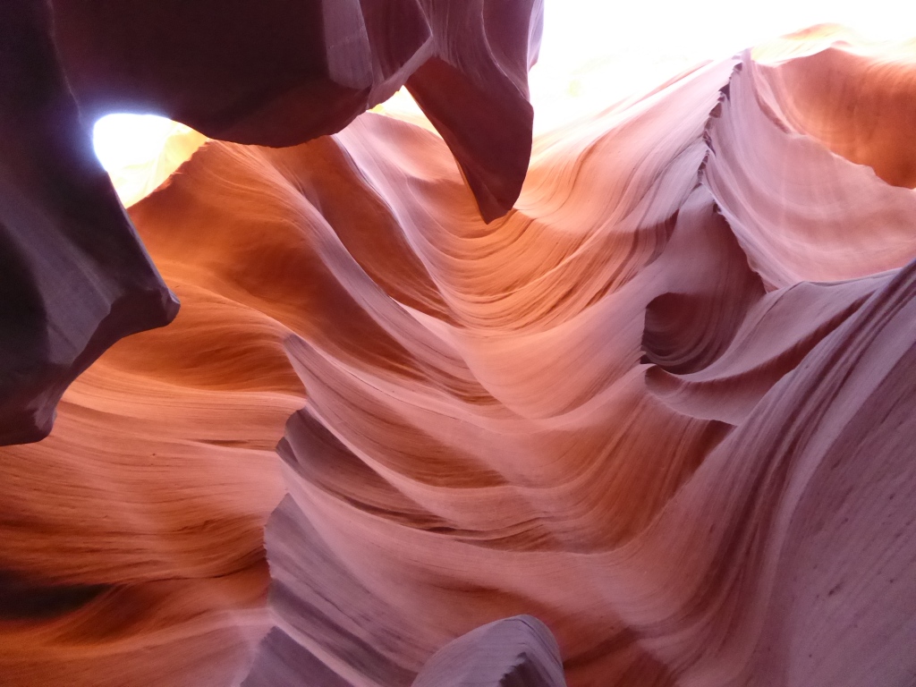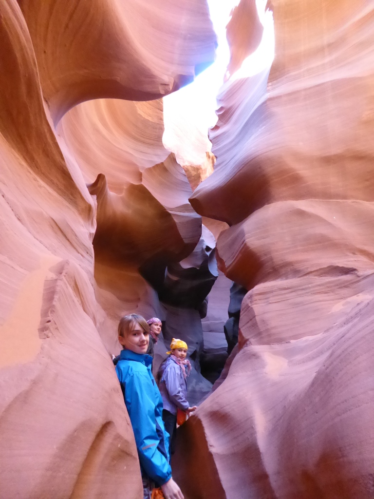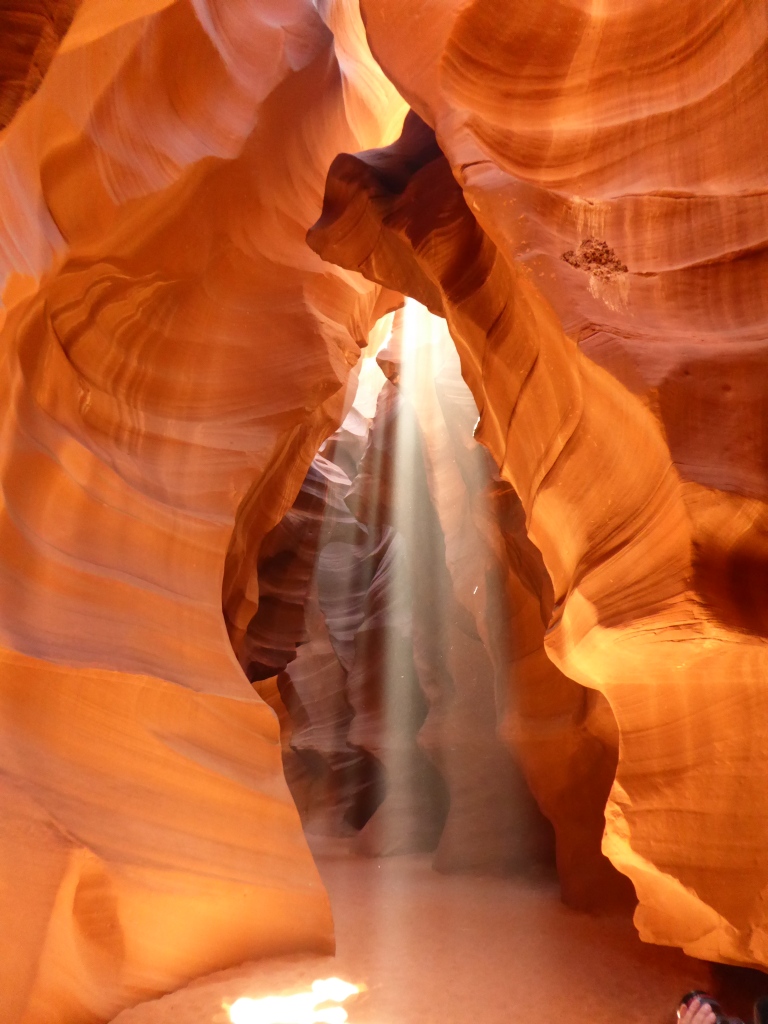 Puis nous reprenons la voiture pour traverser la Highway 98 et réserver à l'avance la visite d'Upper Antelope Canyon. La taxe Navajo est valable pour la journée, mais les visites pour les heures favorables (lightbeam hours, 11h, 12h et 13h) sont plutôt onéreuses et nous déboursons 120$ cette fois. Nous avons choisi le tour de 12h et il nous reste un peu plus d'une heure à patienter. Un petit (dé)tour en direction de la marina d'Antelope ou les 15$ d'entrée nous poussent à faire demi-tour et revenir en direction de Page afin d'acheter une bricole à manger. A 11h45 nous sommes de retour à l'entrée d'Upper Antelope Canyon et à 12h, notre guide navajo, Lance, nous fait monter à l'arrière d'un pick-up 4x4 aménagé avec des bancs et nous voilà parti pour 3miles de piste dans le lit asséché de la rivière Antelope. L'entrée du canyon est toute différente du précédent et nous nous retrouvons au pied d'une falaise de plus de 30m fendue par une gorge étroite. La visite est faite en aller-retour dans cette gorge magnifique et très différente de Lower Antelope Canyon. Le guide et très loquace et très agréable. Il nous donne plein de trucs pour réaliser de magnifiques photos et la visite, malgré un nombre important de groupes, est magique. Les 120$ pour le tour? Déjà oubliés (ou presque). Notre guide nous raconte plein d'anecdotes (clip de Britney Spears, tournage d'Indiana Jones, origines du nom, histoire et développement du canyon....).