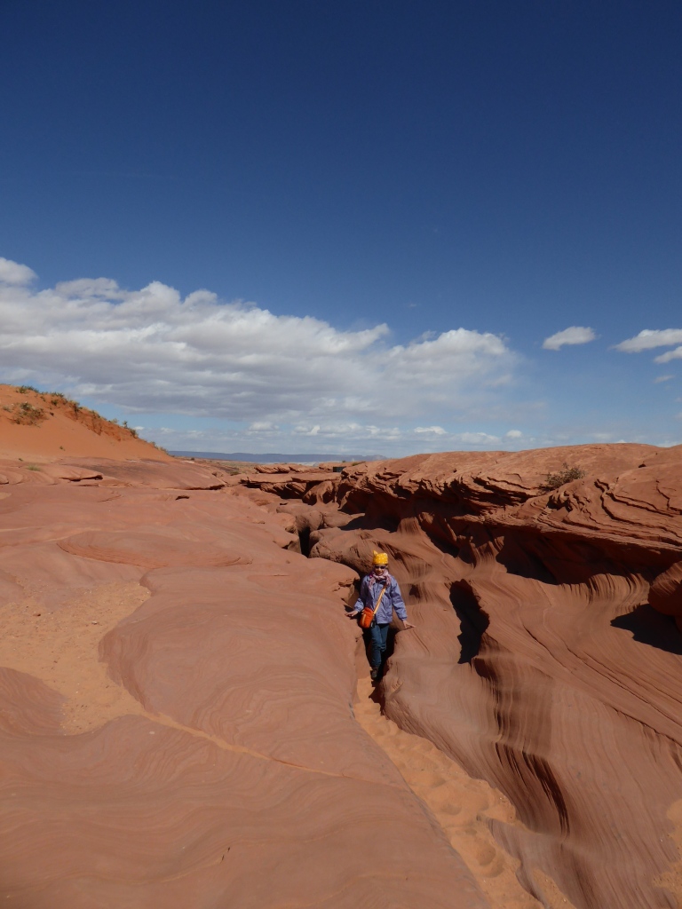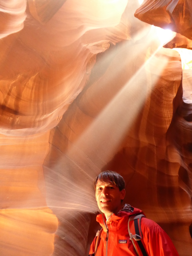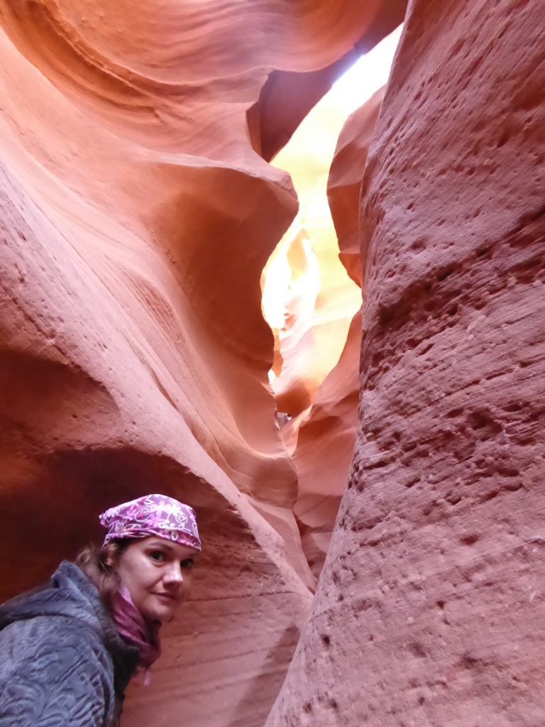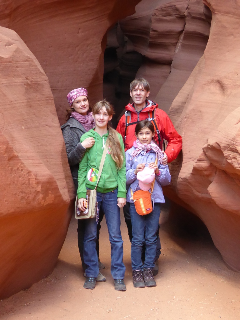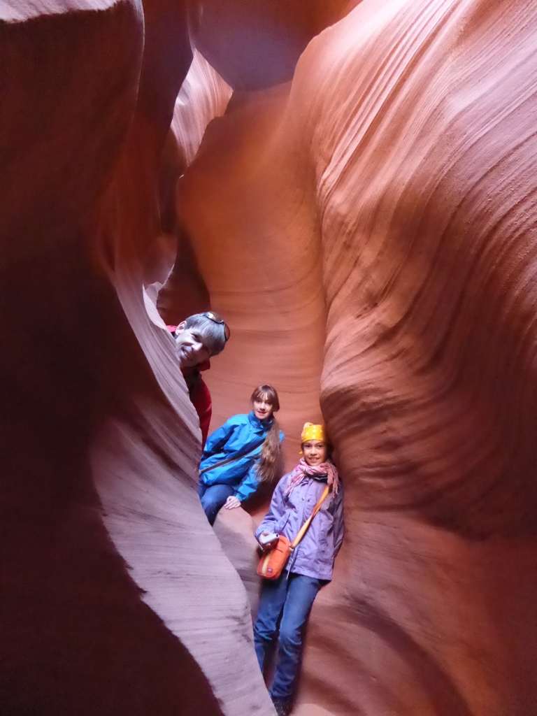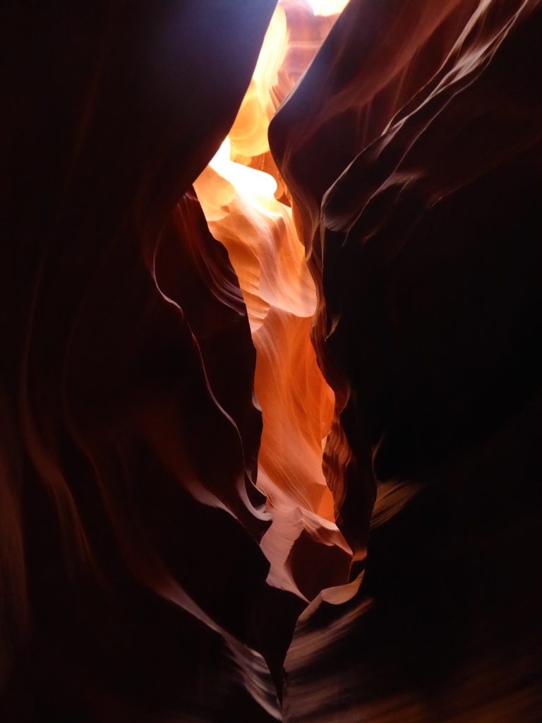 Puis nous reprenons la voiture pour traverser la Highway 98 et réserver à l'avance la visite d'Upper Antelope Canyon. La taxe Navajo est valable pour la journée, mais les visites pour les heures favorables (lightbeam hours, 11h, 12h et 13h) sont plutôt onéreuses et nous déboursons 120$ cette fois. Nous avons choisi le tour de 12h et il nous reste un peu plus d'une heure à patienter. Un petit (dé)tour en direction de la marina d'Antelope ou les 15$ d'entrée nous poussent à faire demi-tour et revenir en direction de Page afin d'acheter une bricole à manger. A 11h45 nous sommes de retour à l'entrée d'Upper Antelope Canyon et à 12h, notre guide navajo, Lance, nous fait monter à l'arrière d'un pick-up 4x4 aménagé avec des bancs et nous voilà parti pour 3miles de piste dans le lit asséché de la rivière Antelope. L'entrée du canyon est toute différente du précédent et nous nous retrouvons au pied d'une falaise de plus de 30m fendue par une gorge étroite. La visite est faite en aller-retour dans cette gorge magnifique et très différente de Lower Antelope Canyon. Le guide et très loquace et très agréable. Il nous donne plein de trucs pour réaliser de magnifiques photos et la visite, malgré un nombre important de groupes, est magique. Les 120$ pour le tour? Déjà oubliés (ou presque). Notre guide nous raconte plein d'anecdotes (clip de Britney Spears, tournage d'Indiana Jones, origines du nom, histoire et développement du canyon....).
