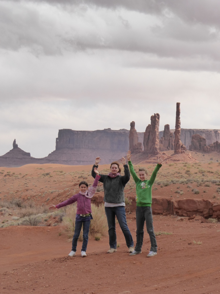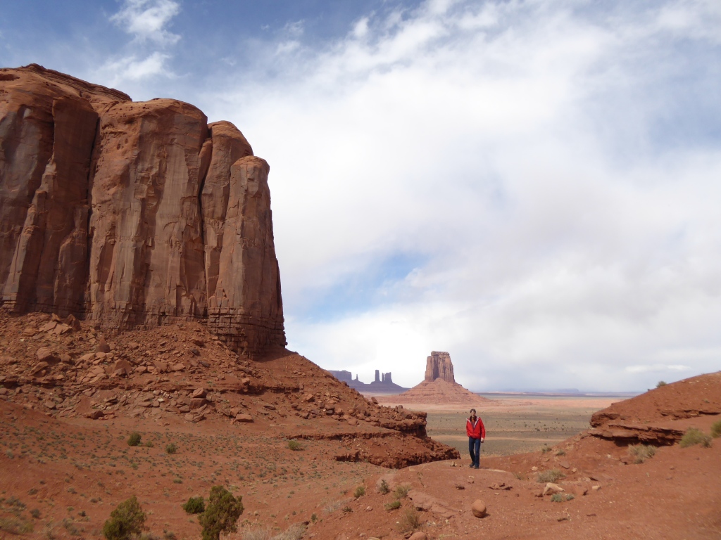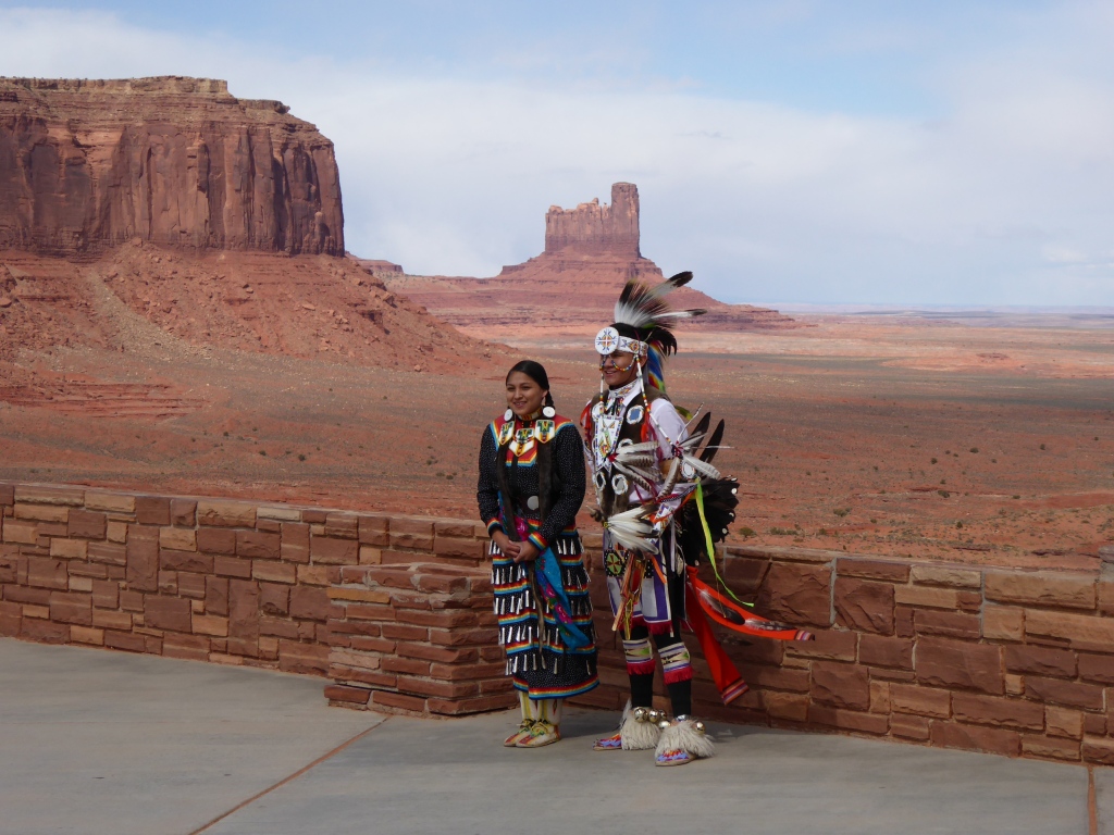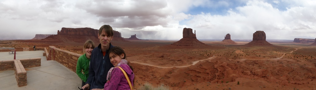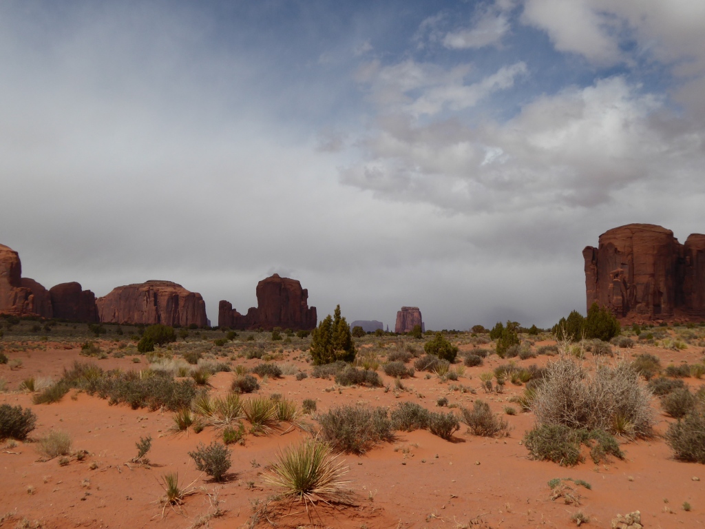 Après une courte visite au centre d'information situé à l'entrée de Monument Valley et quelques photos depuis la terrasse, nous partons pour 17 miles de piste à travers les 'Butt' et 'Mesa'. Nous sommes bien content d'avoir un gros 4x4 bien haut avec de bonnes suspensions. Le soleil joue à cache-cache avec les nuages et même à l'arrêt, le paysage évolue constamment. Sachant qu'il nous reste encore près de 200km jusqu'à Cortez, nous prenons notre temps mais sans trop trainer, pour parcourir la piste de Monument Valley et admirer ces constructions géologiques absolument incroyables. Un bon paquet de 'ouah..!' et de secousses plus tard, nous profitons d'une belle éclaircie pour prendre encore quelques photos depuis la terrasse du centre d'information. Nous ne restons pas trop longtemps dehors, malgré le soleil et l'ambiance désertique, il fait plutôt froid et le vent souffle toujours très fort.