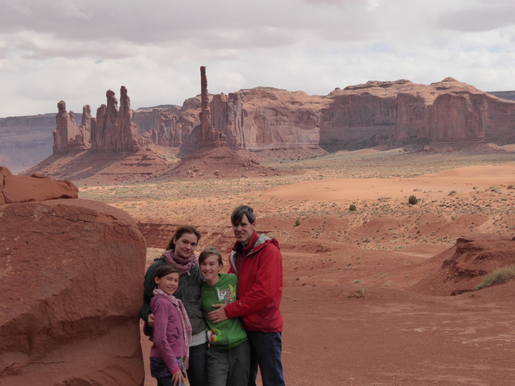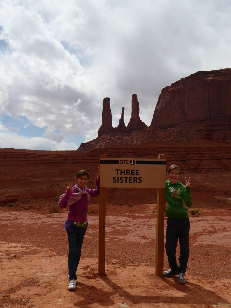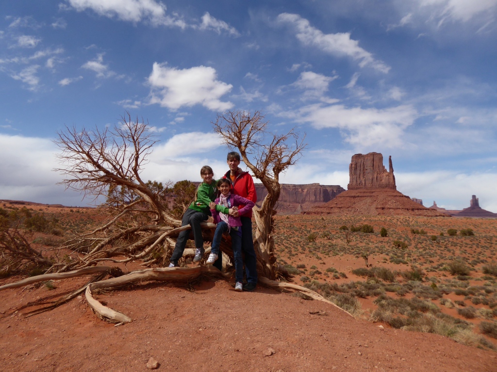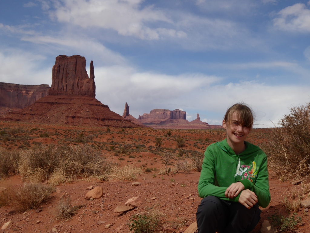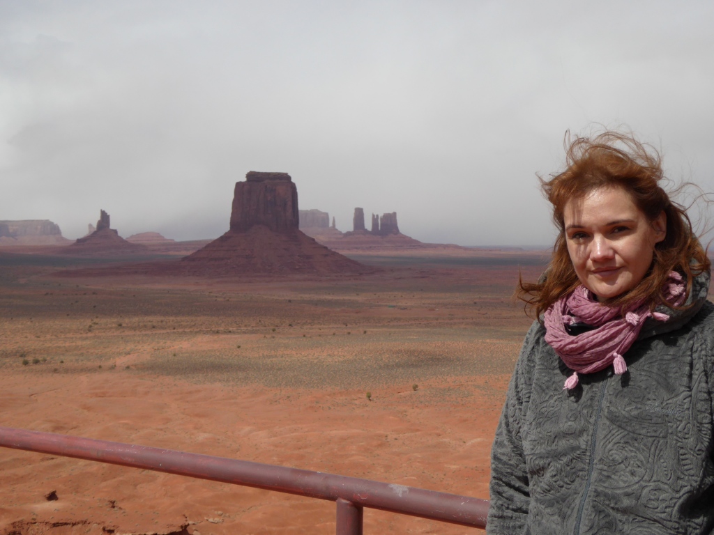 Après une courte visite au centre d'information situé à l'entrée de Monument Valley et quelques photos depuis la terrasse, nous partons pour 17 miles de piste à travers les 'Butt' et 'Mesa'. Nous sommes bien content d'avoir un gros 4x4 bien haut avec de bonnes suspensions. Le soleil joue à cache-cache avec les nuages et même à l'arrêt, le paysage évolue constamment. Sachant qu'il nous reste encore près de 200km jusqu'à Cortez, nous prenons notre temps mais sans trop trainer, pour parcourir la piste de Monument Valley et admirer ces constructions géologiques absolument incroyables. Un bon paquet de 'ouah..!' et de secousses plus tard, nous profitons d'une belle éclaircie pour prendre encore quelques photos depuis la terrasse du centre d'information. Nous ne restons pas trop longtemps dehors, malgré le soleil et l'ambiance désertique, il fait plutôt froid et le vent souffle toujours très fort.
