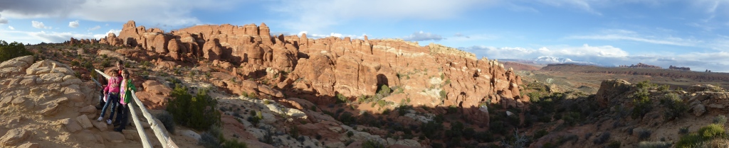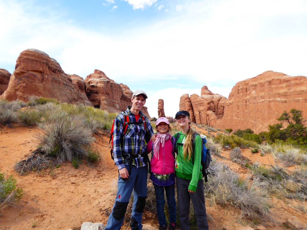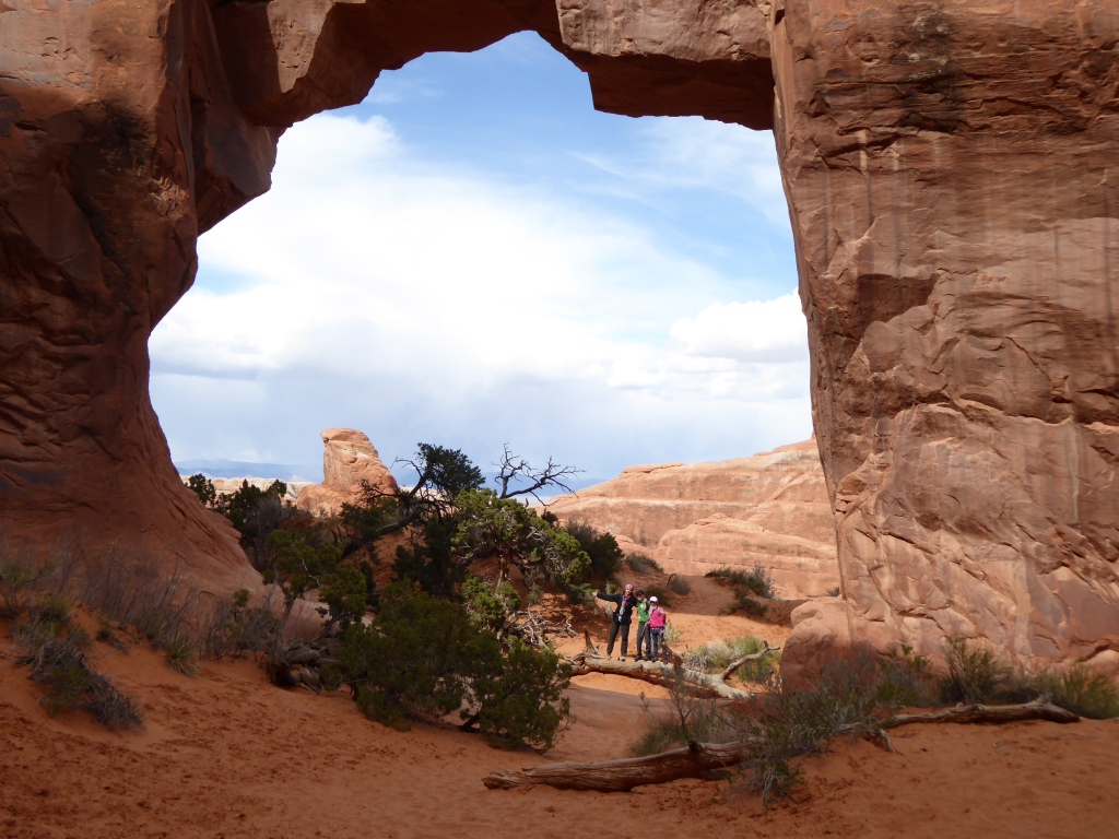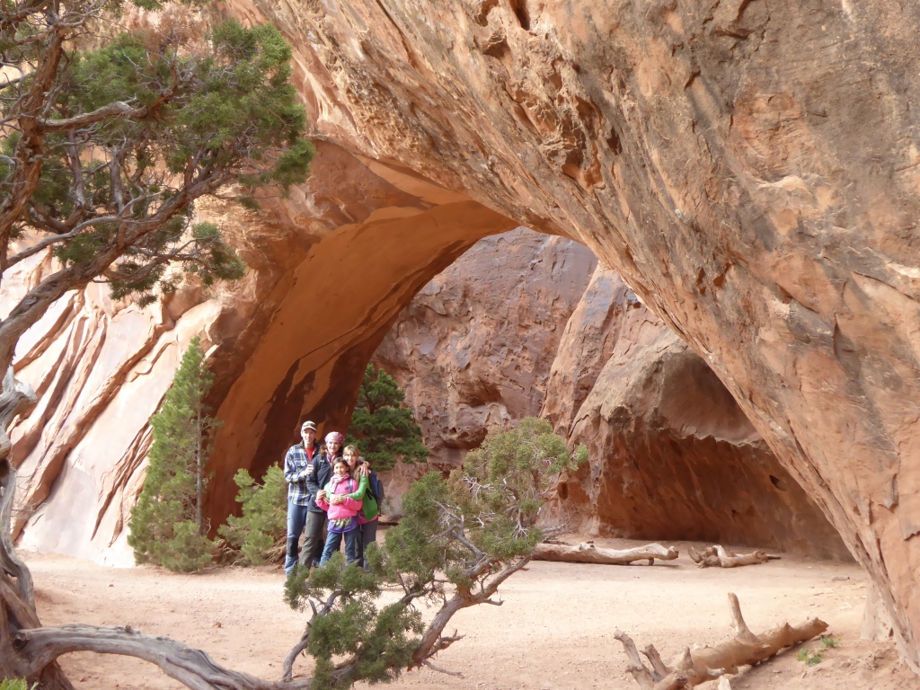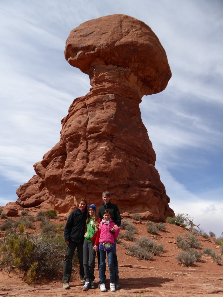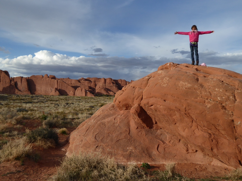 Nous repartons en voiture vers le nord du parc, pour faire le 'Devils Garden Trail'...ou une partie tout du moins de la randonnée. Si loin de l'entrée du parc, il y a déjà un peu moins de monde. Nous nous "perdons" avec délice au milieu de ce labyrinthe de roche rouge. Nous avons envie d'y explorer chaque recoin et de grimper sur chaque rocher arrondi (surtout Emilie). Nous voyons 'Tunnel Arch' (où nous faisons une halte pour pique-niquer), 'Pine Tree Arch', la longue et fine 'Landscape Arch', 'Partition Arch' avec sa petite fenêtre puis enfin 'Navajo Arch' qui ouvre sur un charmant mini canyon (c'est là que yannick laisse la moitié de sa chemise sur un buisson en voulant faire une photo de groupe avec le timer). Nous voudrions bien adopter 'Navajo Arch', mais les rangers ne sont pas d'accord. Au loin, nous voyons encore beaucoup d'autres arches dont nous ne connaissons pas le nom. Il n'y a pas moins de 2000 arches recensées dans le parc.