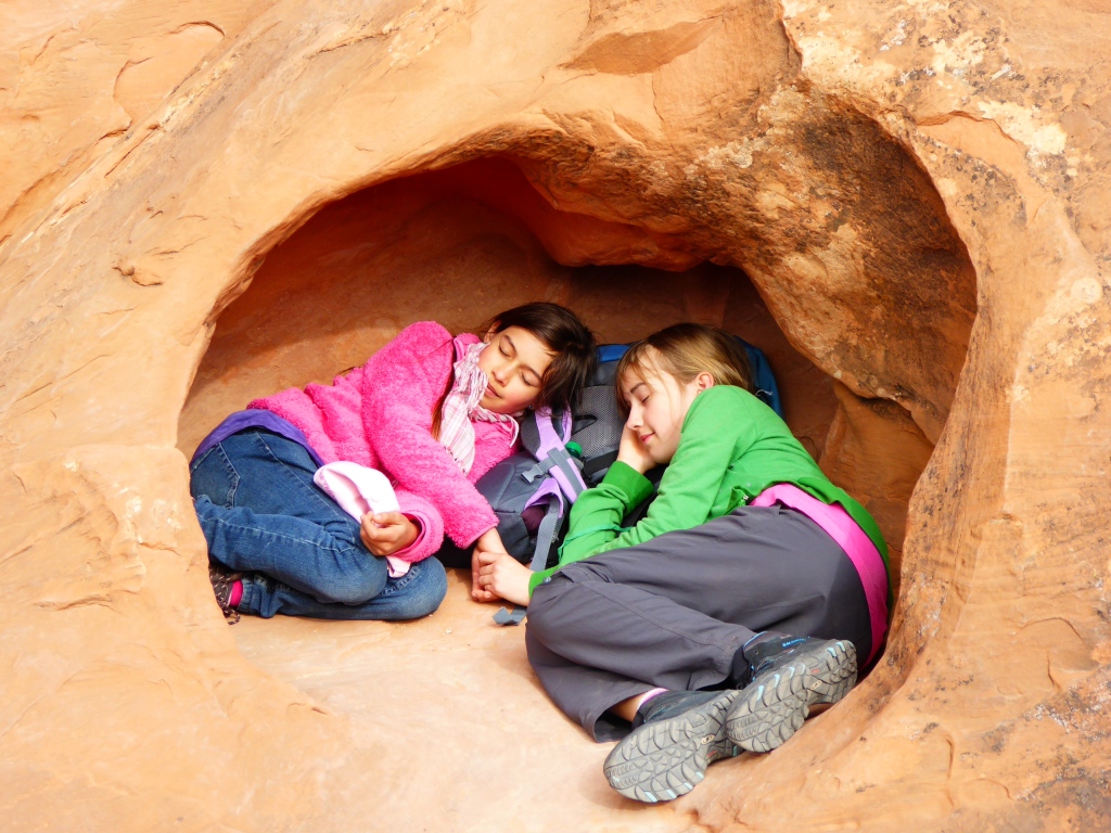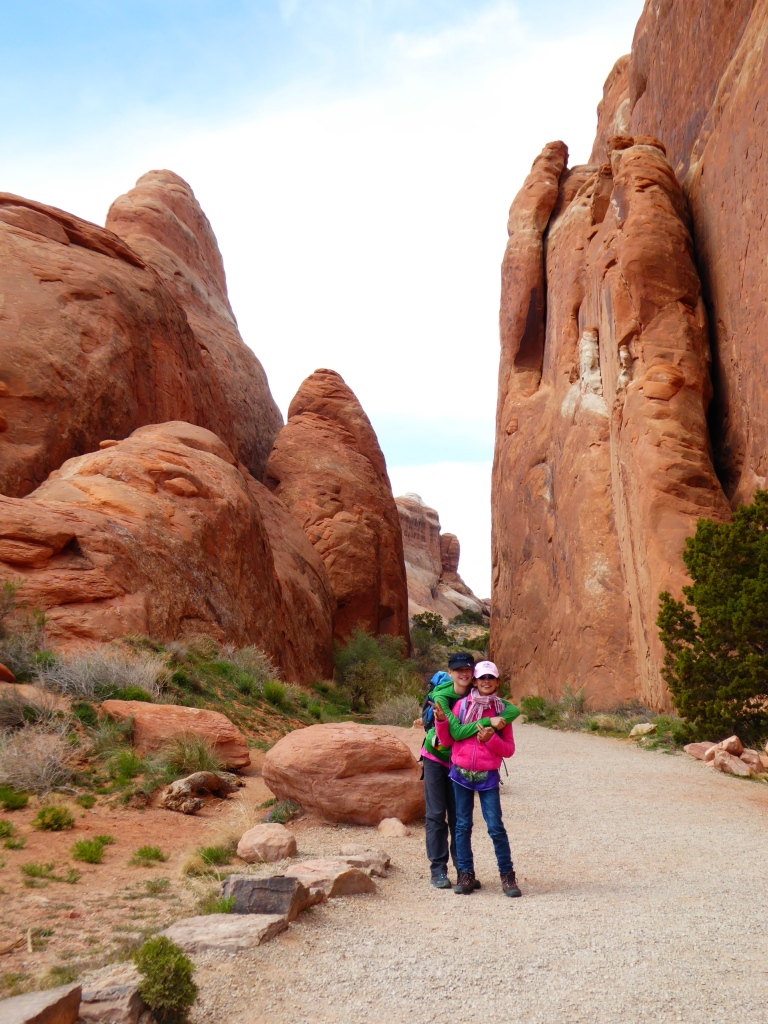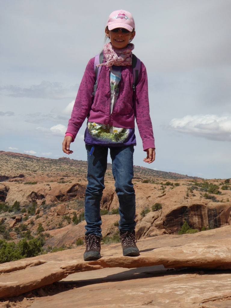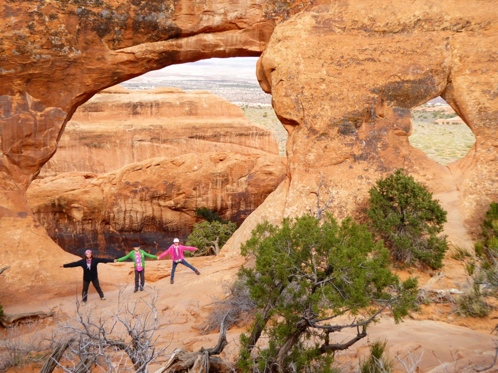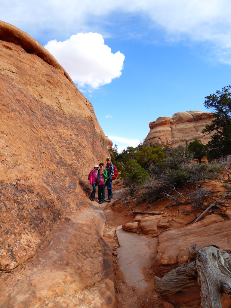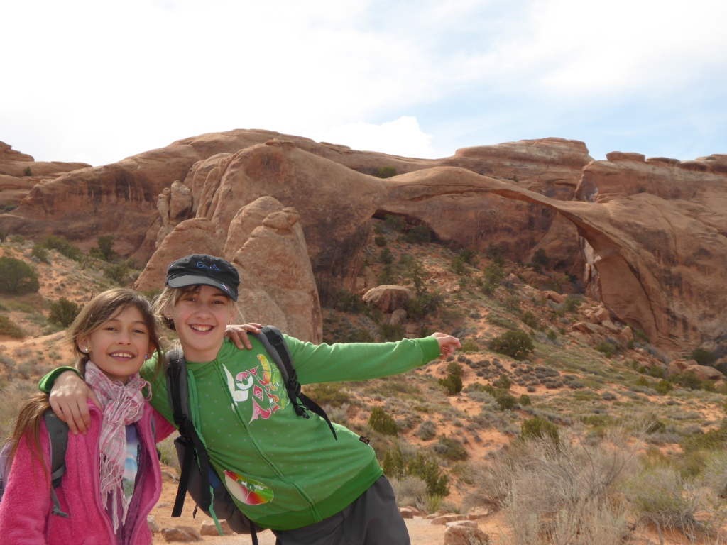Nous repartons en voiture vers le nord du parc, pour faire le 'Devils Garden Trail'...ou une partie tout du moins de la randonnée. Si loin de l'entrée du parc, il y a déjà un peu moins de monde. Nous nous "perdons" avec délice au milieu de ce labyrinthe de roche rouge. Nous avons envie d'y explorer chaque recoin et de grimper sur chaque rocher arrondi (surtout Emilie). Nous voyons 'Tunnel Arch' (où nous faisons une halte pour pique-niquer), 'Pine Tree Arch', la longue et fine 'Landscape Arch', 'Partition Arch' avec sa petite fenêtre puis enfin 'Navajo Arch' qui ouvre sur un charmant mini canyon (c'est là que yannick laisse la moitié de sa chemise sur un buisson en voulant faire une photo de groupe avec le timer). Nous voudrions bien adopter 'Navajo Arch', mais les rangers ne sont pas d'accord. Au loin, nous voyons encore beaucoup d'autres arches dont nous ne connaissons pas le nom. Il n'y a pas moins de 2000 arches recensées dans le parc.