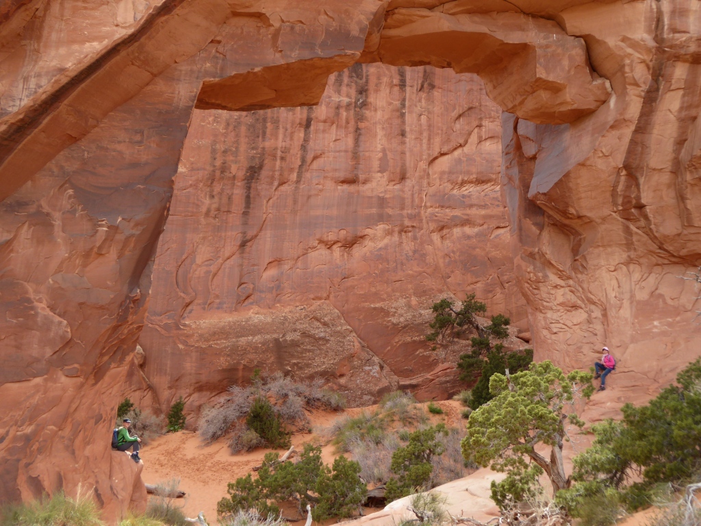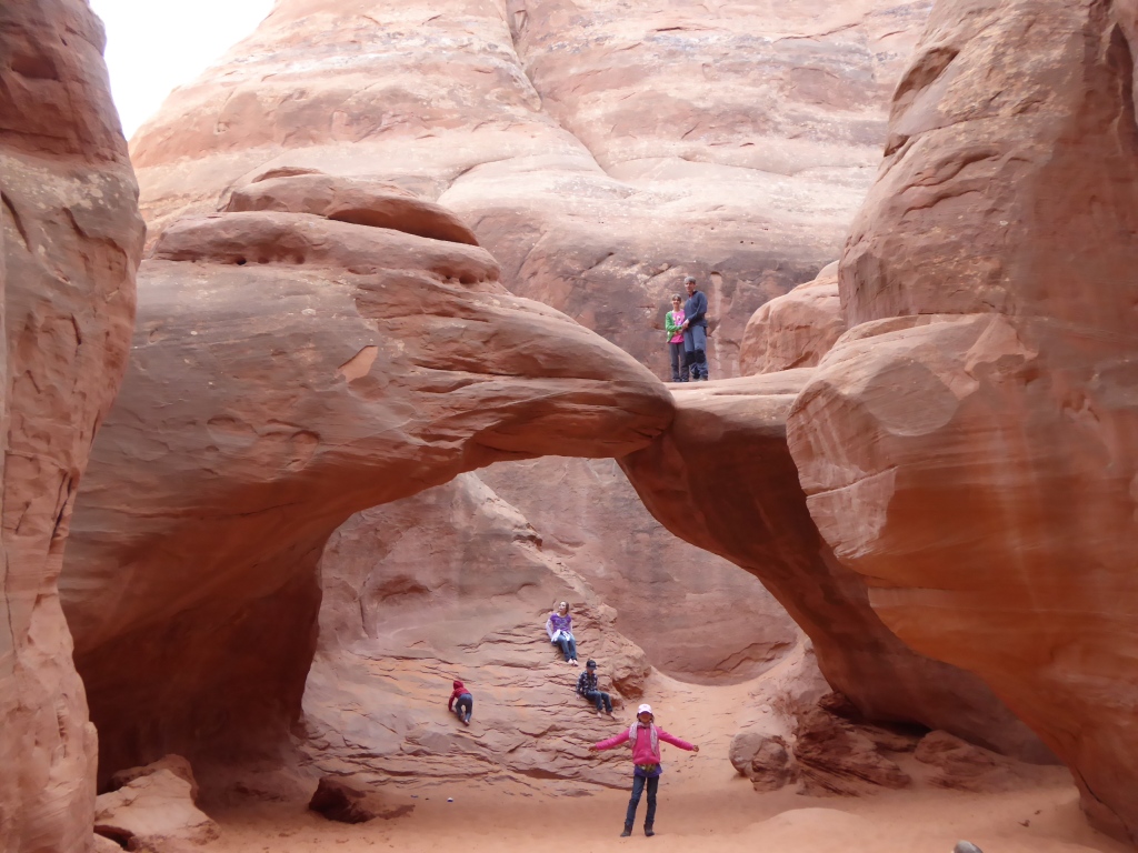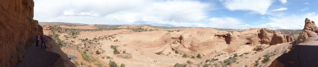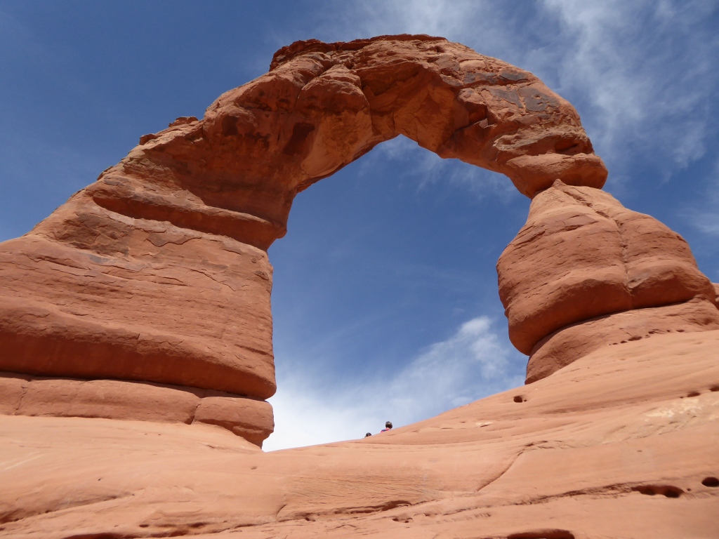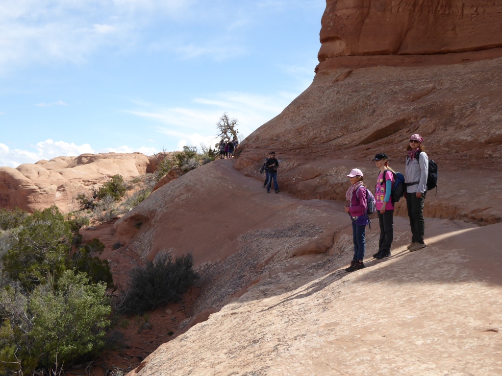 Nous nous rendons directement au point de départ de la piste pour aller voir 'Delicate Arch'. Le paysage est magnifique, la roche et le sable rouges, les buissons et pins verts et le ciel bleu forment un décor de carte postale à une échelle plus humaine que 'Canyonlands'. En contre-partie....on est dans la foule. Malgré le sentir escarpé, il y a la une file d'attente au pied de 'Delicate Arch' pour faire LA photo. Comme en plus c'est à contre-jour, nous décidons de sauter la séquence photo directement sous l'arche et de redescendre pour continuer la visite.
