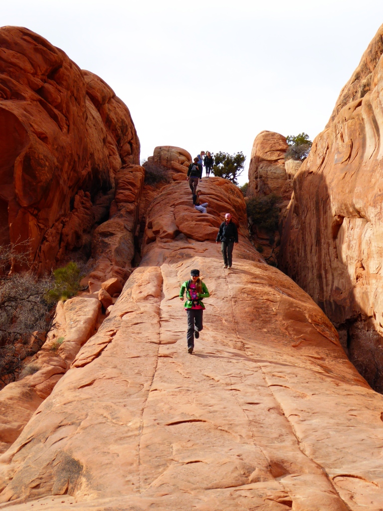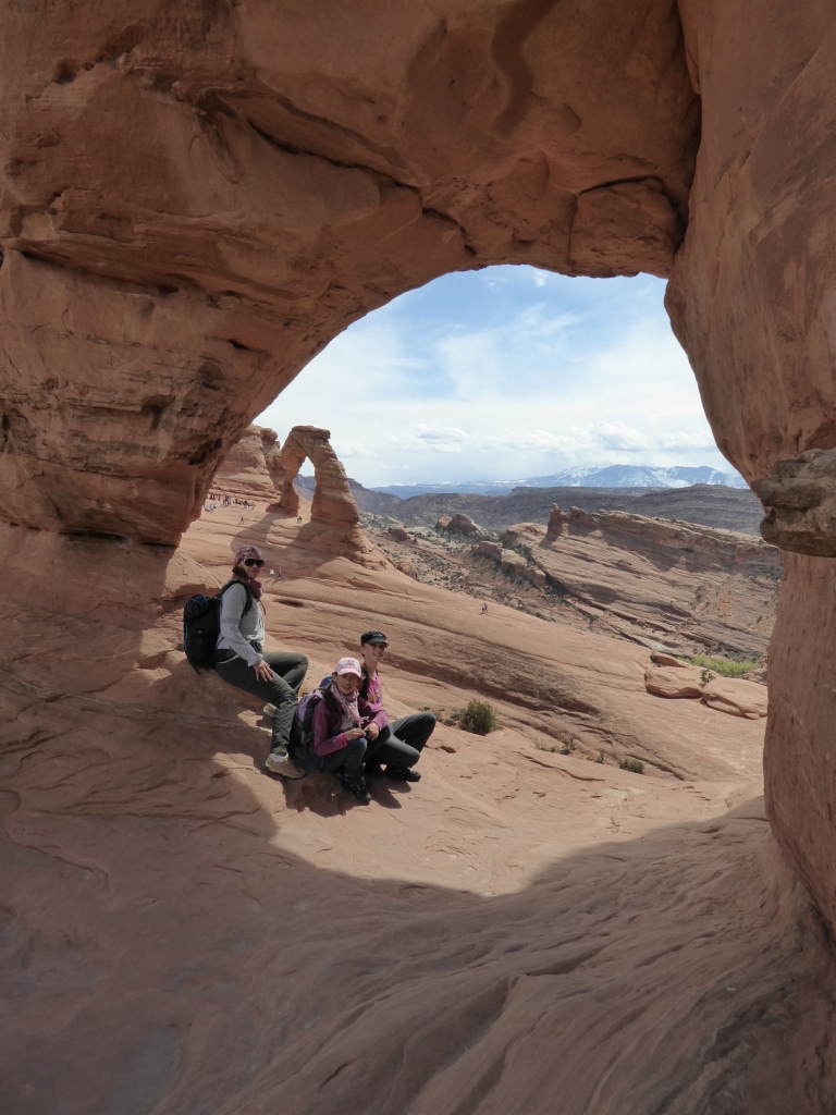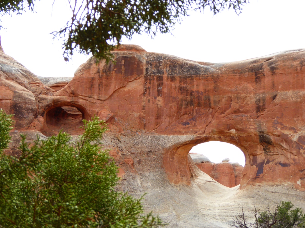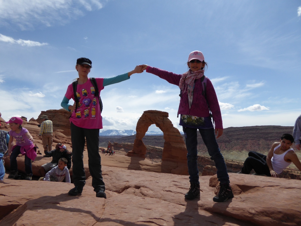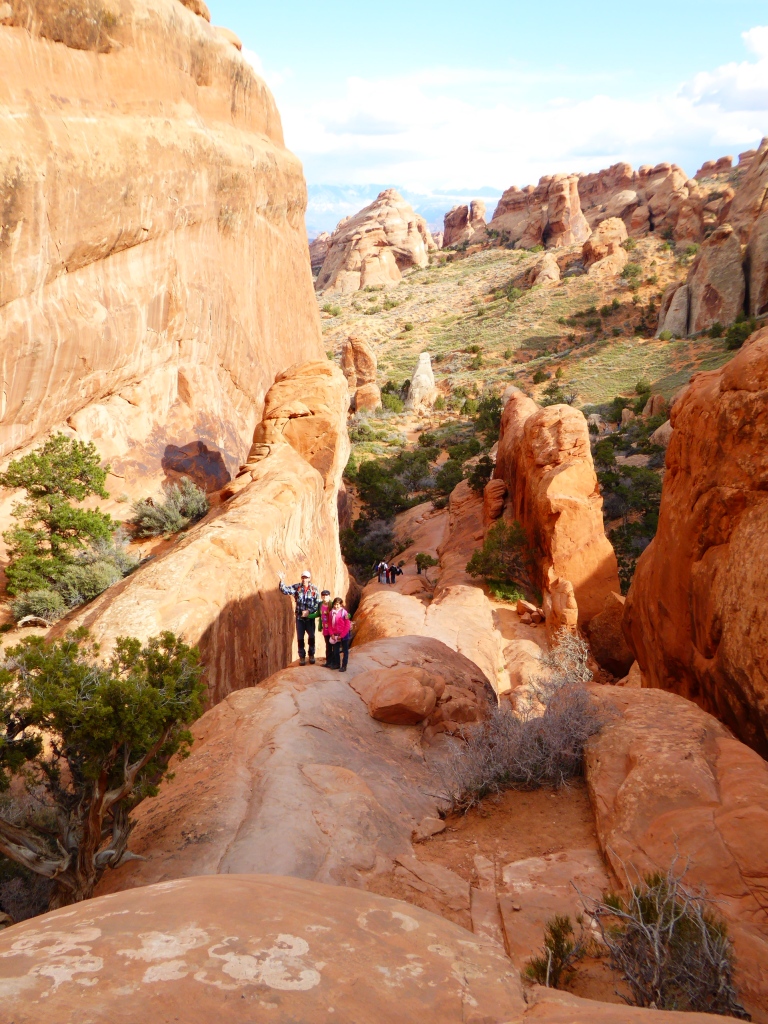Nous nous rendons directement au point de départ de la piste pour aller voir 'Delicate Arch'. Le paysage est magnifique, la roche et le sable rouges, les buissons et pins verts et le ciel bleu forment un décor de carte postale à une échelle plus humaine que 'Canyonlands'. En contre-partie....on est dans la foule. Malgré le sentir escarpé, il y a la une file d'attente au pied de 'Delicate Arch' pour faire LA photo. Comme en plus c'est à contre-jour, nous décidons de sauter la séquence photo directement sous l'arche et de redescendre pour continuer la visite.
