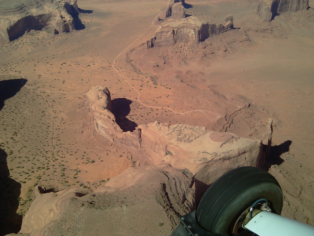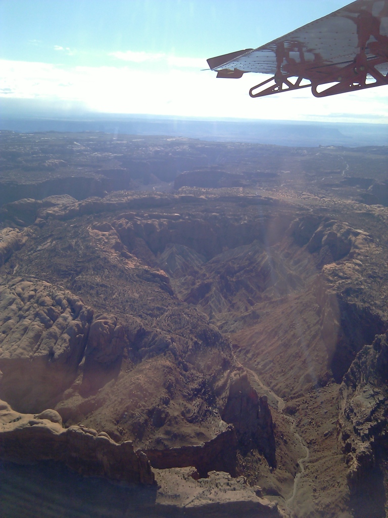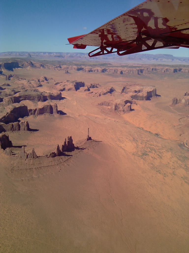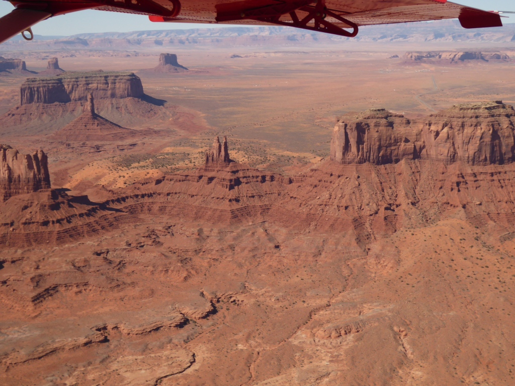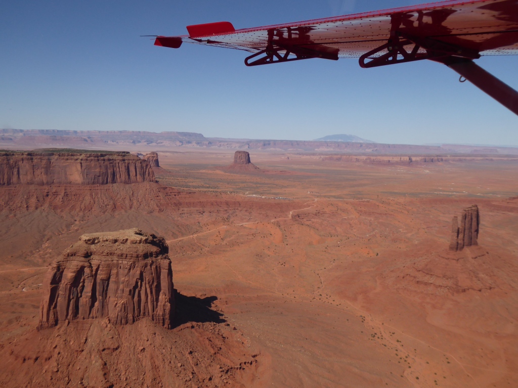 Vers 10h, nous décollons direction Monument Valley. A l'aller, nous survolons la partie ouest de Canyonlands, puis nous nous orientions vers le sud en passant à l'est du Lake Powell pour atterrir sur la piste de Monument Valley sans avoir oublié de faire le tour des célèbres buttes. Malgré quelques turbulences parfois assez marquées, la météo est excellente et nous avons une vue splendide sur les régions que nous venons de traverser à pied ou en voiture. C'est génial d'observer depuis en haut les routes et sentiers parcourus quelques jours auparavant. Après une petite visite d'un 'hogan' navajo situé à 2 pas de la piste d'atterrissage, nous reprenons l'air pour une retour à Moab en passant cette fois par l'est de Canyonlands. Deux heures et 300 photos plus tard, nous voilà revenu sur terre sans accident ni incident du type... vous savez, l'estomac, quand ça secoue un peu en l'air... Le pilote est fier de son équipage!