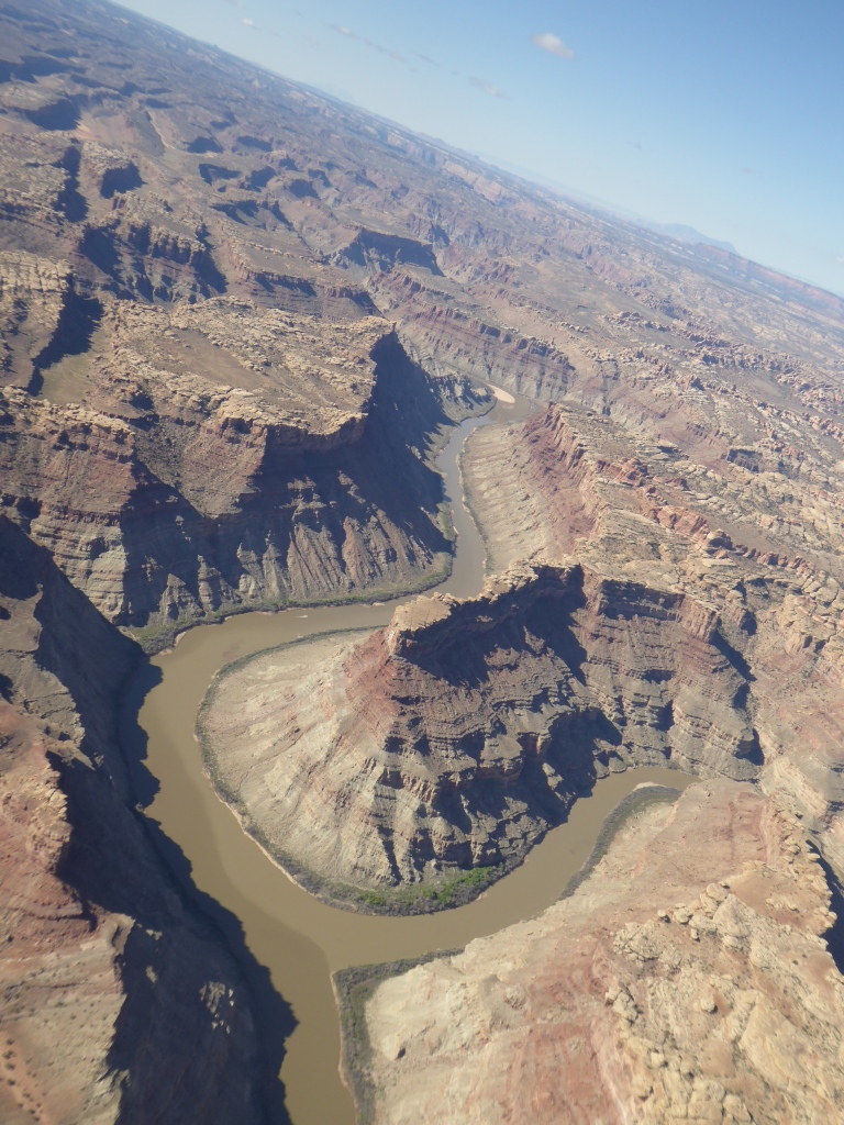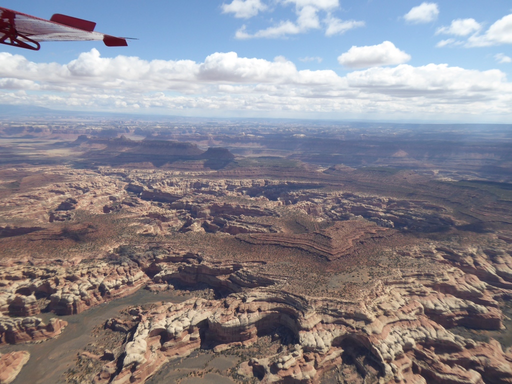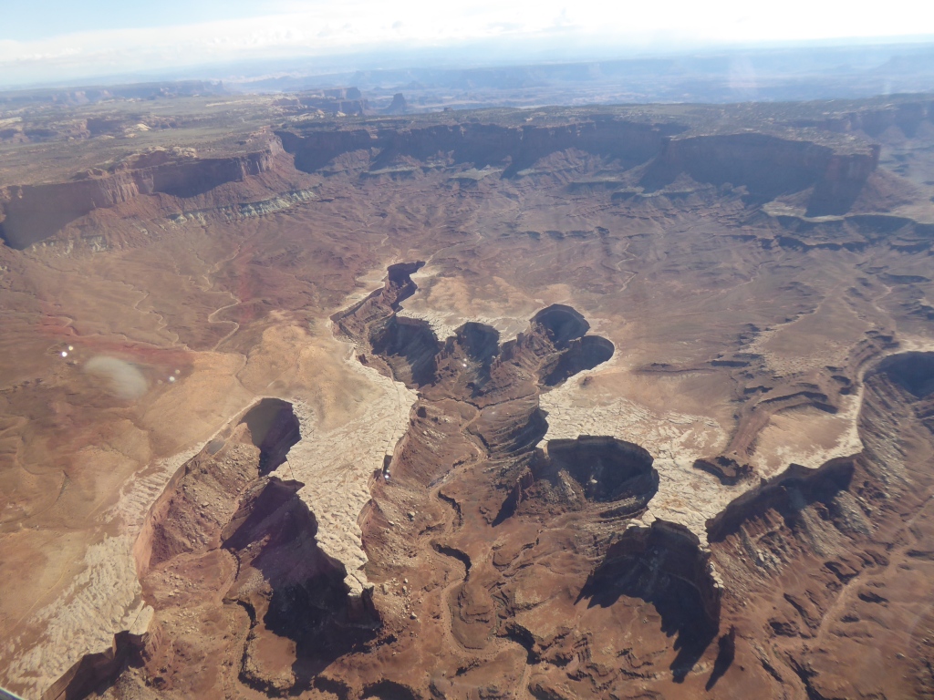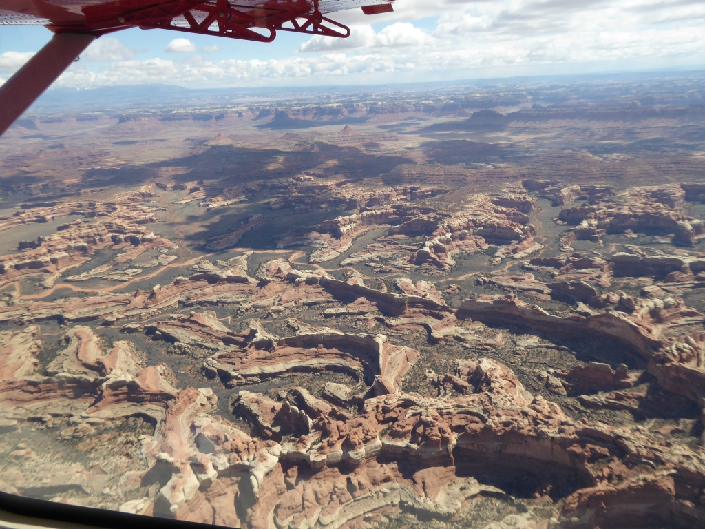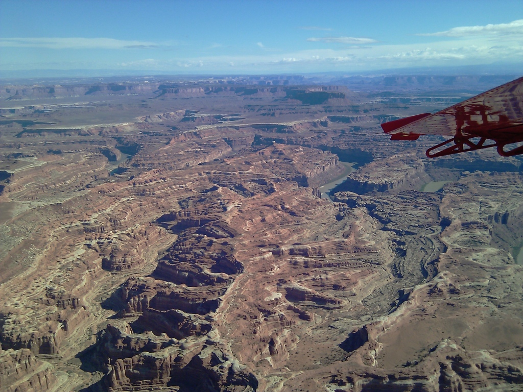 Vers 10h, nous décollons direction Monument Valley. A l'aller, nous survolons la partie ouest de Canyonlands, puis nous nous orientions vers le sud en passant à l'est du Lake Powell pour atterrir sur la piste de Monument Valley sans avoir oublié de faire le tour des célèbres buttes. Malgré quelques turbulences parfois assez marquées, la météo est excellente et nous avons une vue splendide sur les régions que nous venons de traverser à pied ou en voiture. C'est génial d'observer depuis en haut les routes et sentiers parcourus quelques jours auparavant. Après une petite visite d'un 'hogan' navajo situé à 2 pas de la piste d'atterrissage, nous reprenons l'air pour une retour à Moab en passant cette fois par l'est de Canyonlands. Deux heures et 300 photos plus tard, nous voilà revenu sur terre sans accident ni incident du type... vous savez, l'estomac, quand ça secoue un peu en l'air... Le pilote est fier de son équipage!