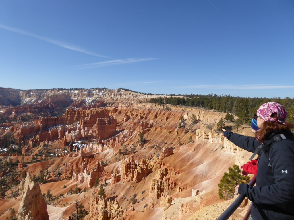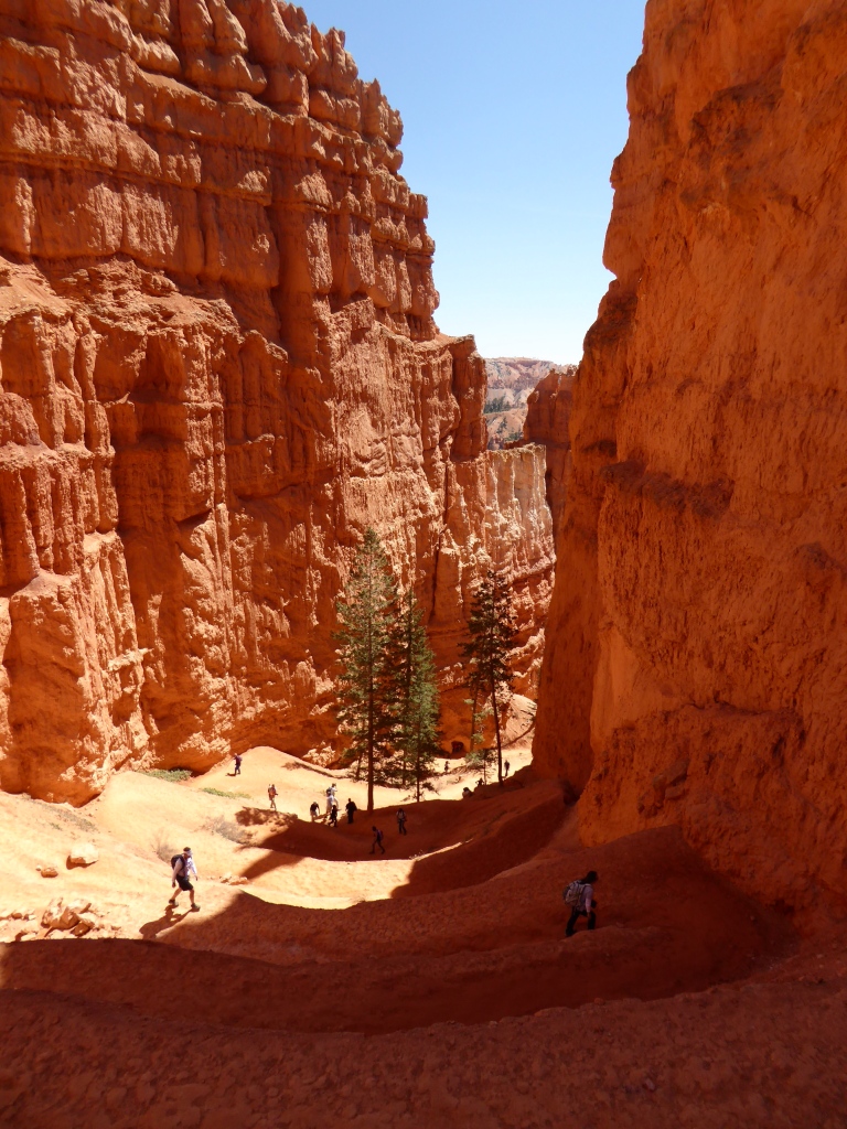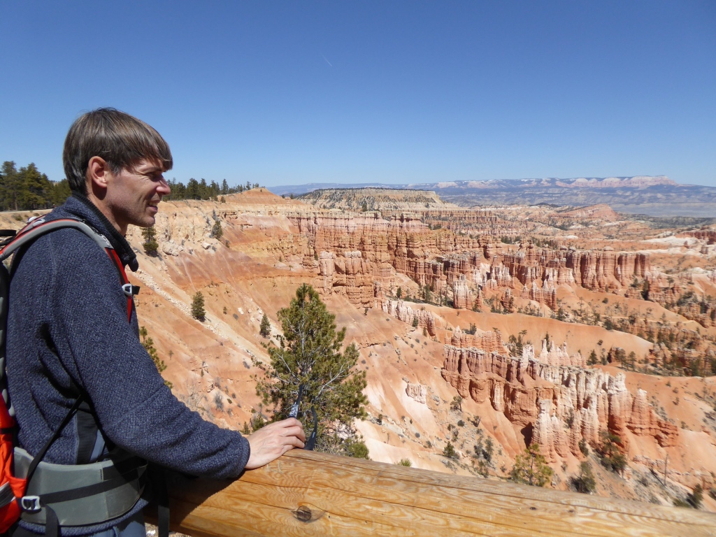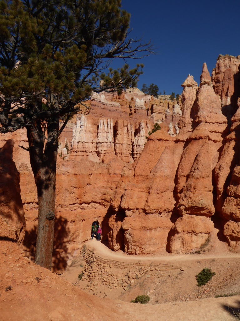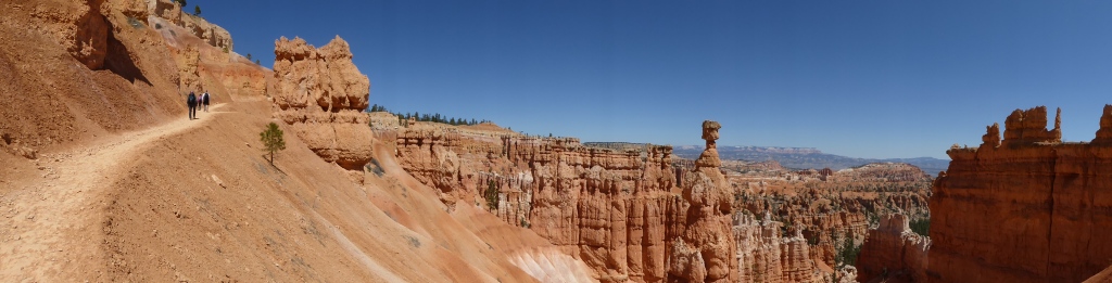 Nous remontons à 'Sunset Point' par la partie est de 'Navajo Trail' après un détour par l'entrée de 'Wall Street', une sorte de gorge étroite entre. La remontée par ce sentier est fermé à cette saison pour des raisons de sécurité (chutes de pierres). De retour sur le plateau, nous parcourons le 'Rim Trail' qui borde l'amphithéâtre de Bryce Canyon jusqu'à 'Inspiration Point', puis nous revenons tranquillement à la voiture. Une magnifique randonnée de plus de 3h dans un décor incroyable se termine. Nous décidons de nous rendre en voiture jusqu'à 'Bryce Point' pour admirer le paysage sous un autre angle, avant de reprendre la route en direction de Zion.