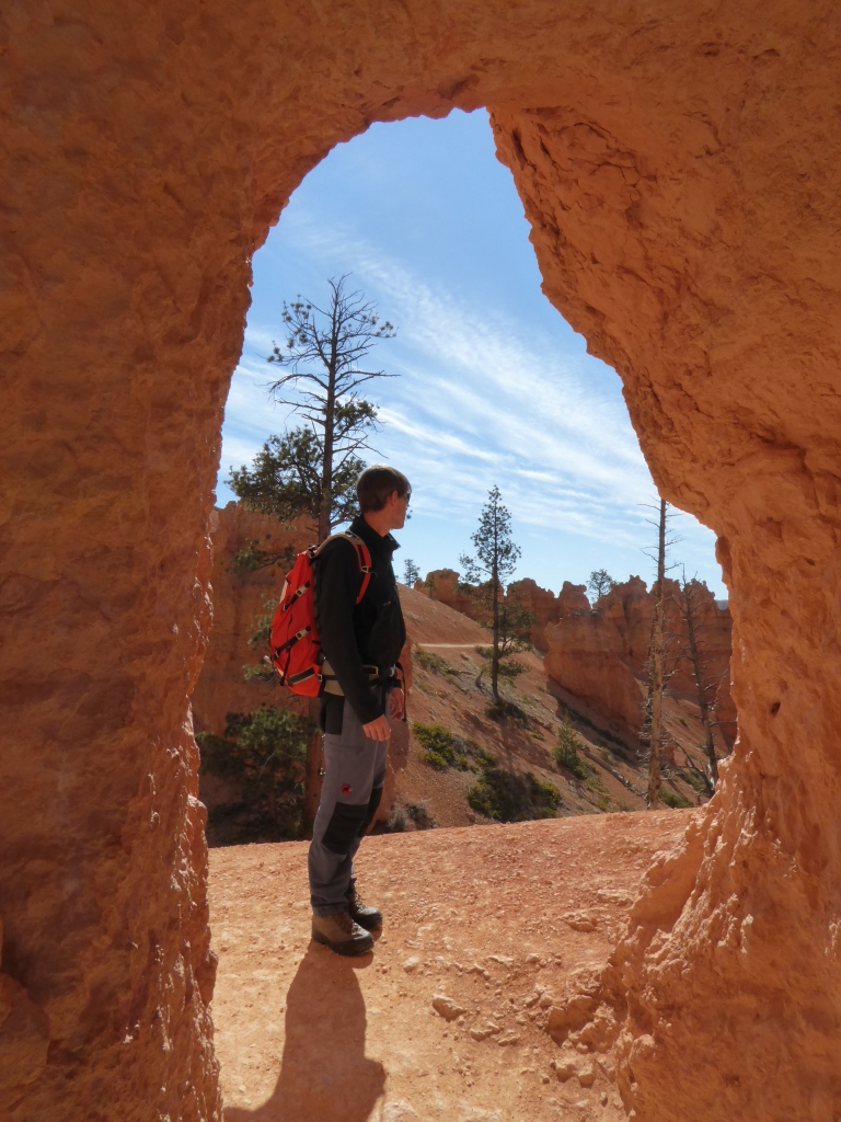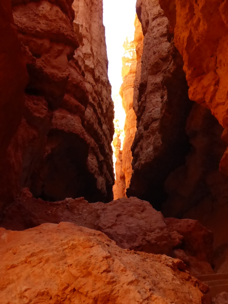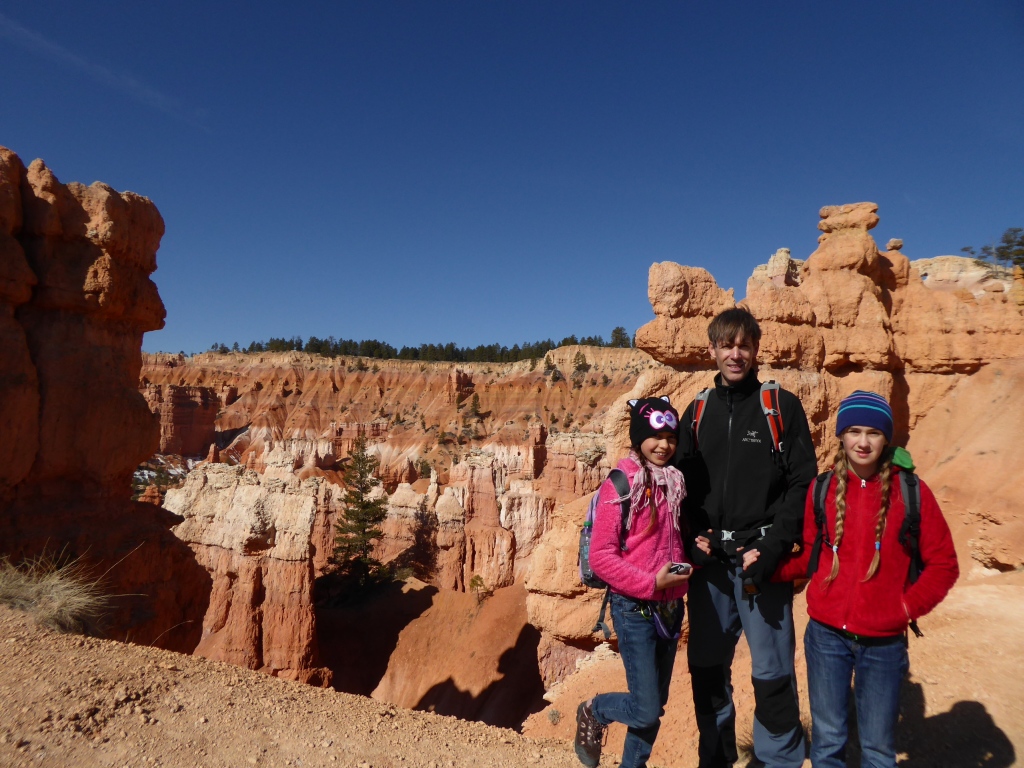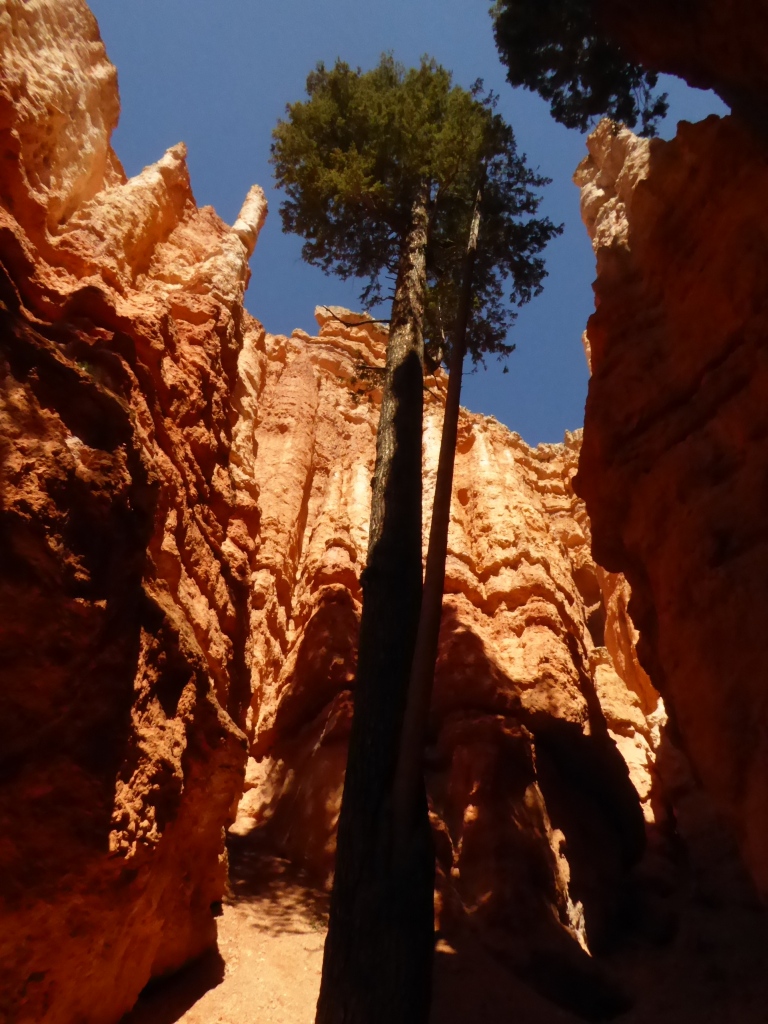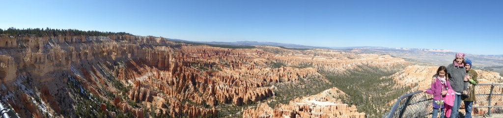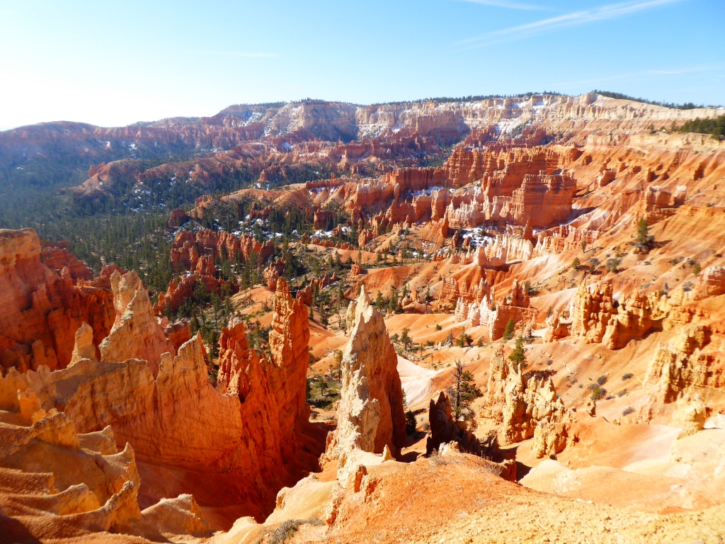 Nous remontons à 'Sunset Point' par la partie est de 'Navajo Trail' après un détour par l'entrée de 'Wall Street', une sorte de gorge étroite entre. La remontée par ce sentier est fermé à cette saison pour des raisons de sécurité (chutes de pierres). De retour sur le plateau, nous parcourons le 'Rim Trail' qui borde l'amphithéâtre de Bryce Canyon jusqu'à 'Inspiration Point', puis nous revenons tranquillement à la voiture. Une magnifique randonnée de plus de 3h dans un décor incroyable se termine. Nous décidons de nous rendre en voiture jusqu'à 'Bryce Point' pour admirer le paysage sous un autre angle, avant de reprendre la route en direction de Zion.