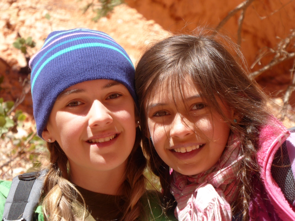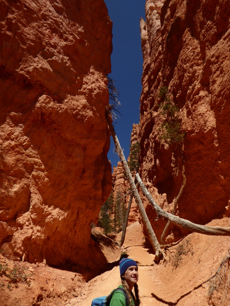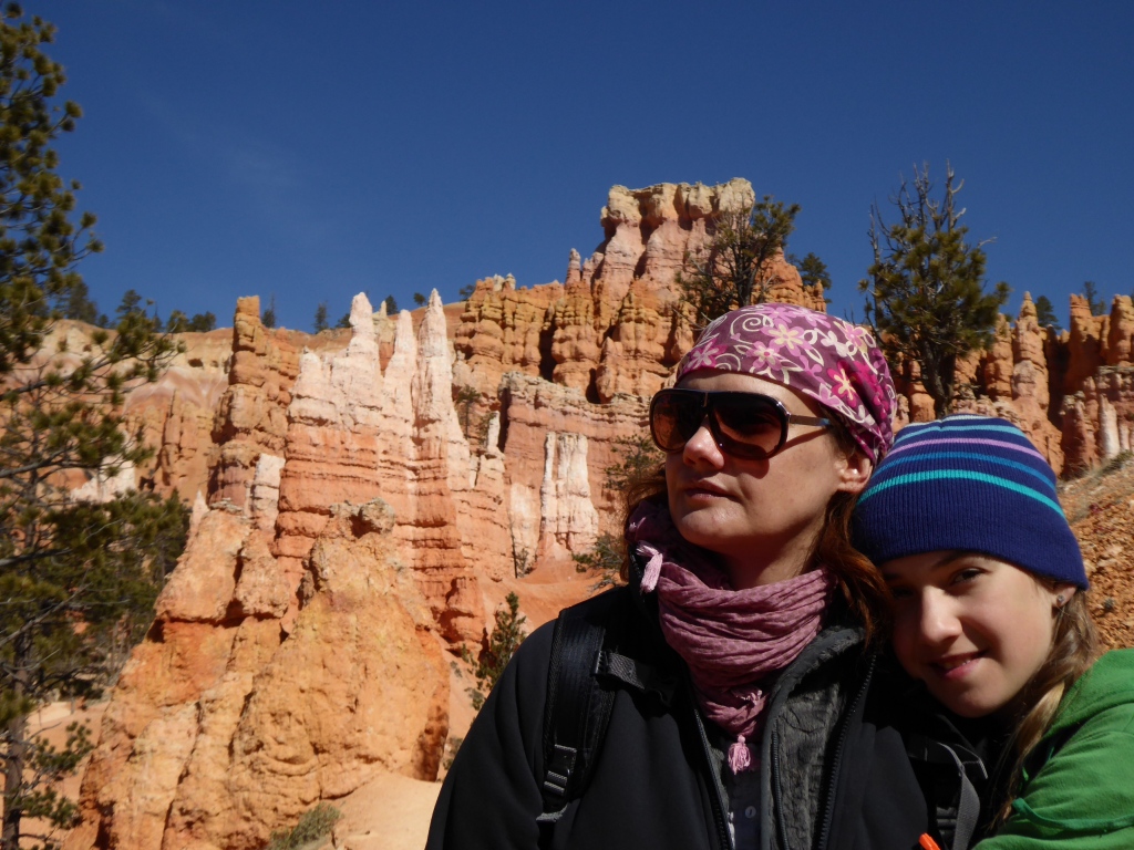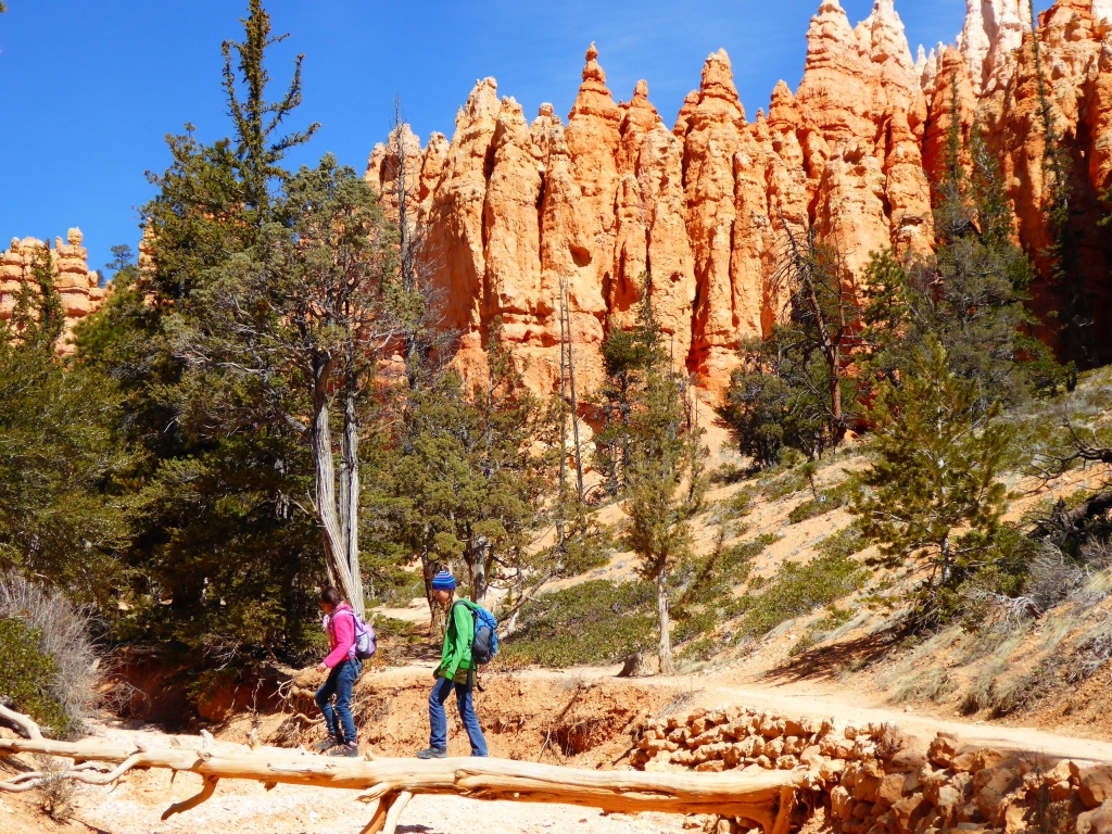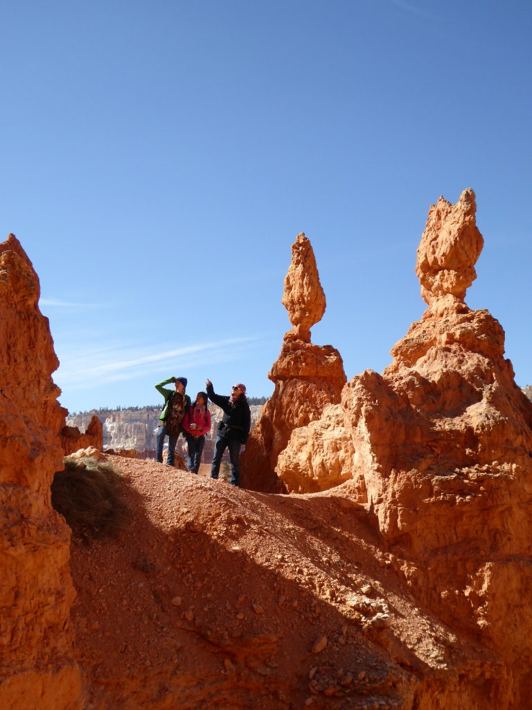 Depuis 'Sunrise Point', nous descendons dans ce labyrinthe de pierre en suivant le 'Queens Garden Trail'. Le contraste entre les roches rouges, les pins verts et le ciel bleu, est saisissant. Nous sommes aussi enthousiastes qu'à 'Arches NP'. Tant 'Arches' était tout en gros rochers, creux et bosses arrondies, sable fin et verdure,....que 'Bryce' est tout en empilement de cailloux qui semblent sur le point de tomber. Même Emilie hésite à grimper sur ces entassements fragiles et éphémères.