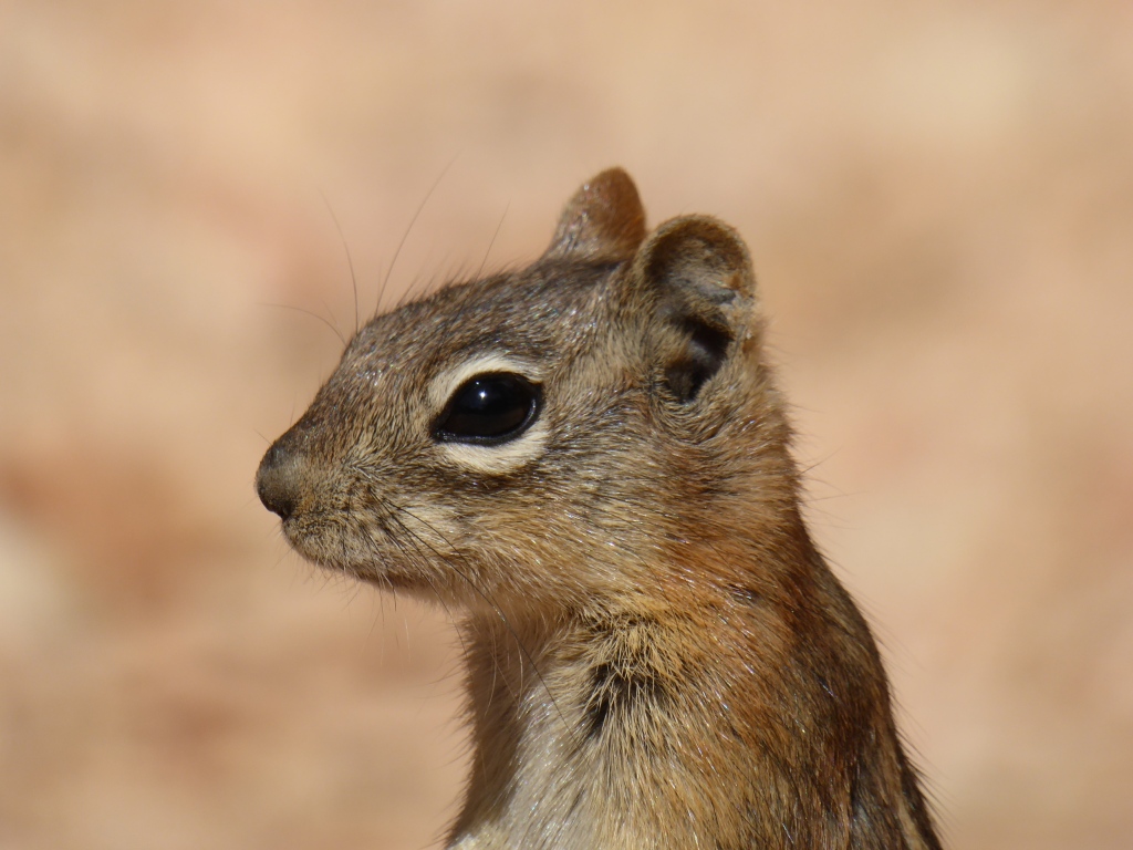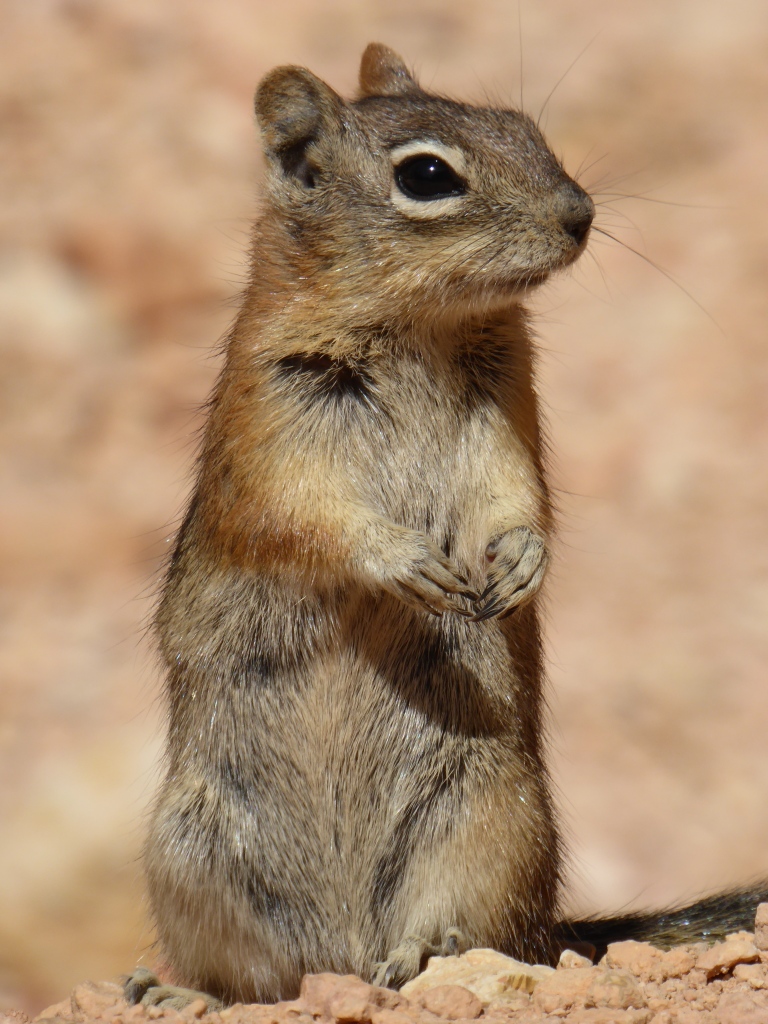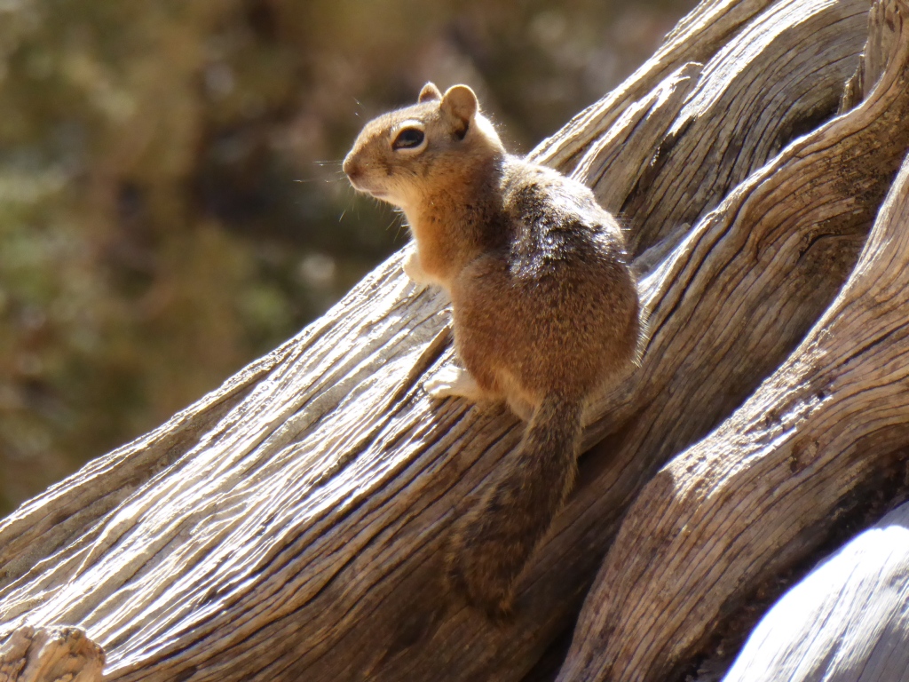Au fond du canyon, nous nous arrêtons dans une ravissante clairière, au bord d'une rivière asséchée (tout semble très sec, est-ce normal? ) pour pique-niquer. Le fait d'être au milieu d'arbres et au soleil, nous fait du bien, et nous avons bien envie de nous éterniser. Plusieurs 'chipmunks' viennent nous rendre visite pour quémander de la nourriture (que nous ne donnons pas selon les recommandations du parc...mais c'est dur! ), ils ne sont pas farouches.