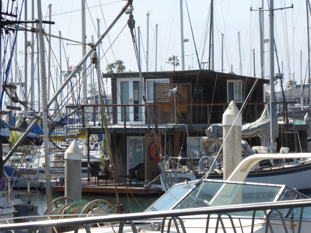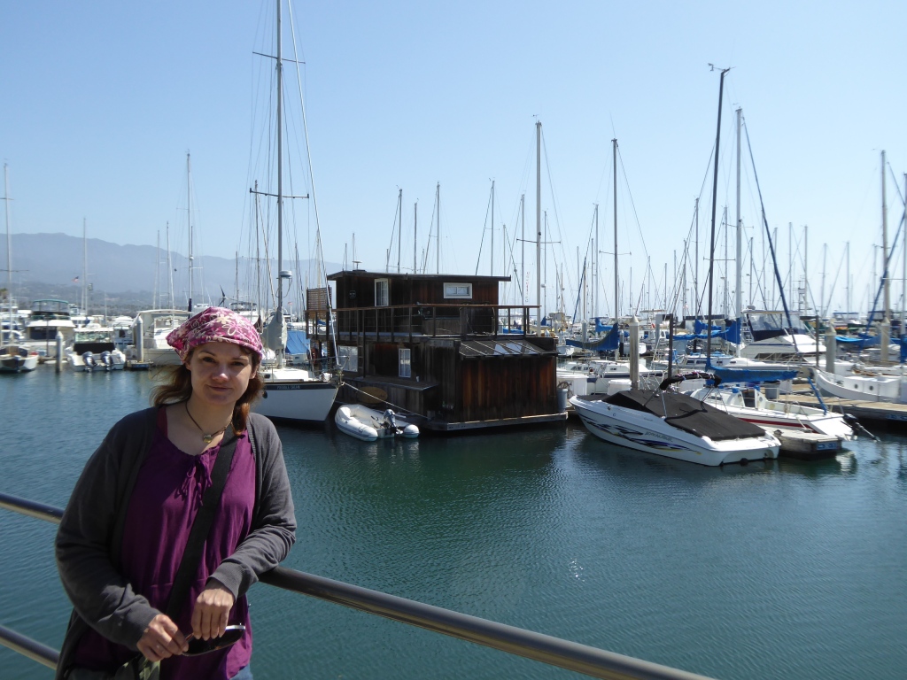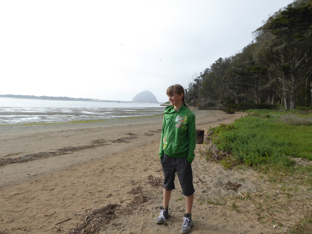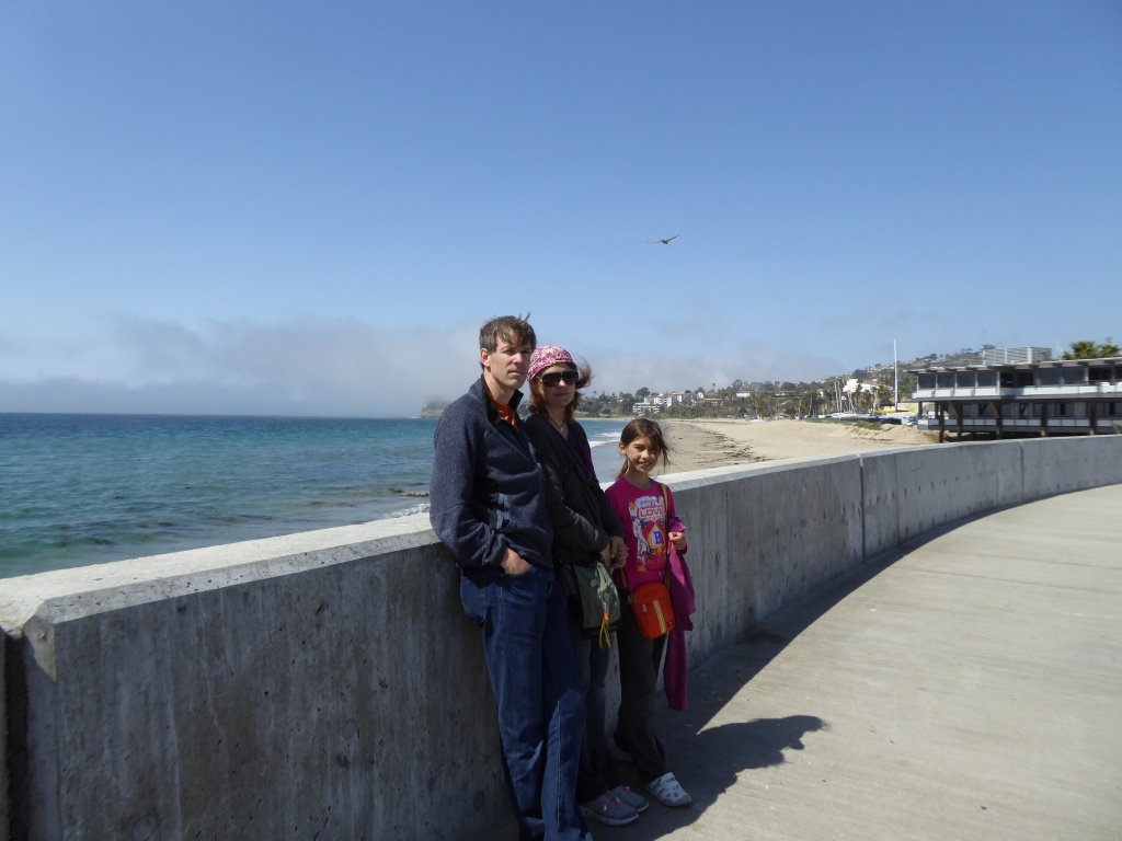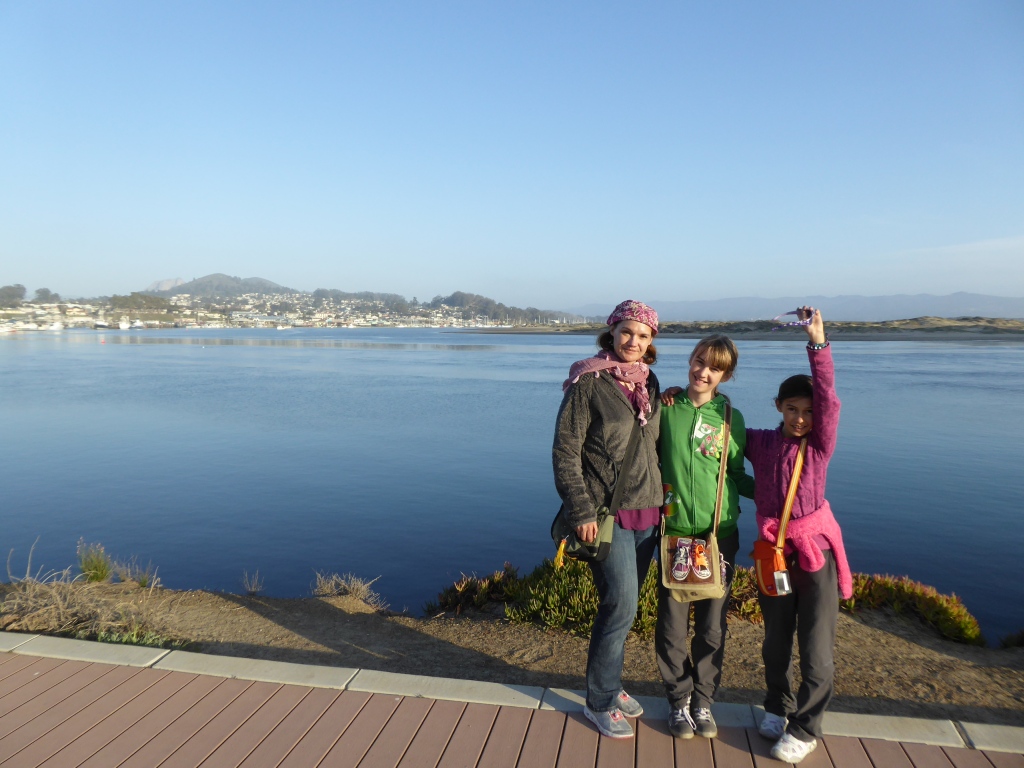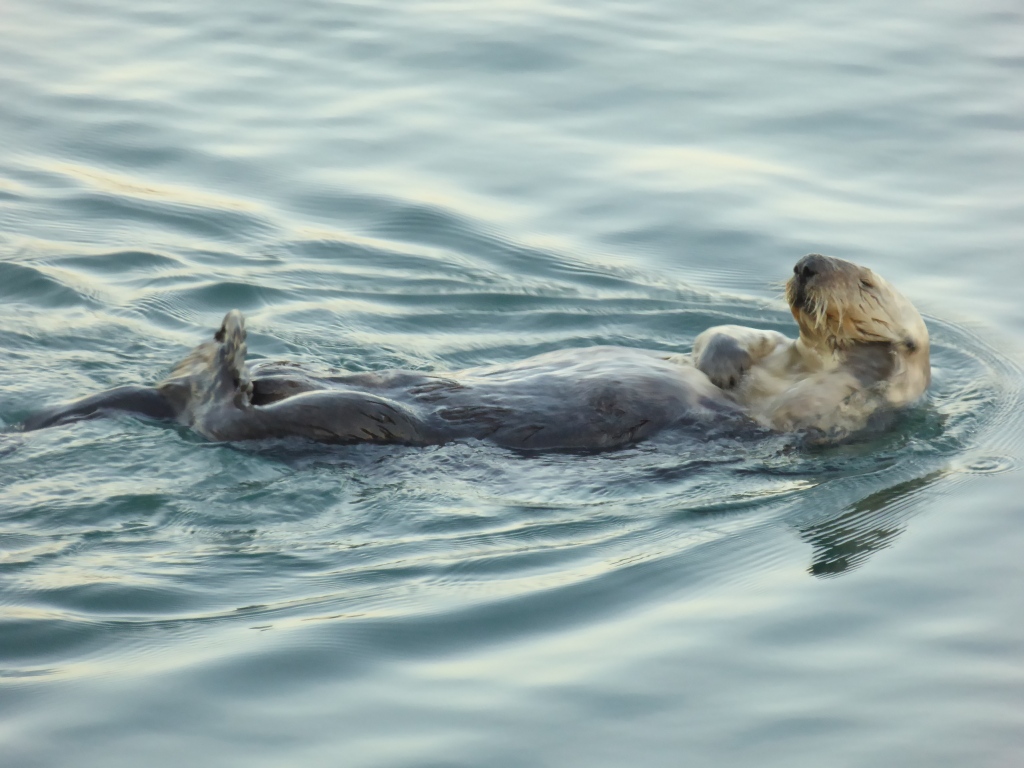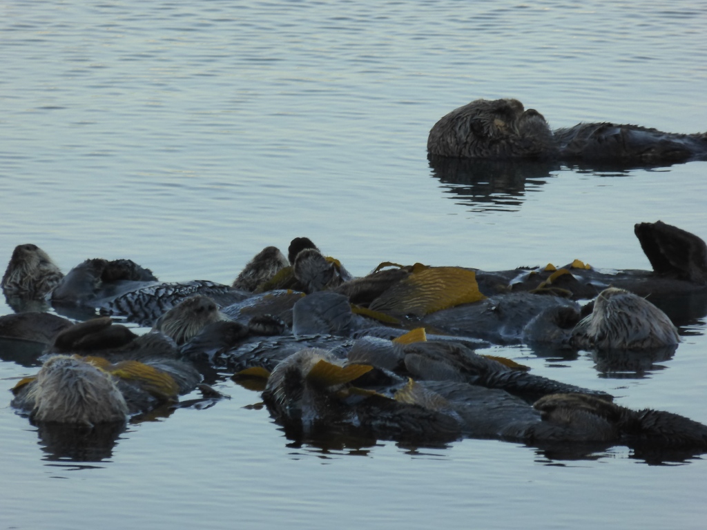 Pour l'instant, nous prenons tous le chemin du port de pêche pour visiter. C'est un des derniers ports de pêche encore actifs sur la côte californienne. Après avoir traversée la zone du port de pêche, en  suivant la rive de la baie, nous apercevons un 'nid' de loutres de mer. Ce que nous avons pris de loin pour un tas de bois flottant près du bord, est en fait, une dizaine de loutres, les unes contre les autres, qui flottent sur le dos et dorment. De temps en temps, celles qui s'éloignent, s'étirent, font quelques tonneaux, se grattouillent, et reviennent vers le groupe. Plus loin, on en voit encore qui ont l'air de se promener, en nageant nonchalamment sur le dos. Plus insaisissables sont les phoques que l'on voit de temps en temps, ils ne nagent pas en surface. Leur tête dépasse parfois de l'eau avant de replonger en nous montrant leur dos lisse. Nous croyons aussi apercevoir des lions de mer, avec une bosse sur le front...mais dans le crépuscule c'est difficile à affirmer. Lucie est particulièrement excitée par ces rencontres à distance et veut absolument compter le nombre d'animaux qu'elle a vu. De l'autre côté du bras de terre menant à Morro Rock, la grande plage orientée vers le large est occupée par quelques dizaines de surfers profitant des dernières lueurs du soleil et des vagues bien marquées.