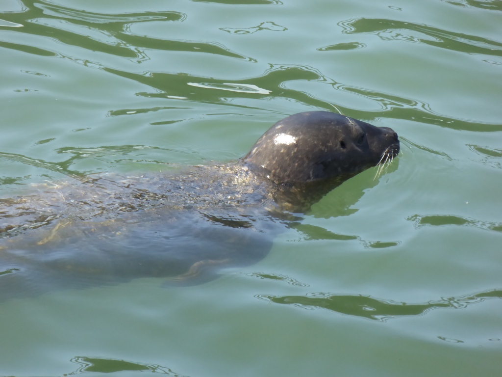 Nous longeons ensuite la plage jusqu'à un immense ponton en bois (piers). Tout au bout, nous apercevons une tête sortir de l'eau..??? Un phoque? Ça y ressemble fort. La tête observe curieusement les alentours, puis replonge paresseusement dans l'eau. Ça a l'air d'être une habituée.